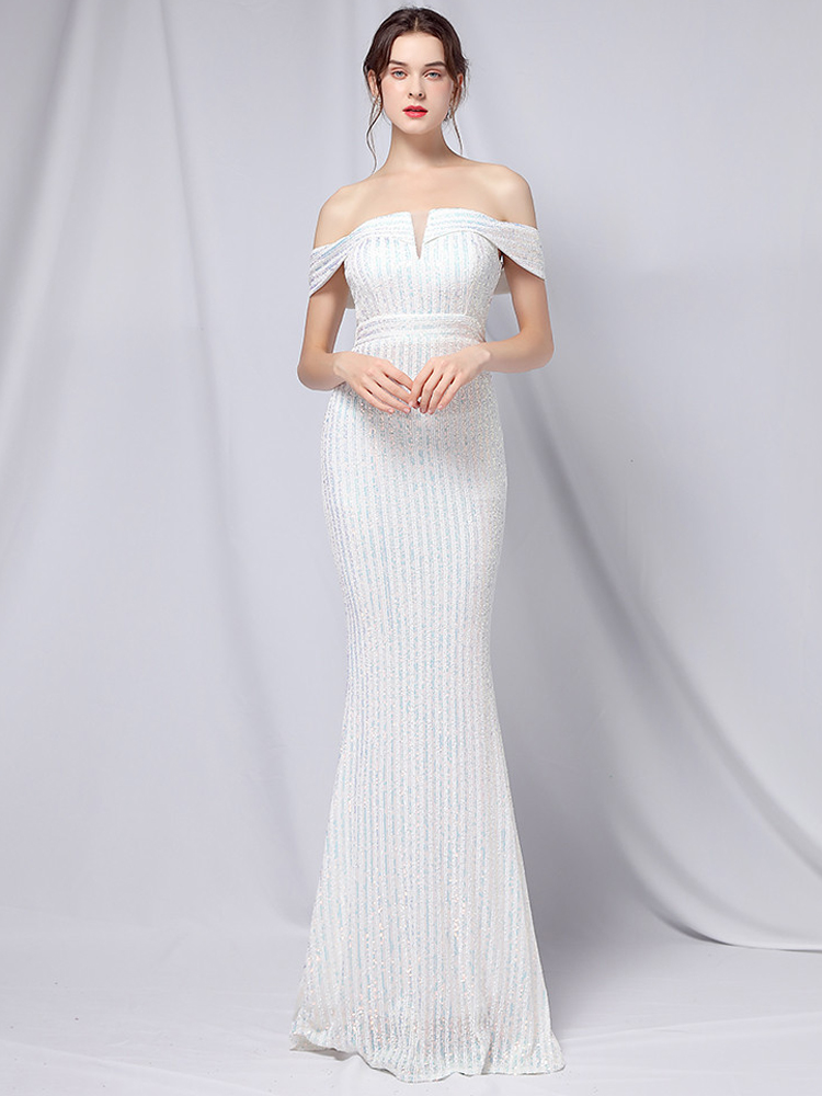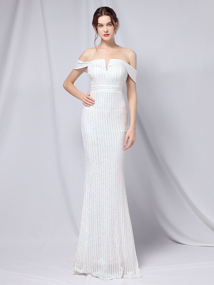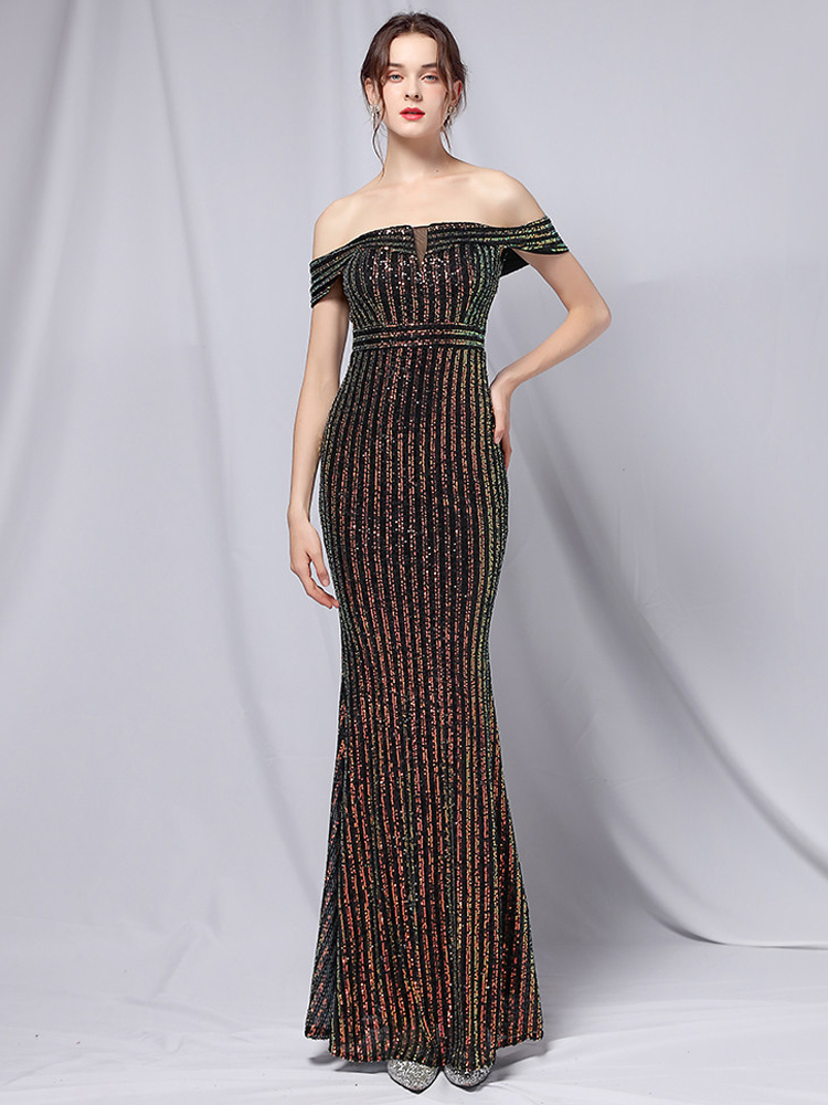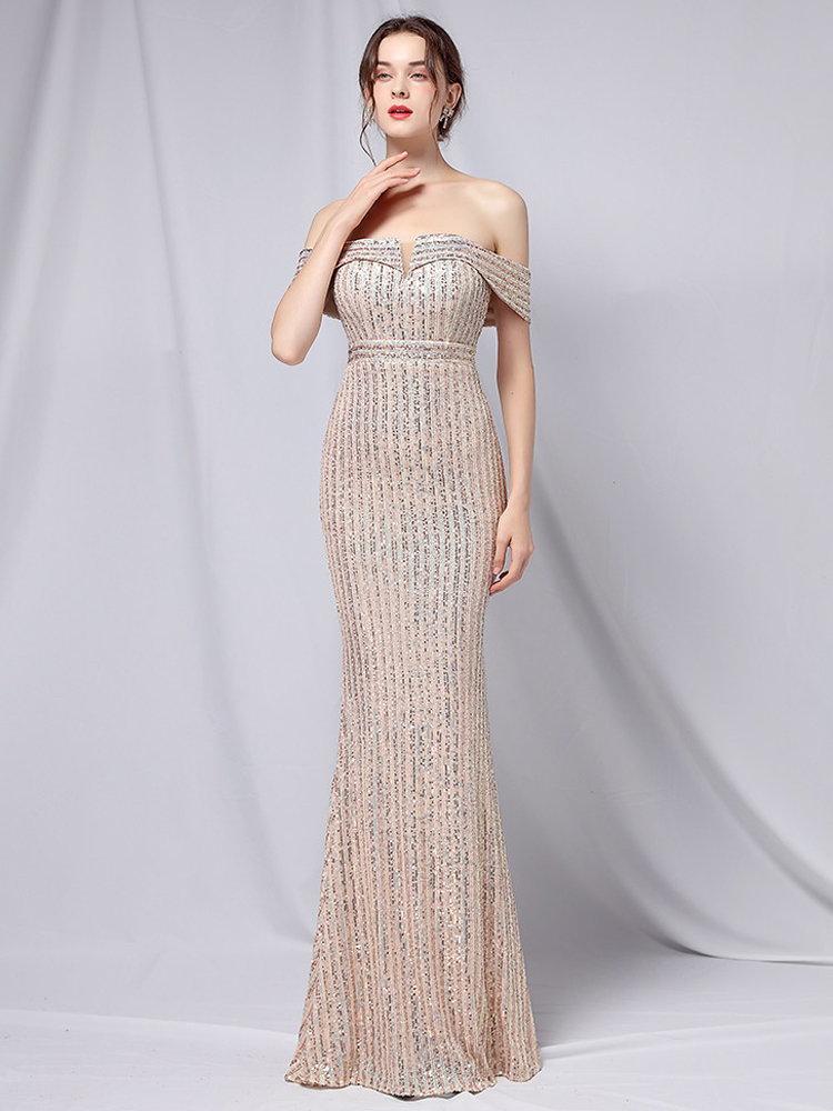 Fleepmart Elegant Off Shoulder Party Maxi Dress 2021 Boat Neck Gold Sequin Evening Dress Women Wedding Long Prom Dress