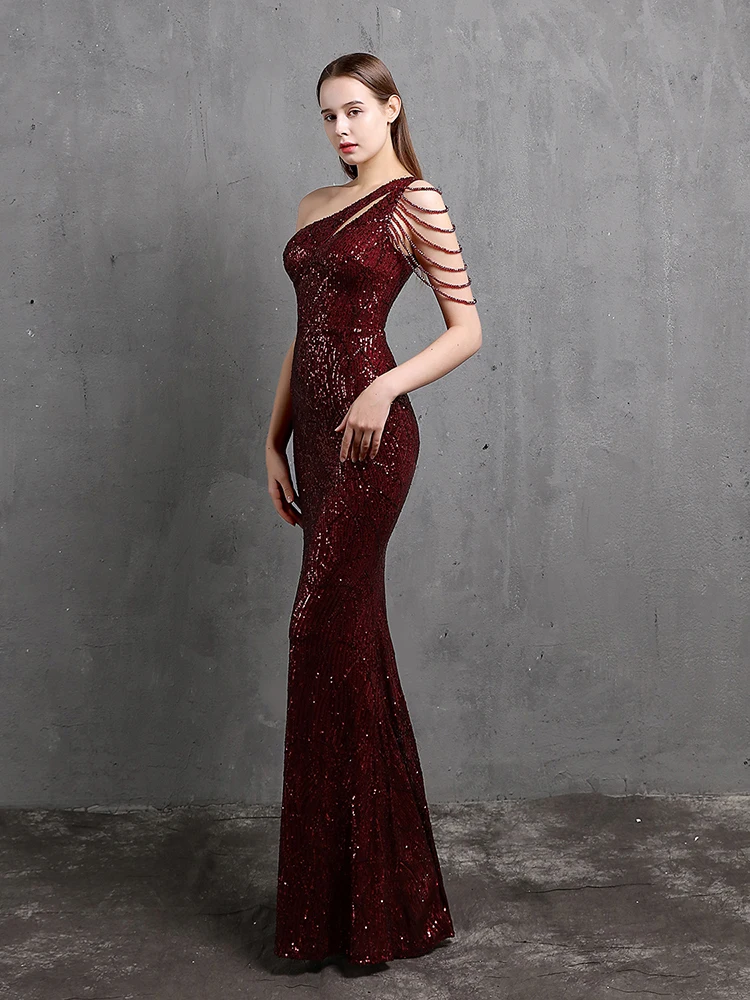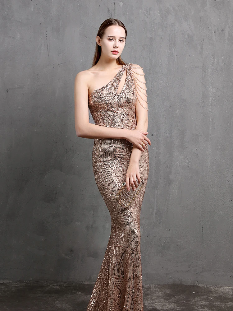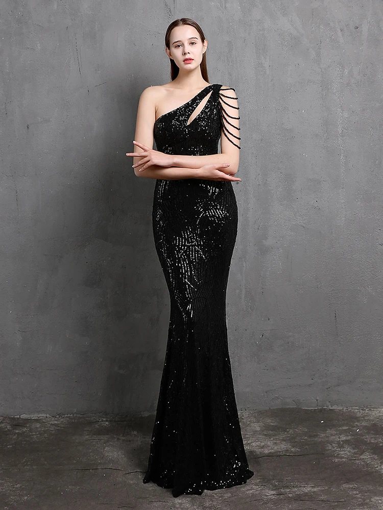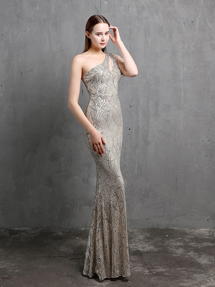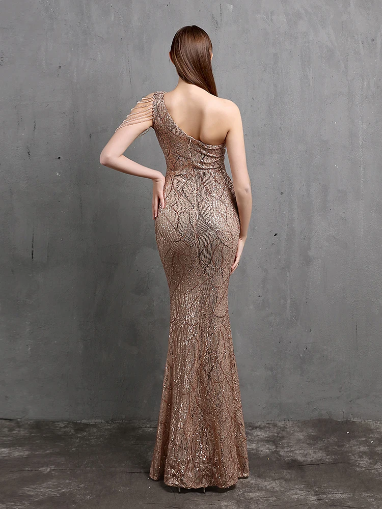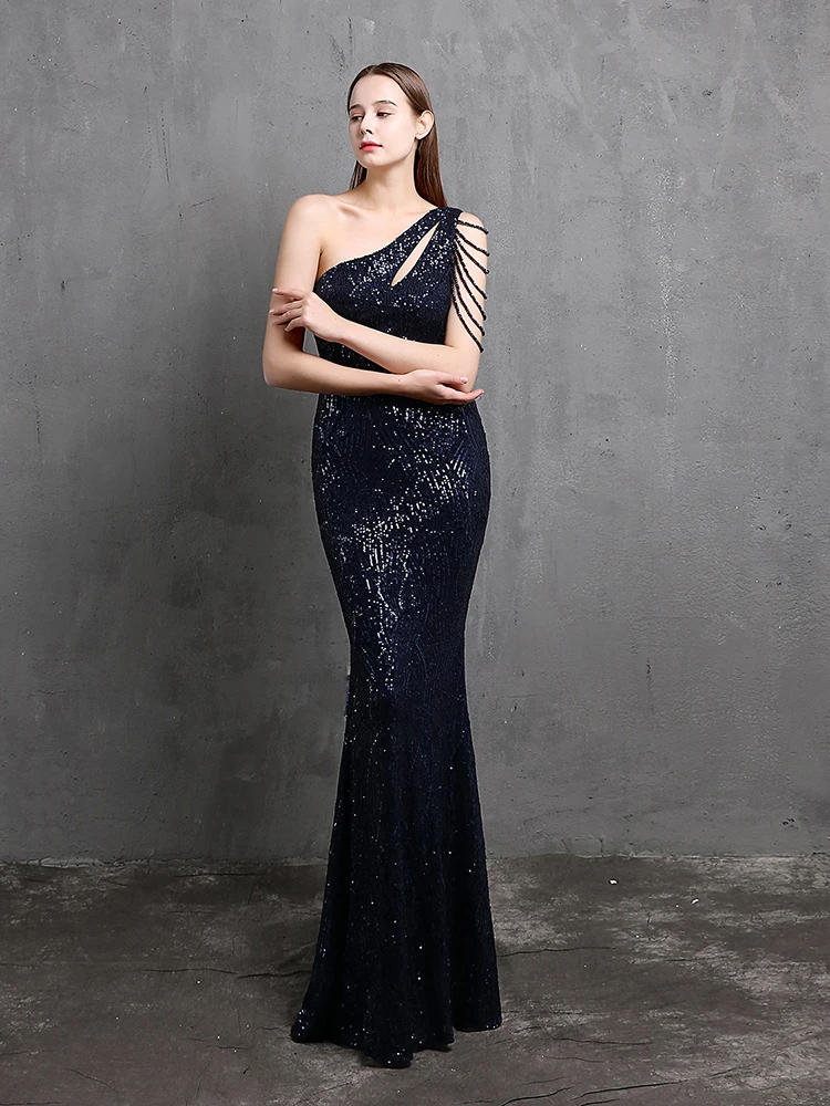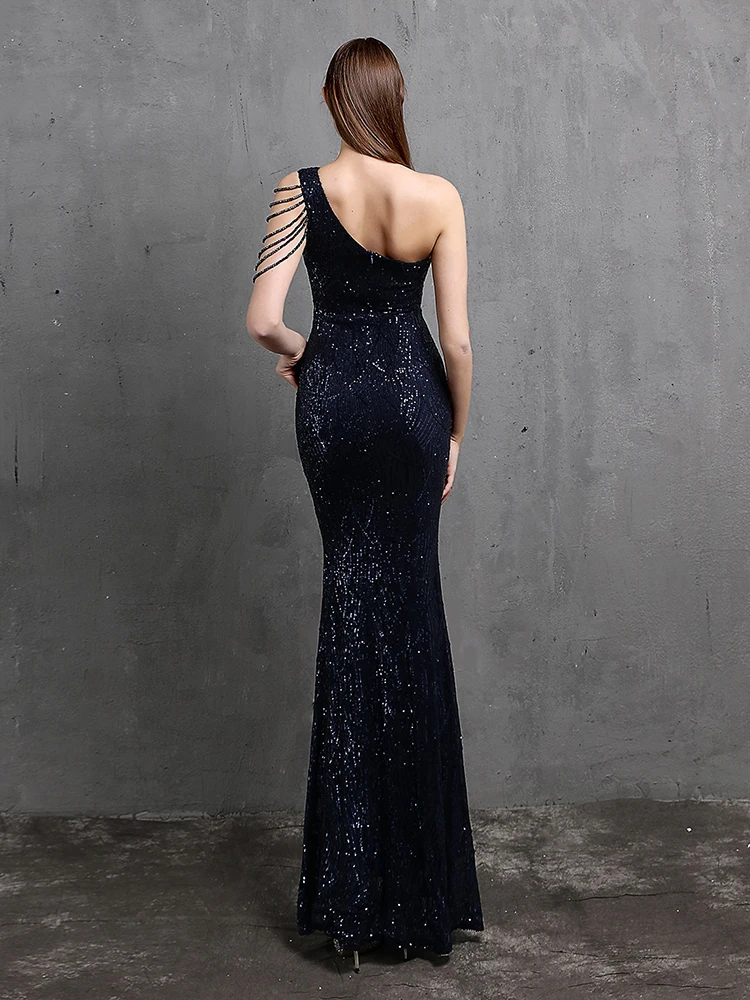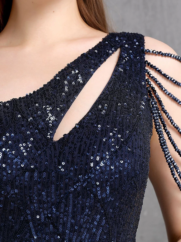 Fleepmart Elegant One Shoulder Mermaid Sequins Cocktail Party Dress Sleeveless Slim Tassels Crystal Prom Gowns Women Formal Dress Long