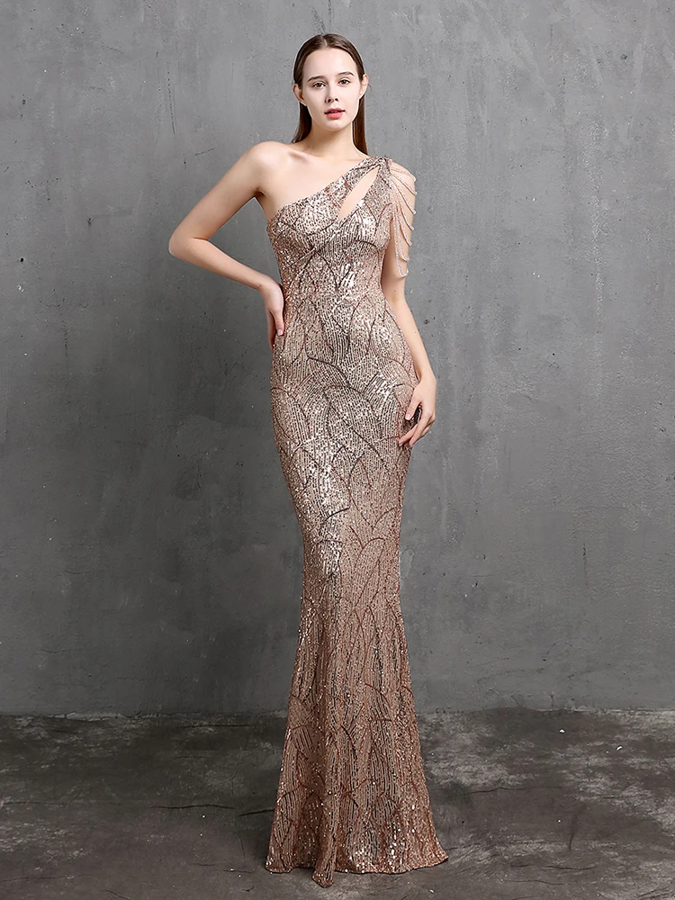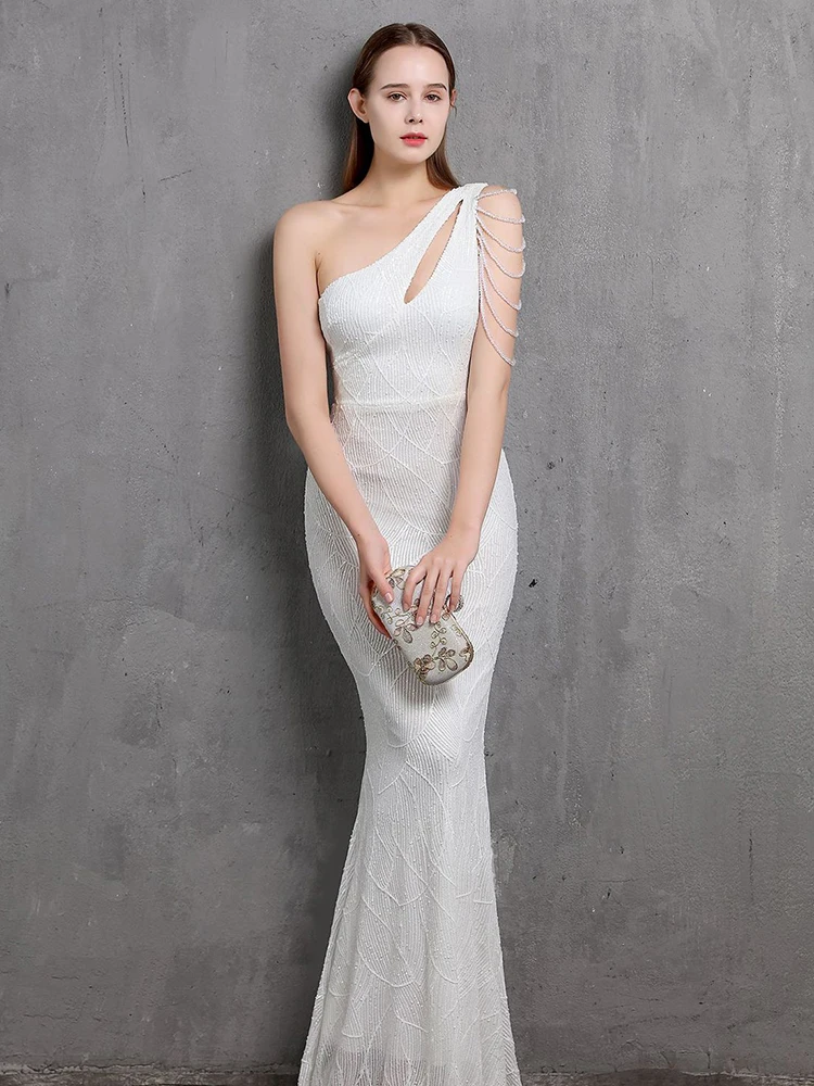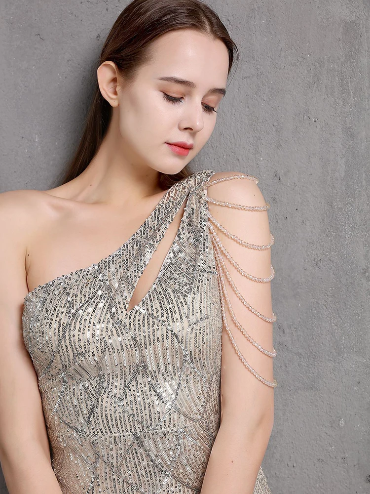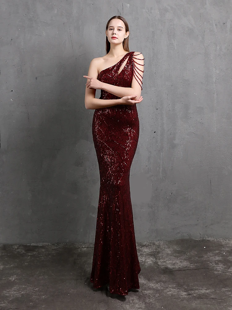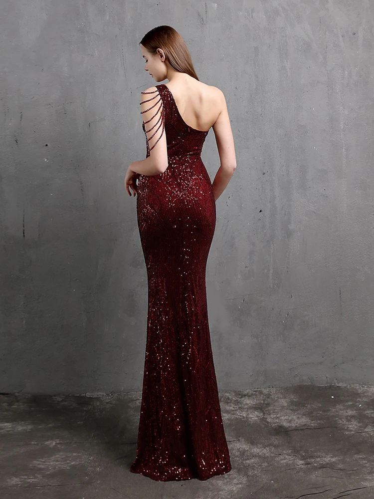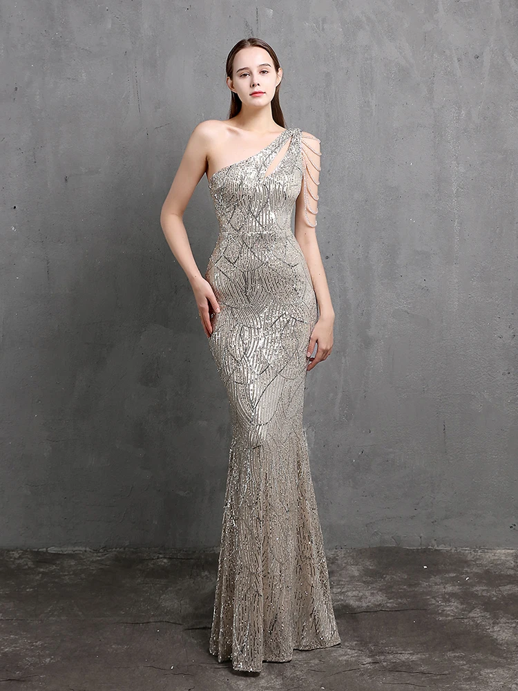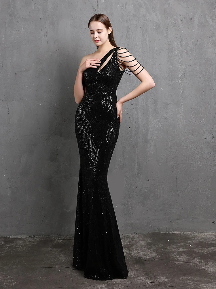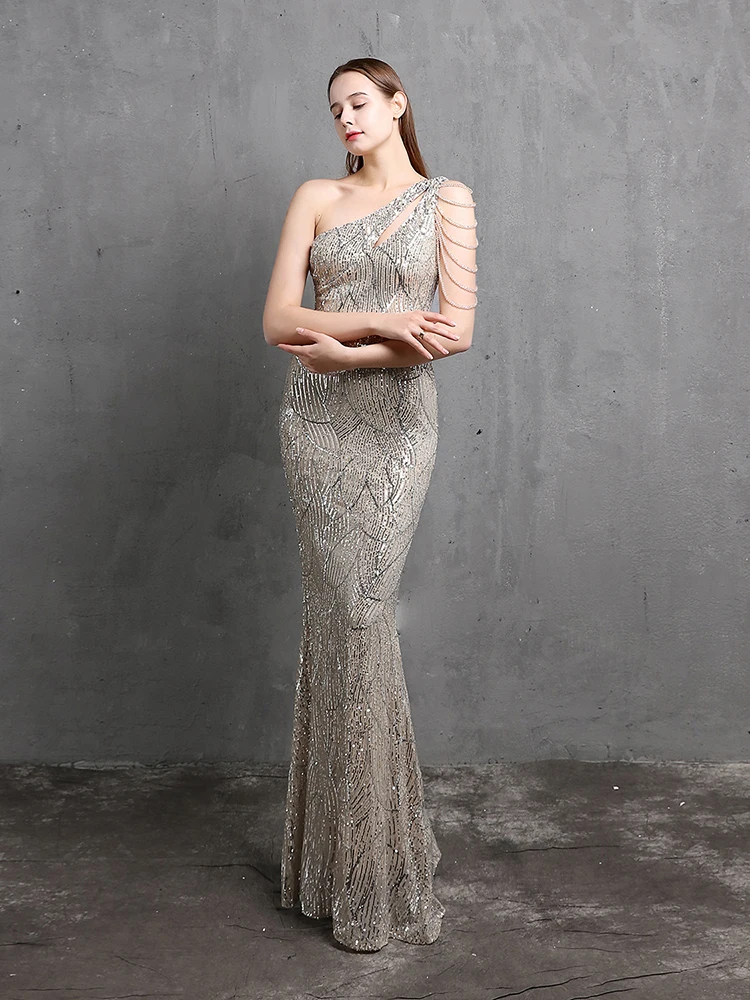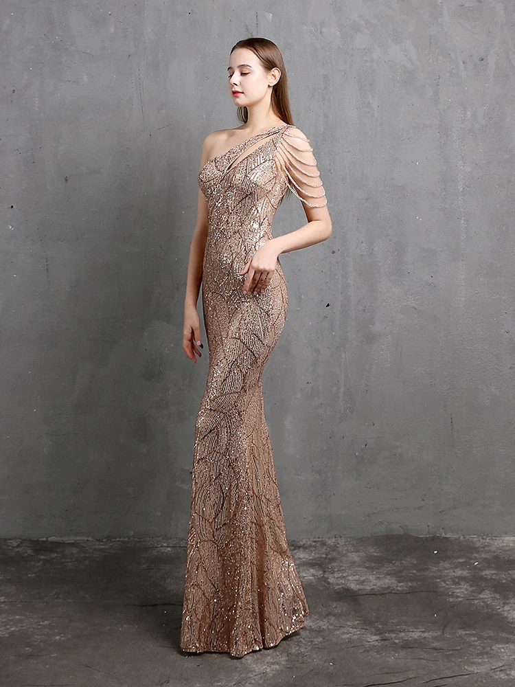 Fleepmart Elegant One Shoulder Mermaid Sequins Cocktail Party Dress Sleeveless Slim Tassels Crystal Prom Gowns Women Formal Dress Long