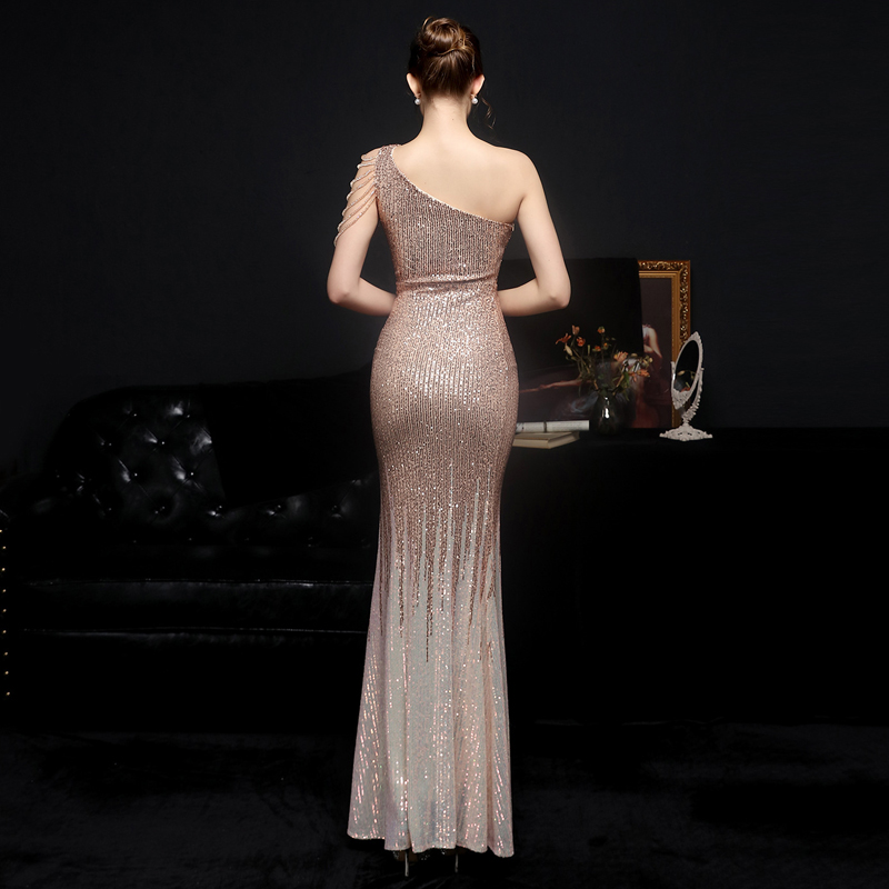 fleepmart Elegant One Shoulder Slit Gold Sequin Evening Dress 2022 Women Beads Party Maxi Dress