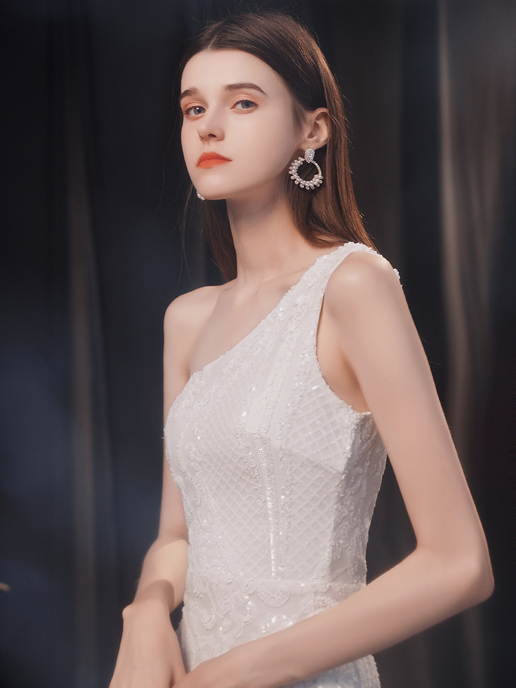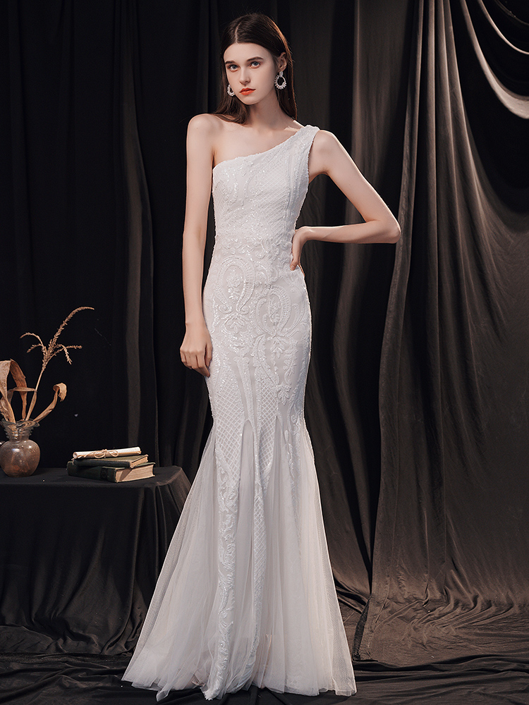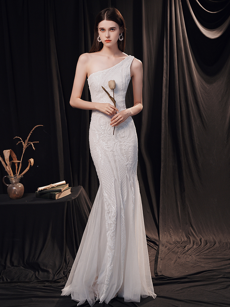 Fleepmart Elegant One Shoulder White Long Sequin Evening Dress 2021 New Women Party Dress Wedding Wear