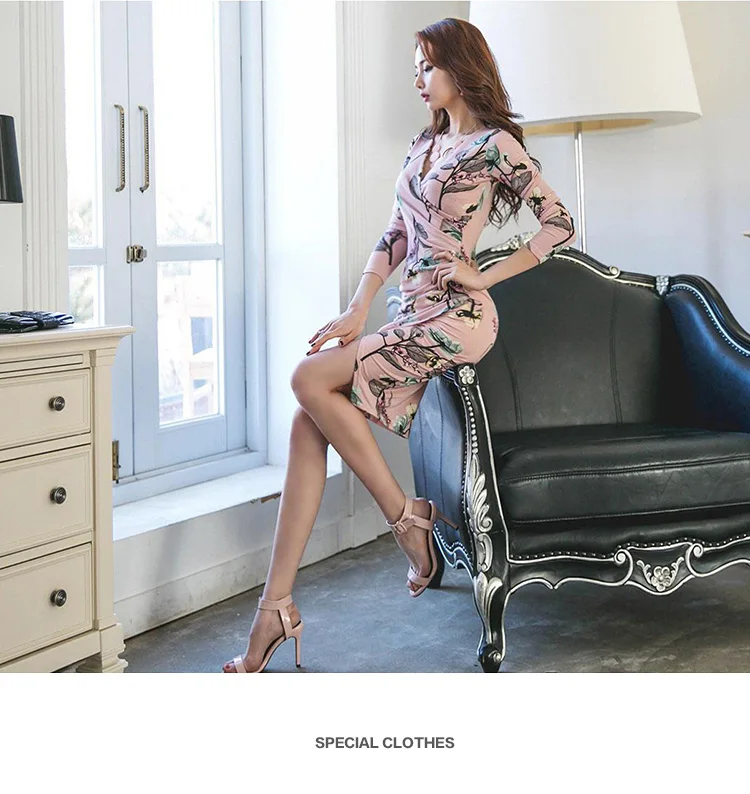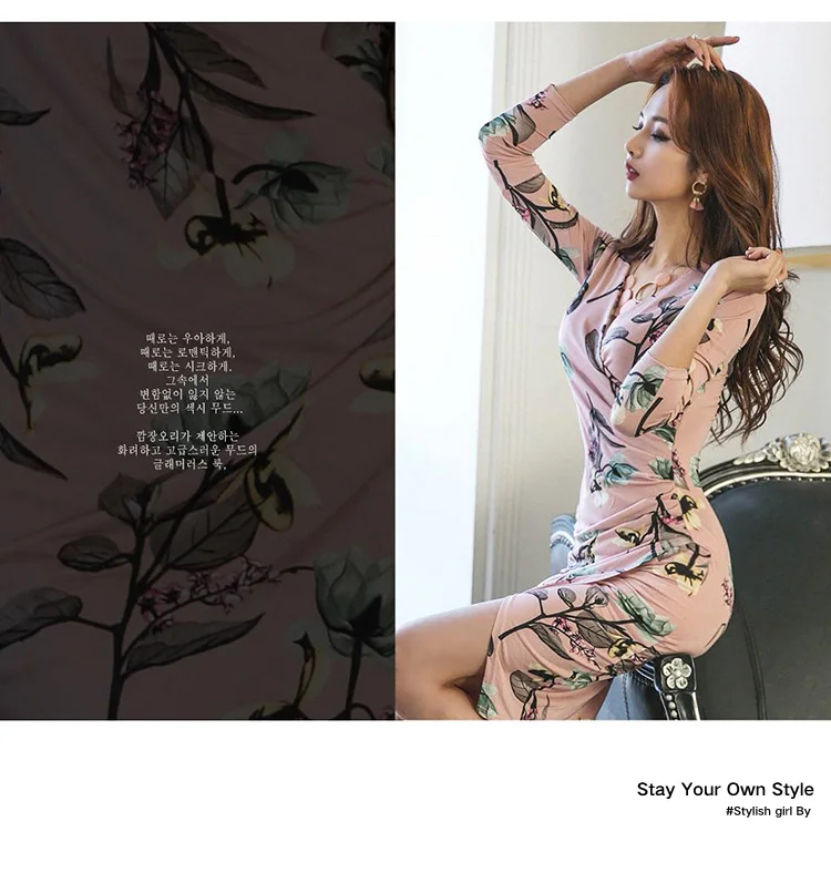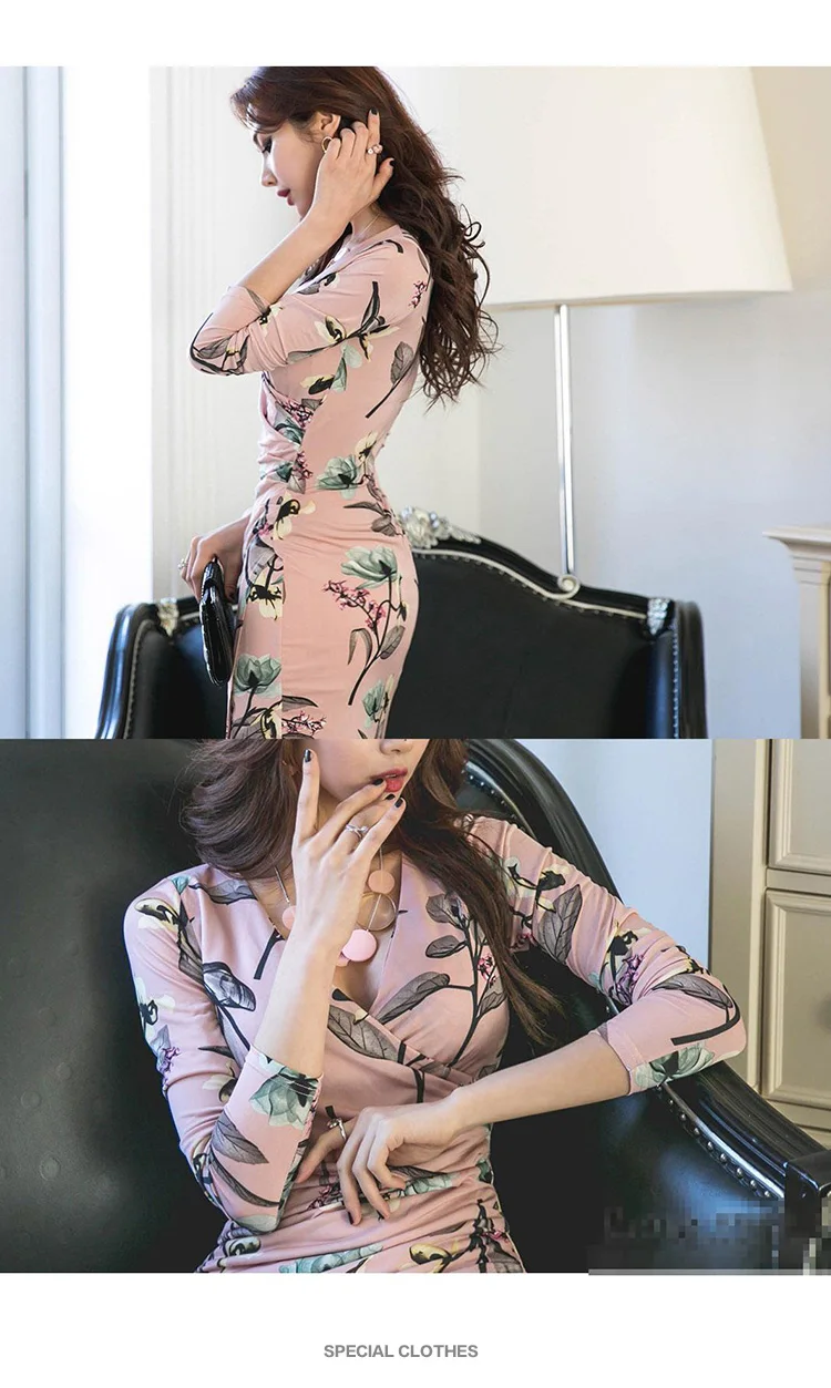 Fleepmart Elegant Pink Print V-neck 3/4 Sleeve Slit Dress Spring 2024 Korean Women Fashion Slim Bodycon Temperament Office Lady Work DressFleepmart Elegant Pink Print V-neck 3/4 Sleeve Slit Dress Spring 2024 Korean Women Fashion Slim Bodycon Temperament Office Lady Work Dress