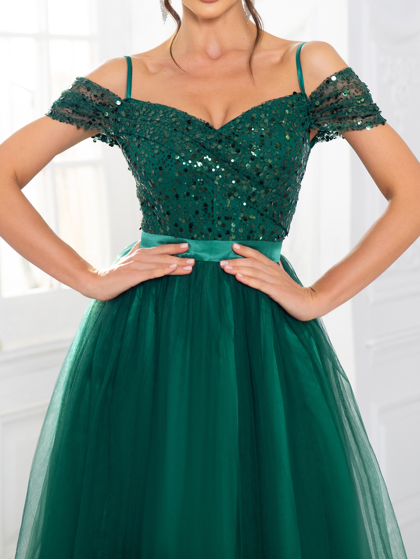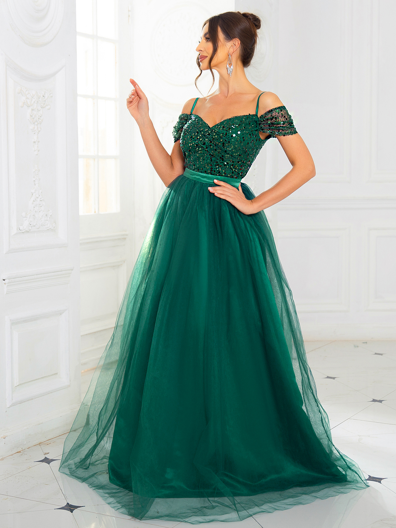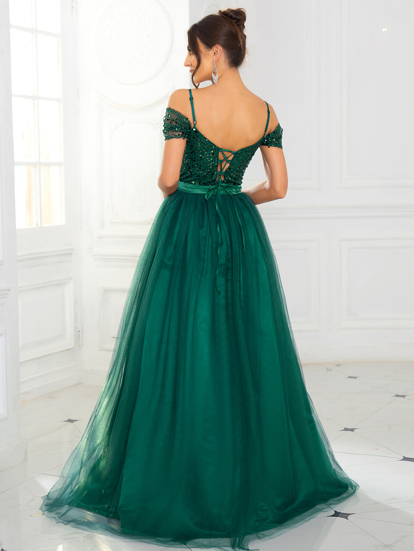 Fleepmart Elegant Sequined Maxi Dress Mesh Skirt A Line Off the shoulder Backless Lace Up Prom Ball Gown for Women
