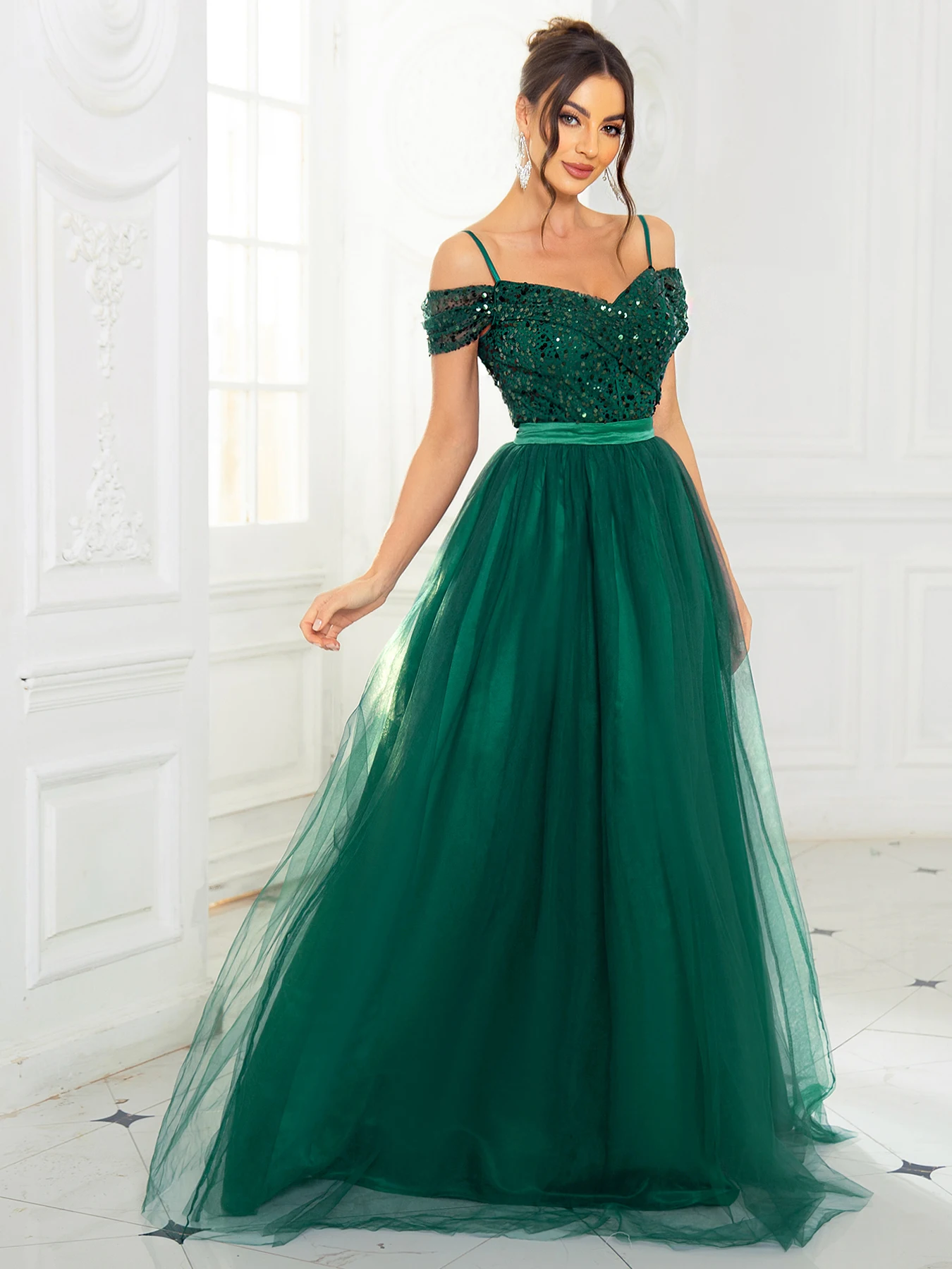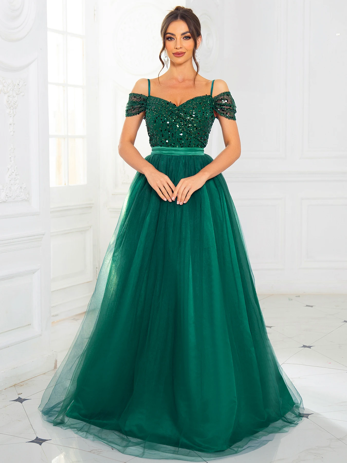 Fleepmart Elegant Sequined Maxi Dress Mesh Skirt A Line Off the shoulder Backless Lace Up Prom Ball Gown for Women