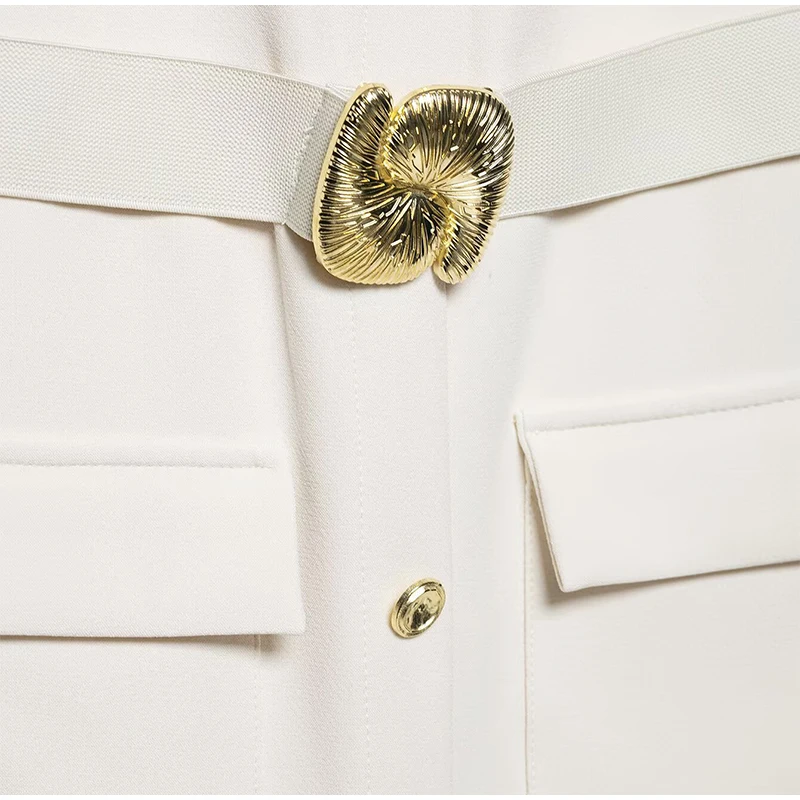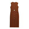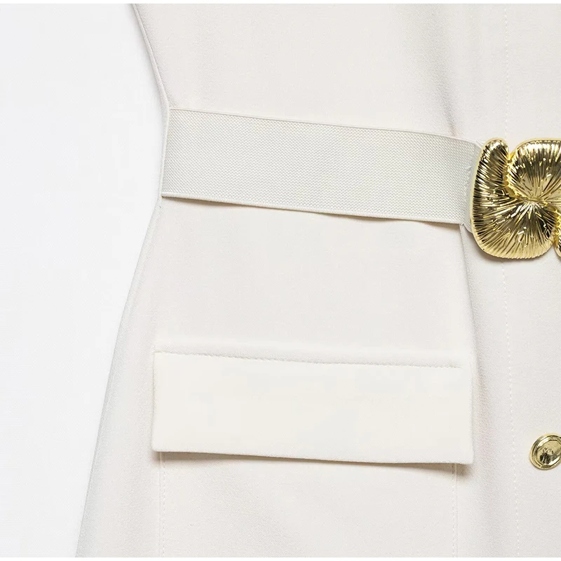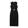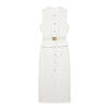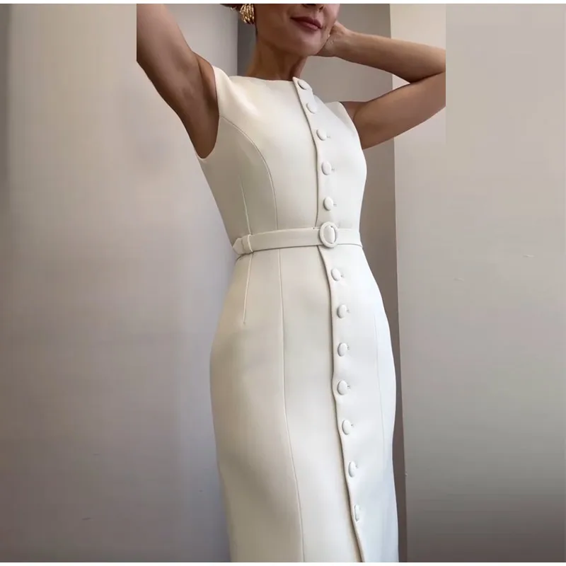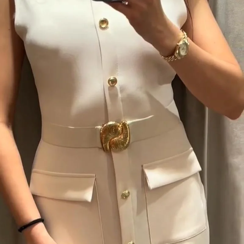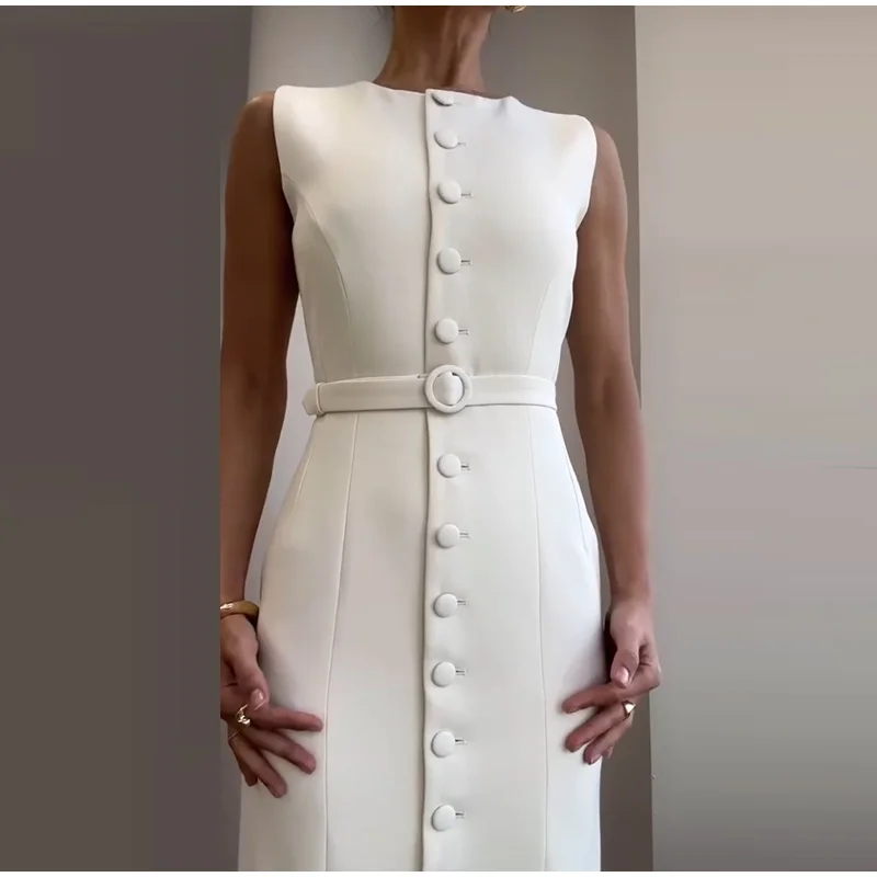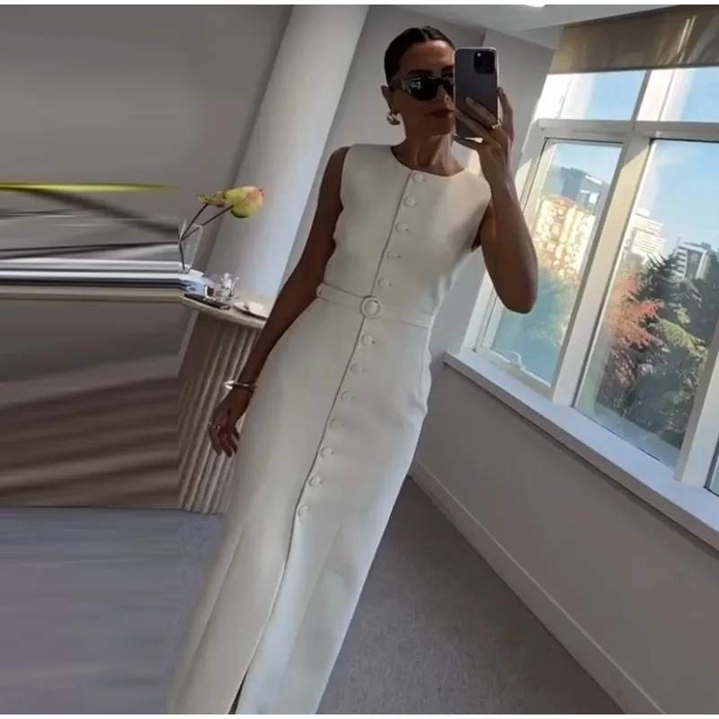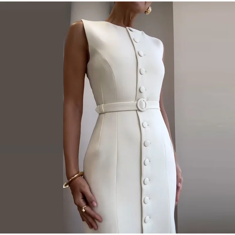 Fleepmart Elegant Single Breasted Tank Dress Women Belts Sleeveless O-neck Slim Solid 2025 Spring Dresses Commute Street Split Lady Robe