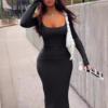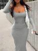 Fleepmart Elegant Solid Slim Basic Maxi Dresses Fashion Women Square Neck Autumn Long Sleeve Bodycon Casual Office Lady Streetwear Robe