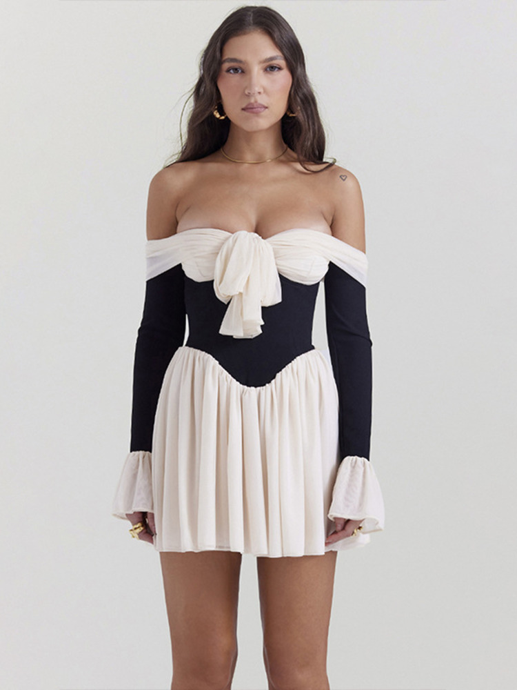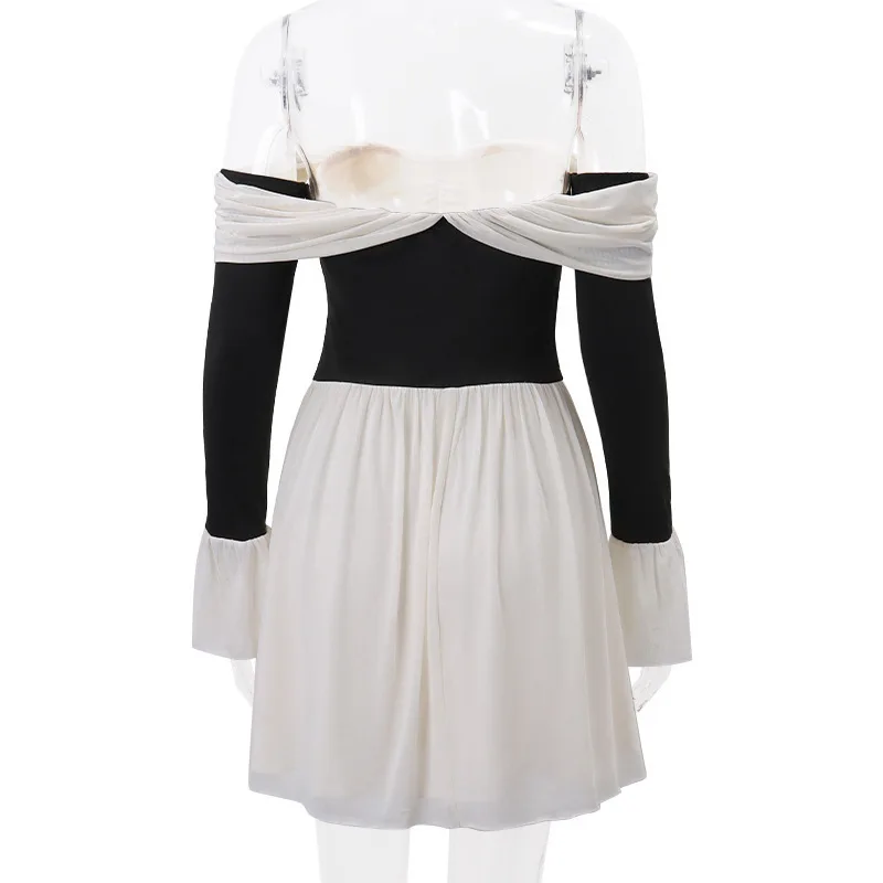 Fleepmart Elegant Strapless Sexy Mini Women New Off-shoulder Long Flare Sleeve Pleated Club Party Dress