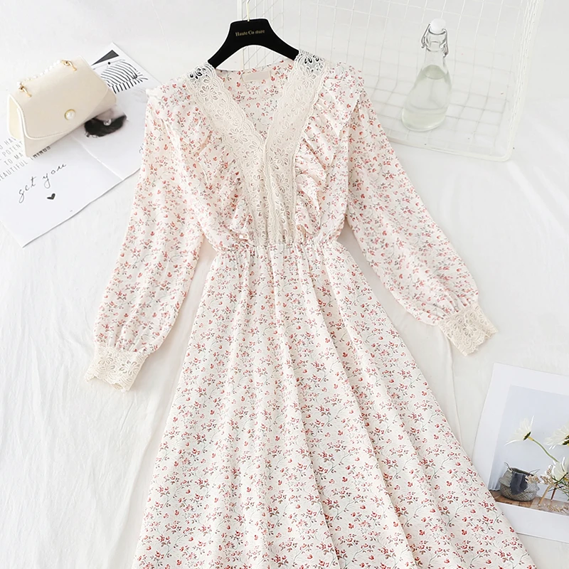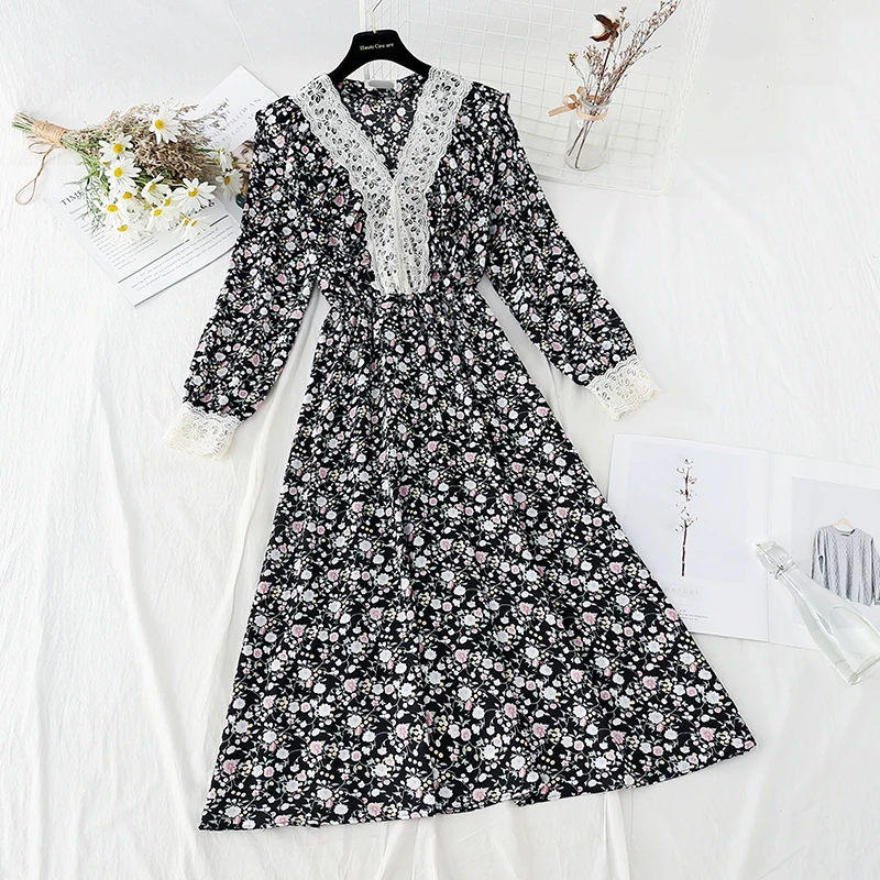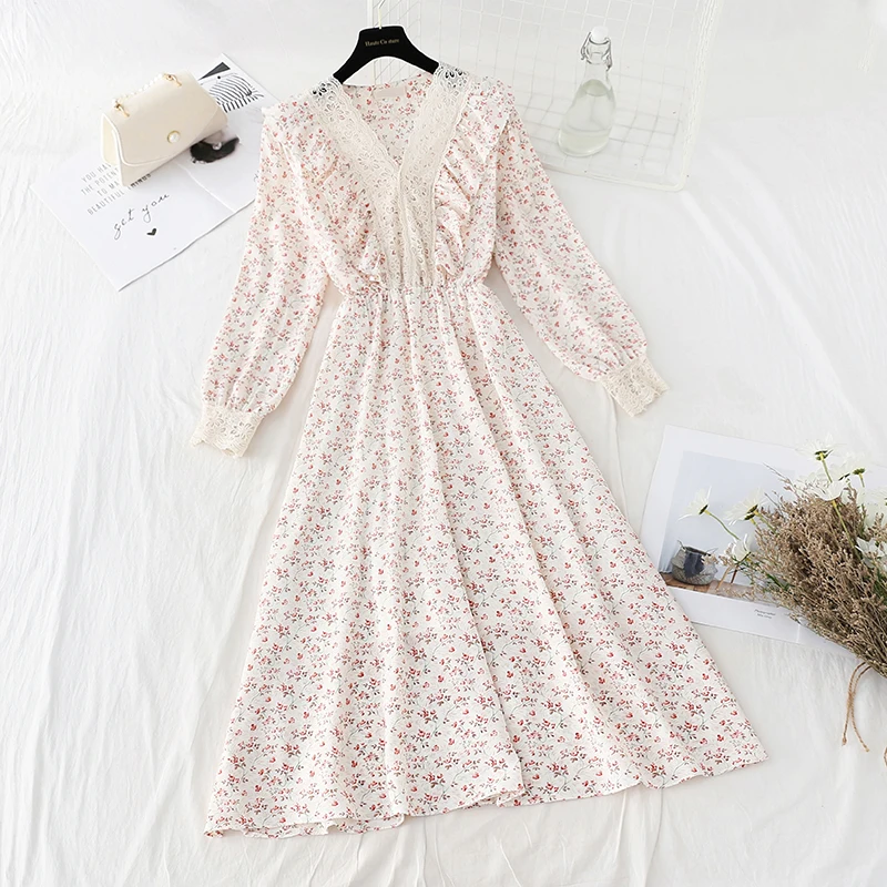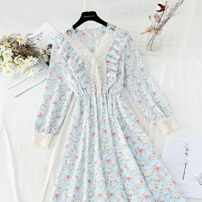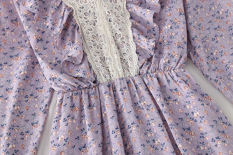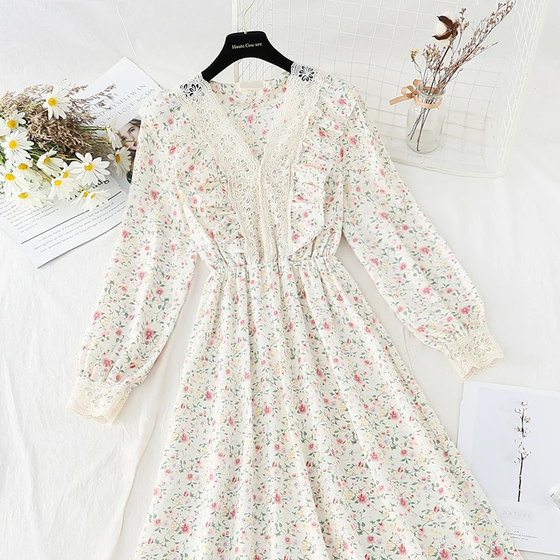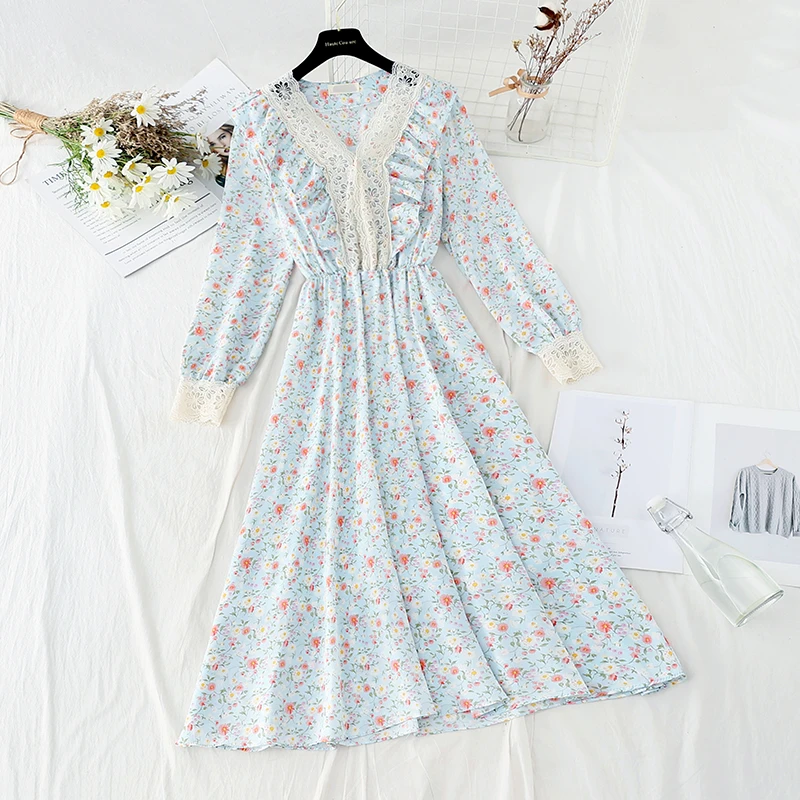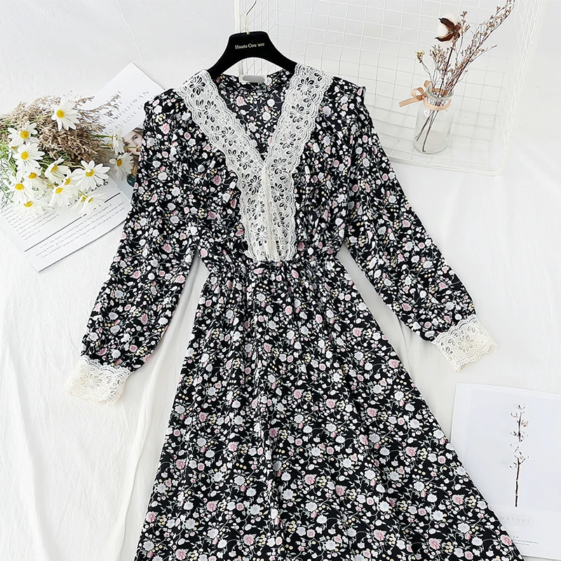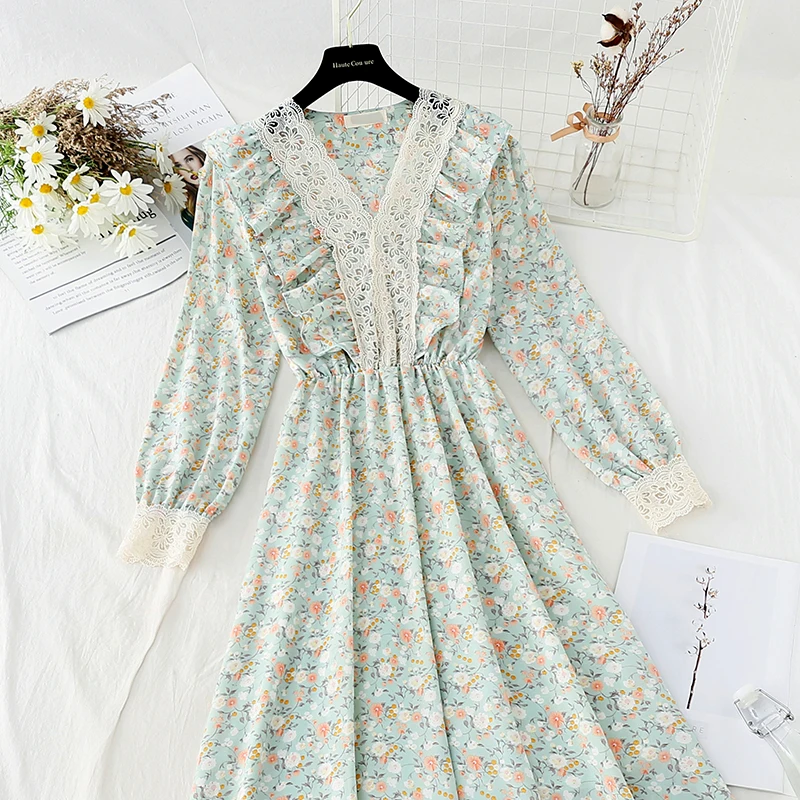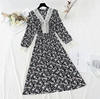 Fleepmart Elegant V-neck Chiffon Midi Dress Women Lace Stitching Slim Floral Dress Party Vestidos Spring Summer A-line Dresses 2021