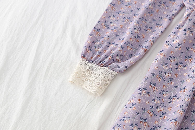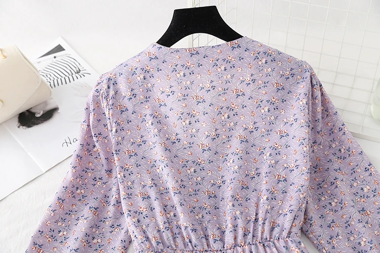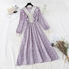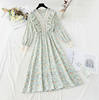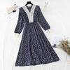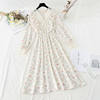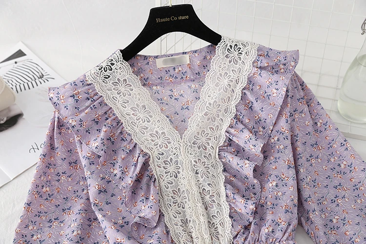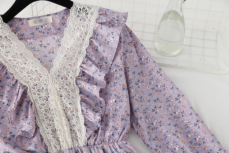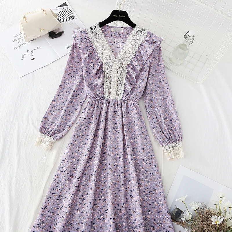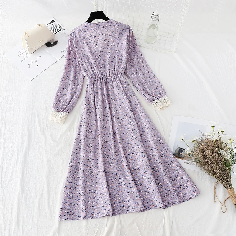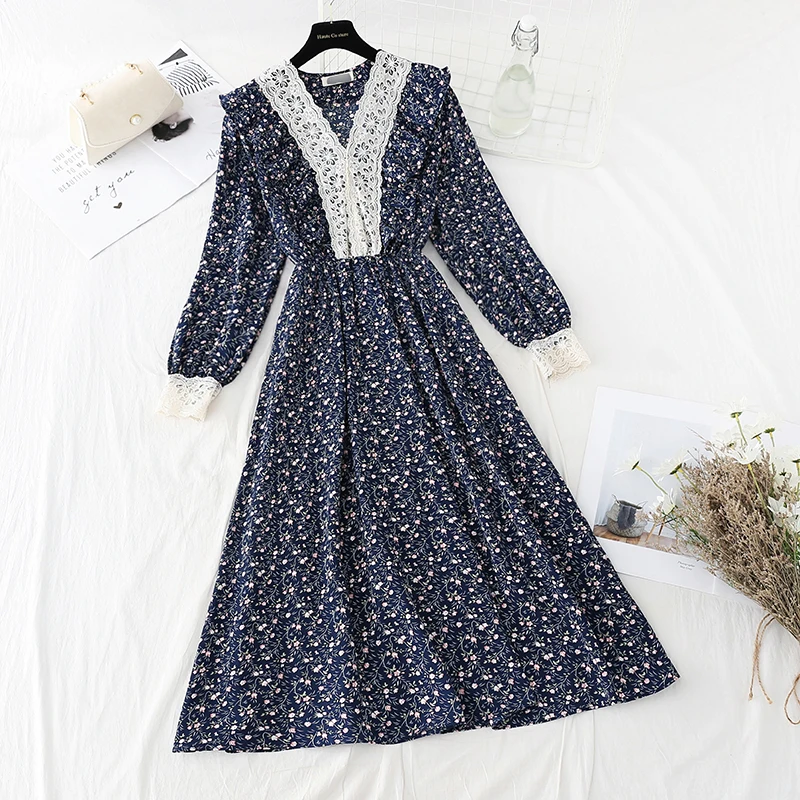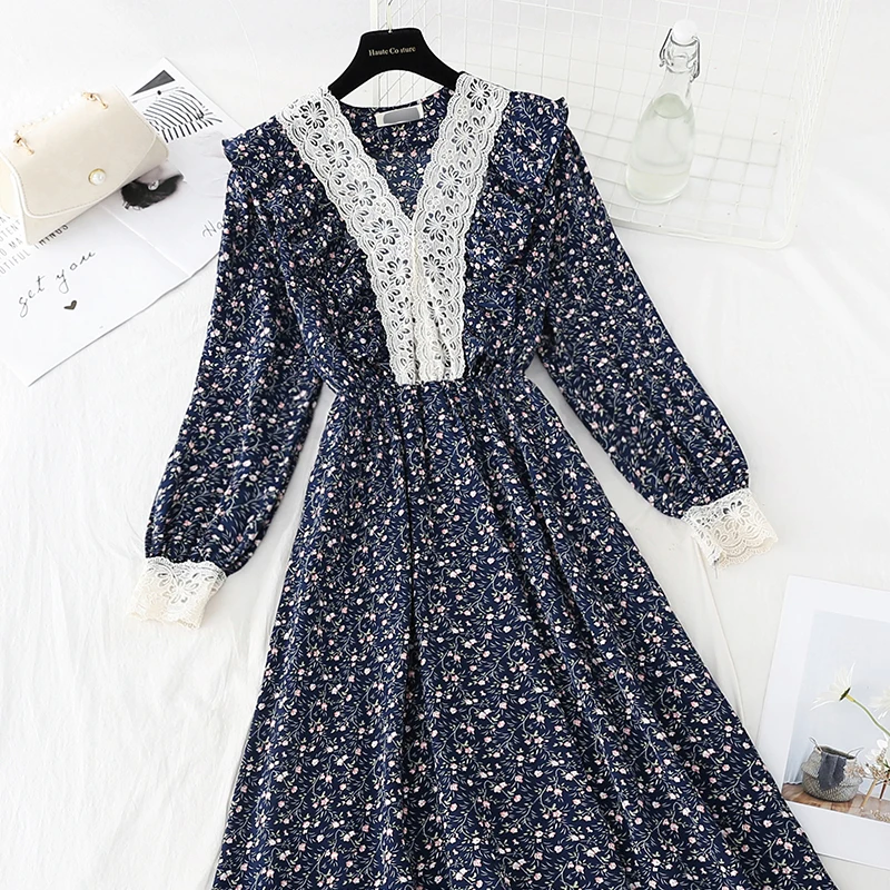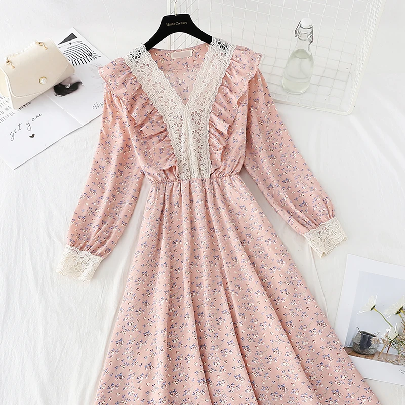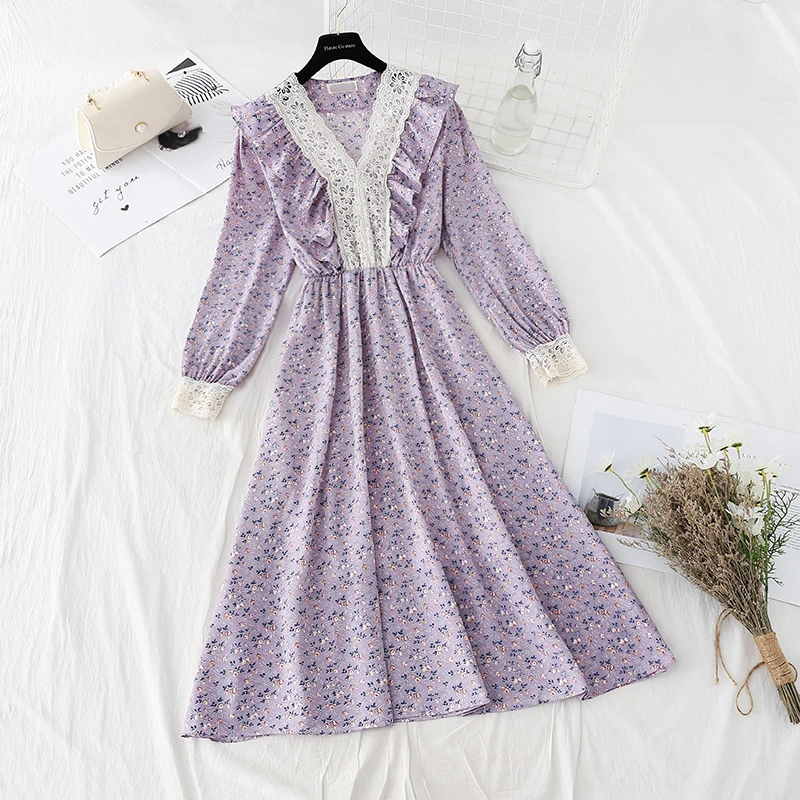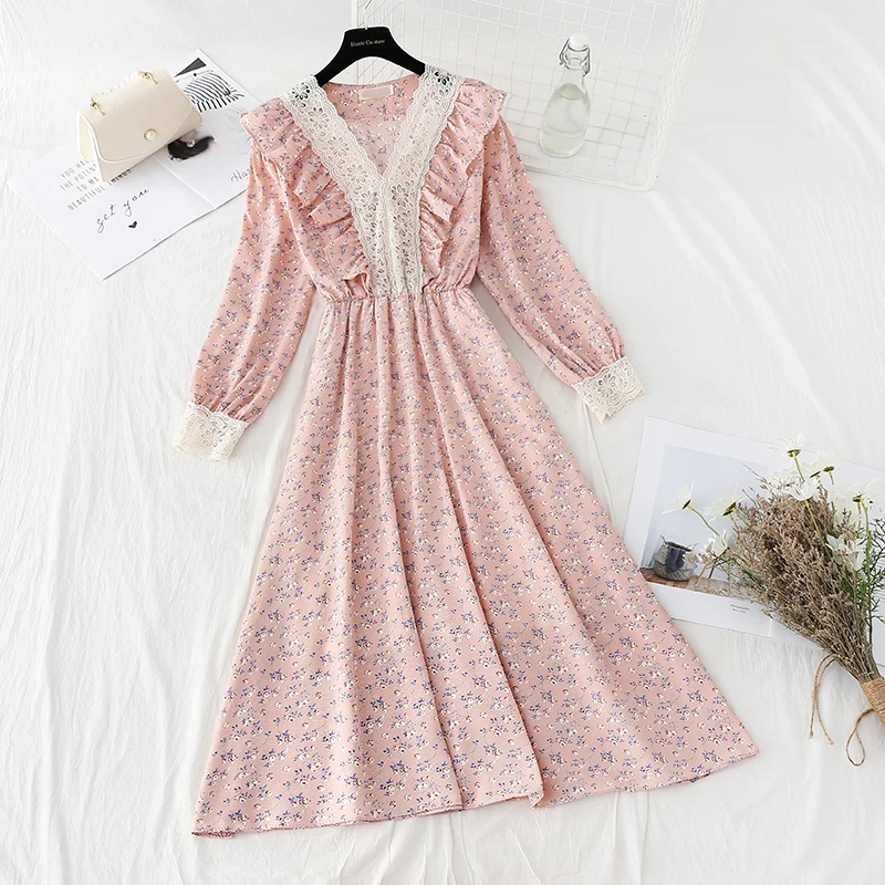Fleepmart Elegant V-neck Chiffon Midi Dress Women Lace Stitching Slim Floral Dress Party Vestidos Spring Summer A-line Dresses 2021