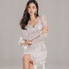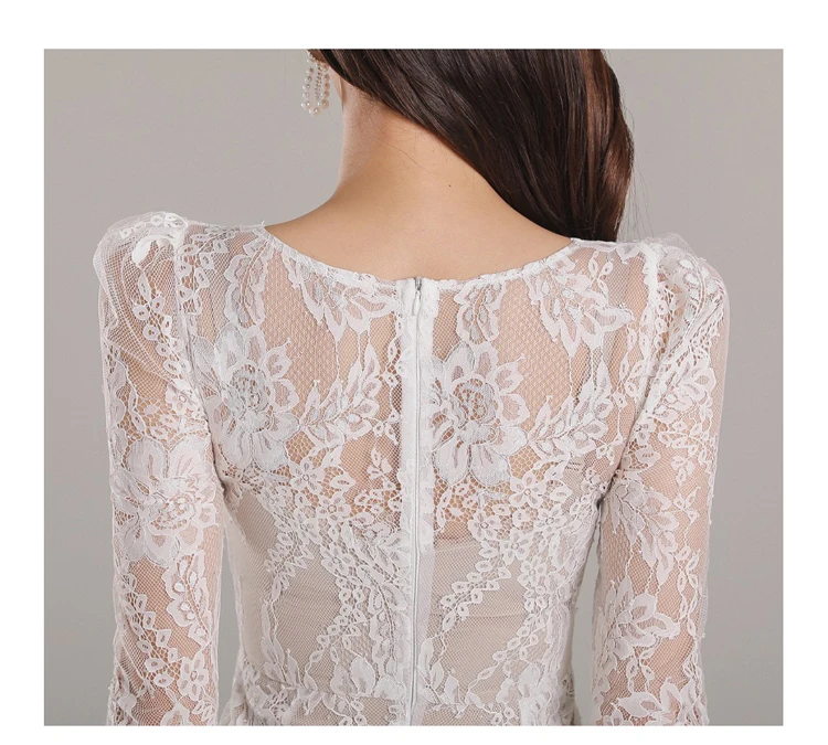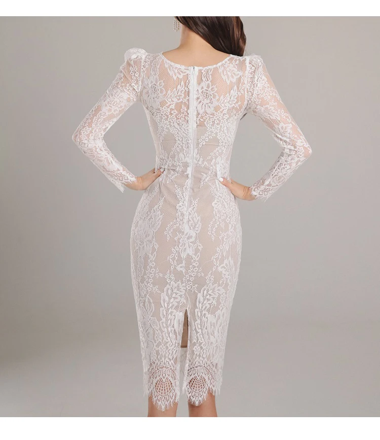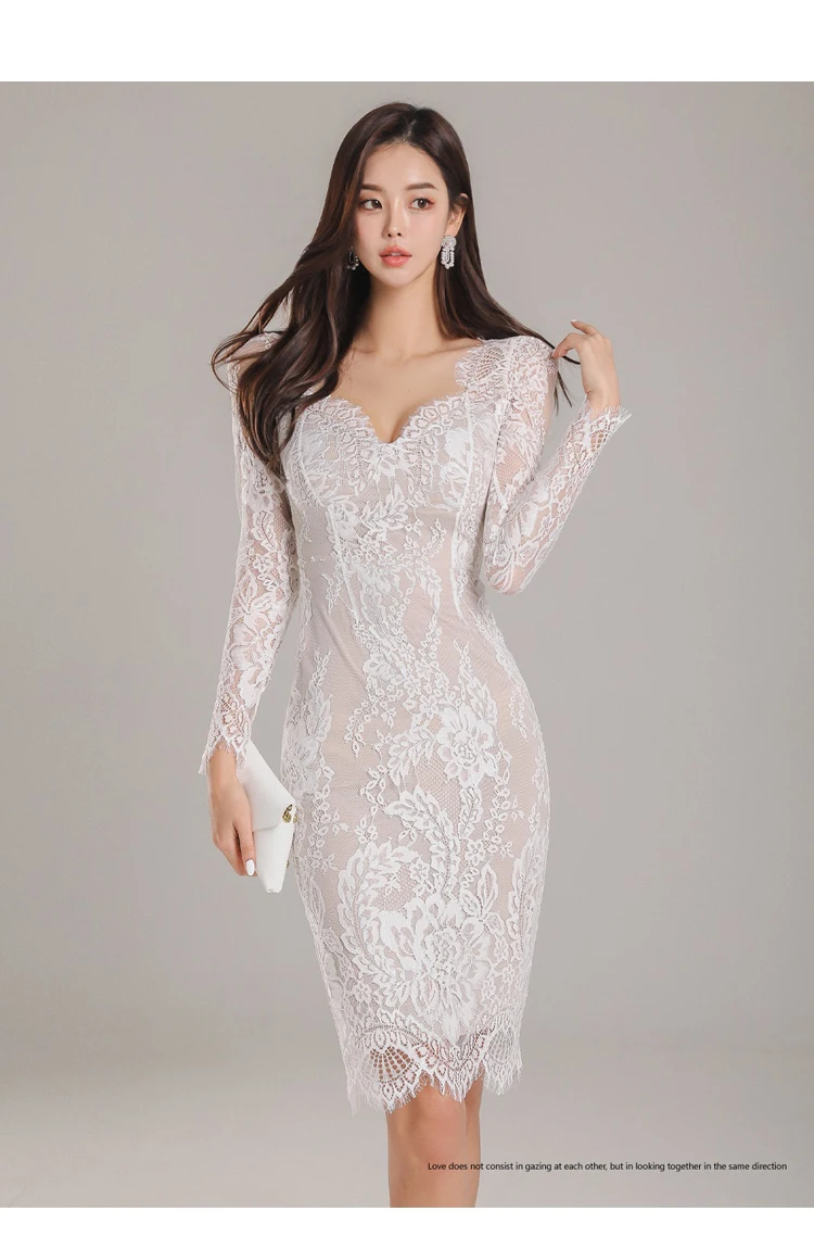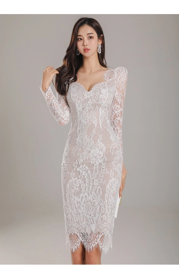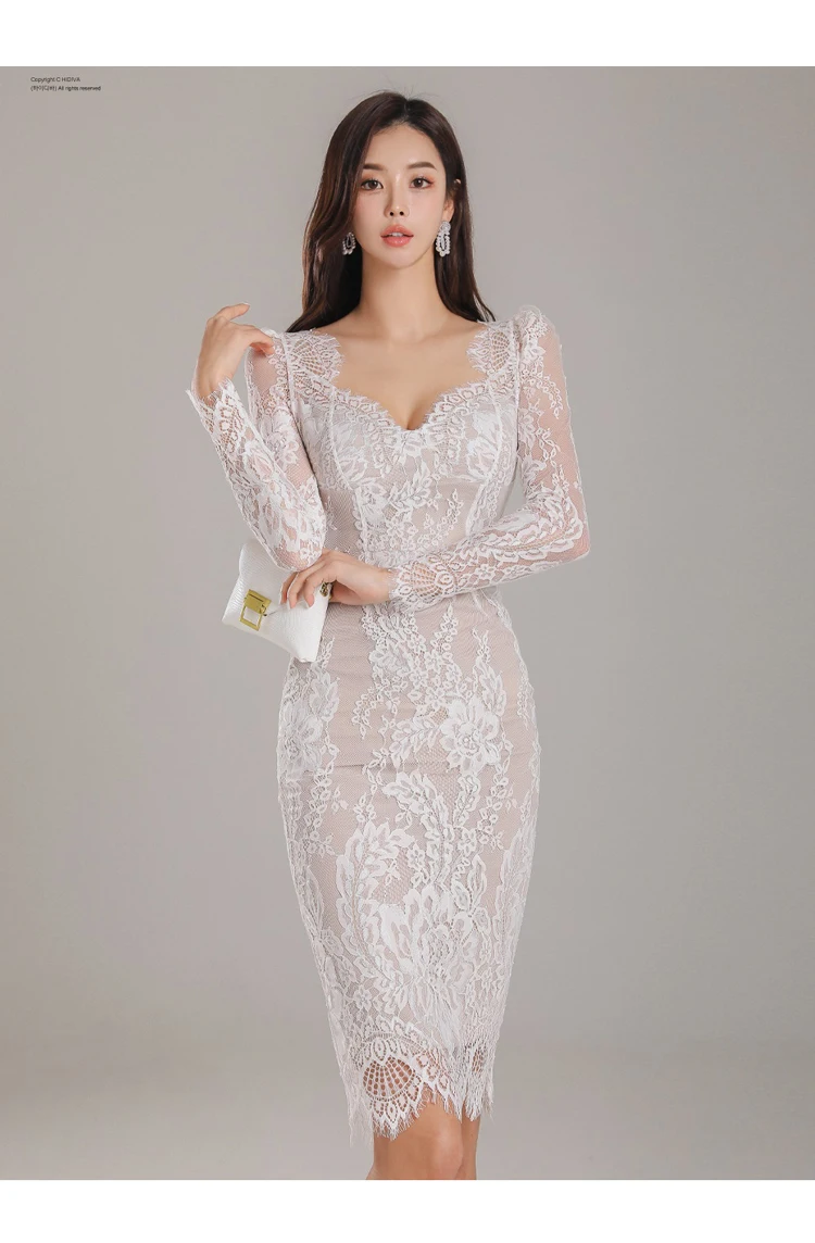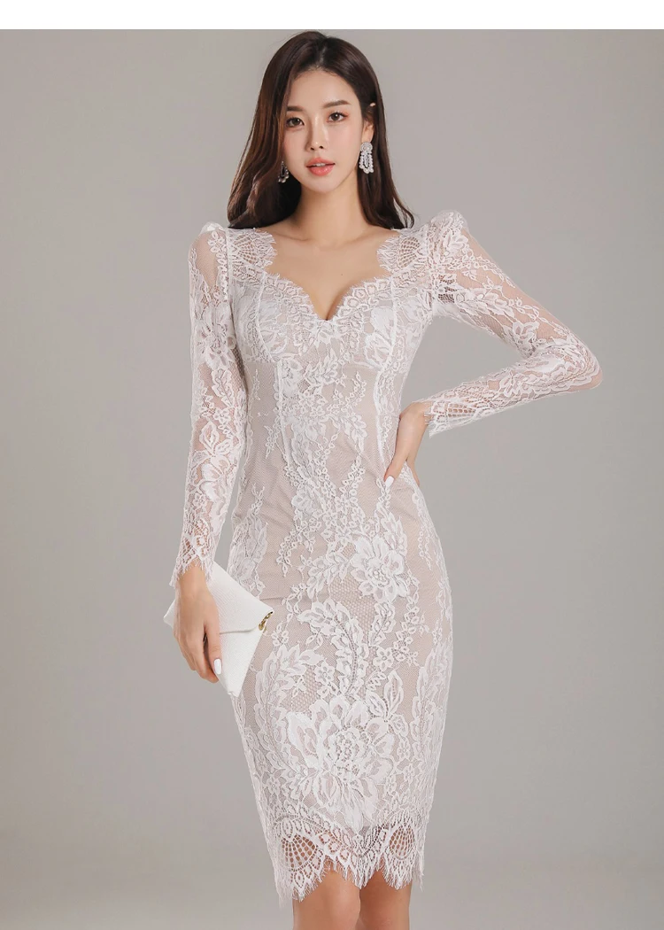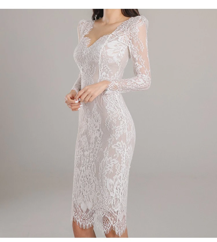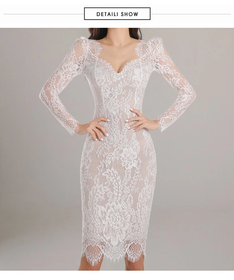 Fleepmart Elegant White / Black Lace V-neck Sexy Slim Sheer Sleeve Long Sleeve Bodycon Dress Spring Summer 2024 Party Dress Night Club