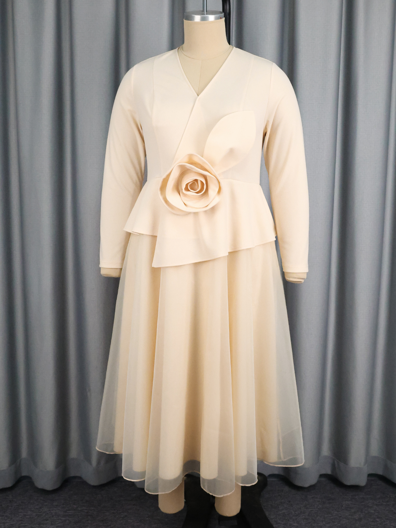 Fleepmart Elegant Women A Line Dress V Neck Long Sleeve 3D Flower Peplum Patchwork Mesh Wedding Guest Church Party Outfit Autumn New