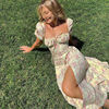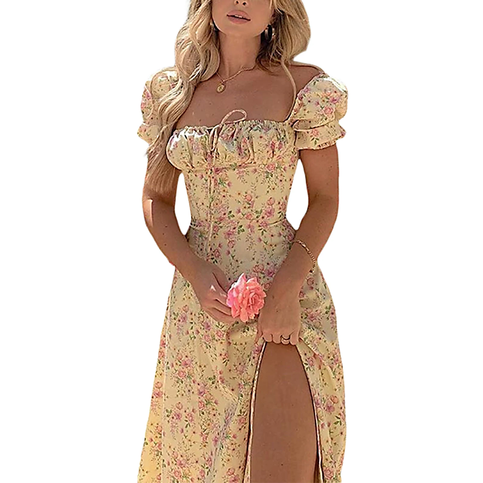 Fleepmart Elegant Women s Maxi Dress with Puff Sleeves Lace-Up Detail Floral Print and High Side Split for a Stylish Look