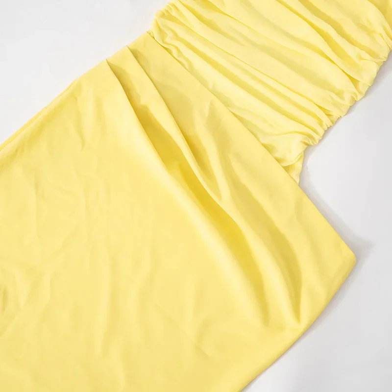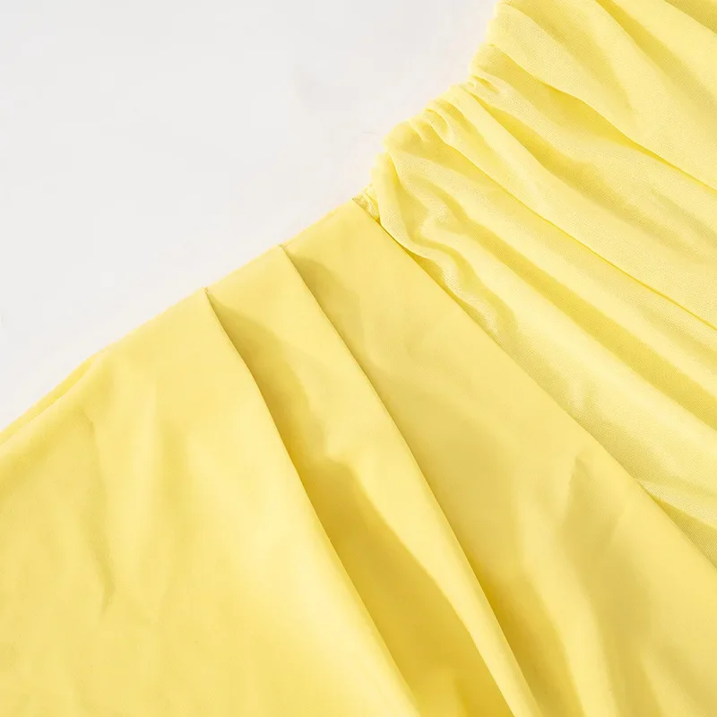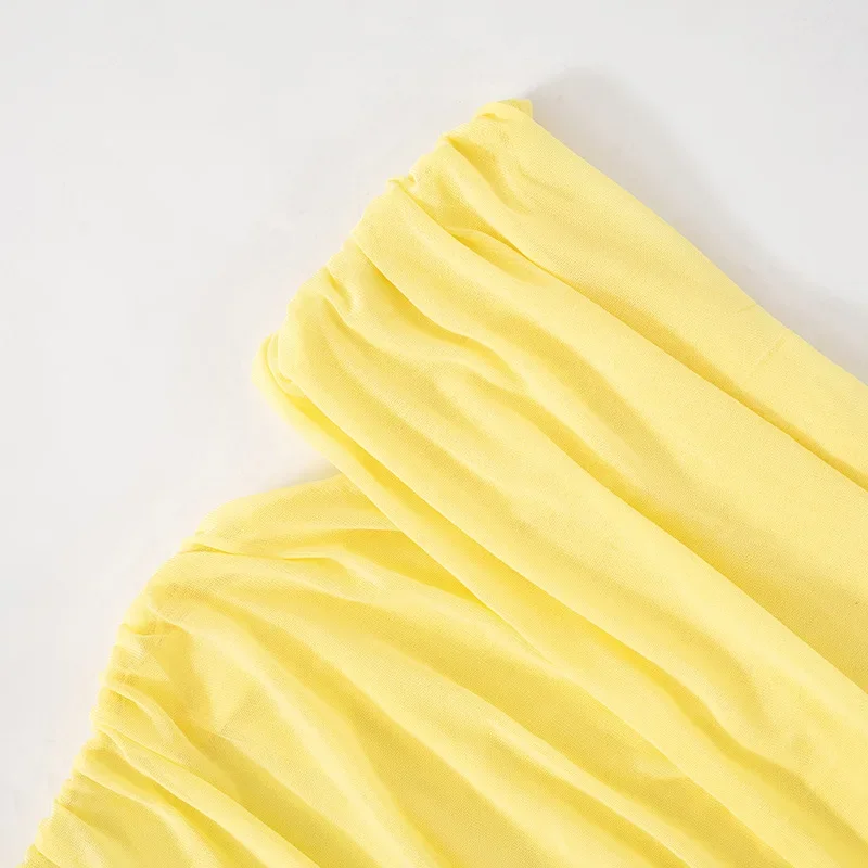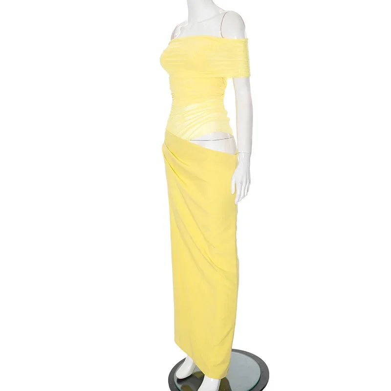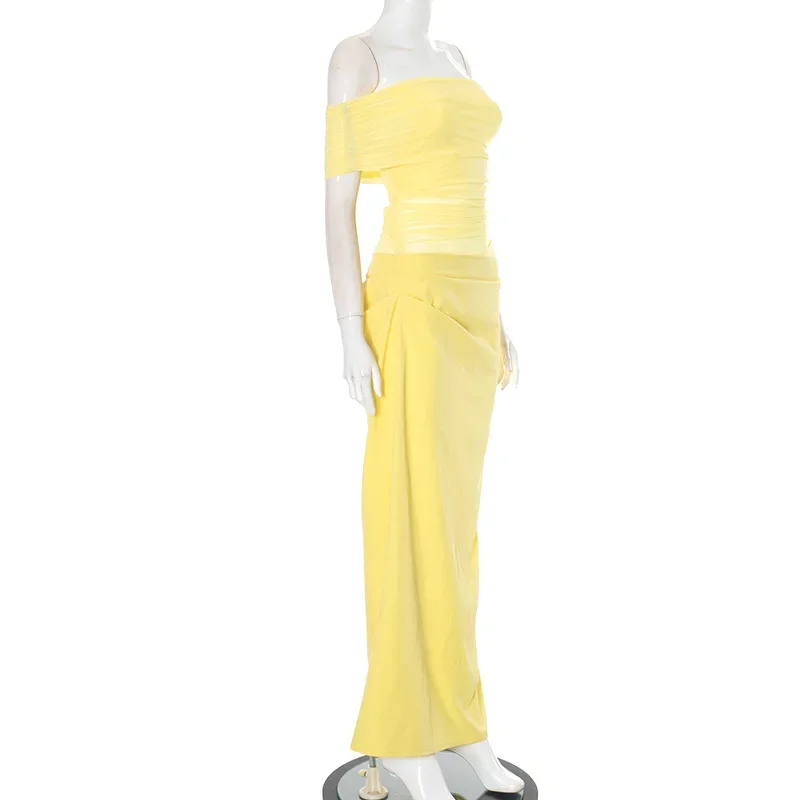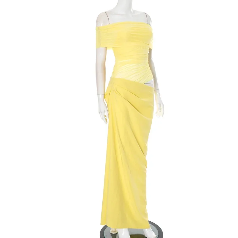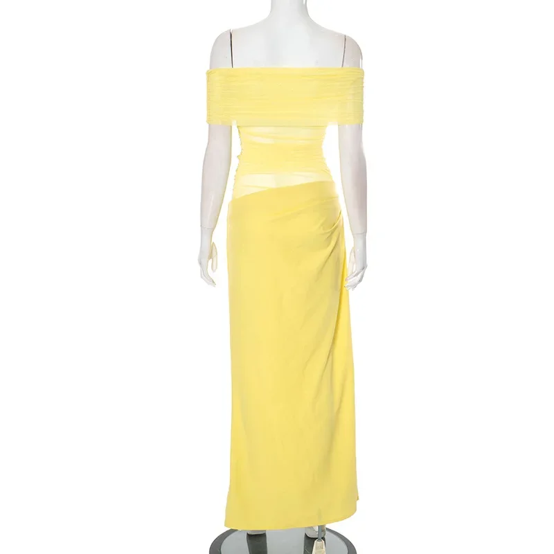 Fleepmart Elegant Yellow Holiday Beach Women Sexy Slash Neck Mesh Evening Folds Hollow Out Long Party Gowns