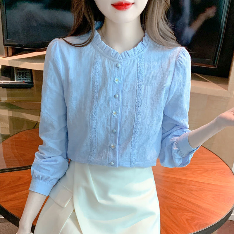 Fleepmart Embroidery Women Spring Autumn Blouses Shirts Lady Casual Long Sleeve Stand Collar Solid Color Tops