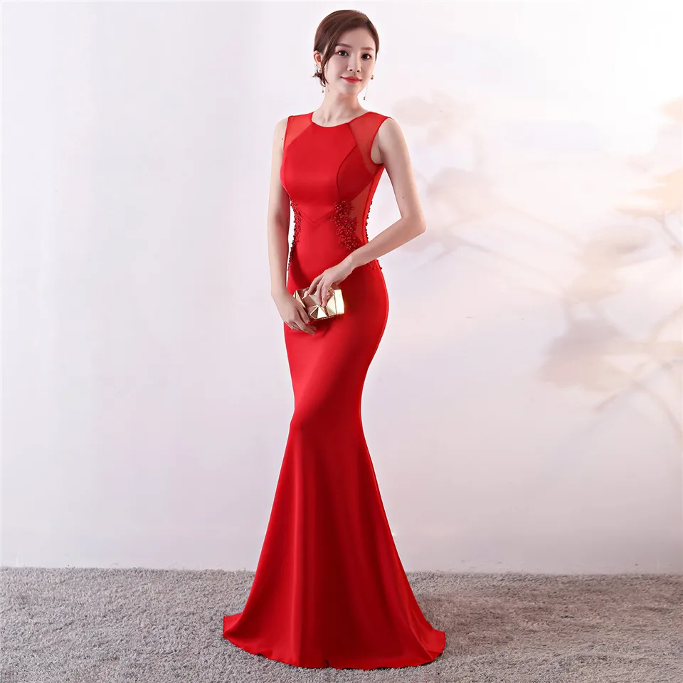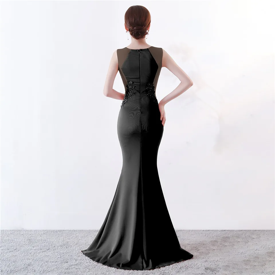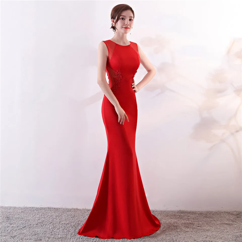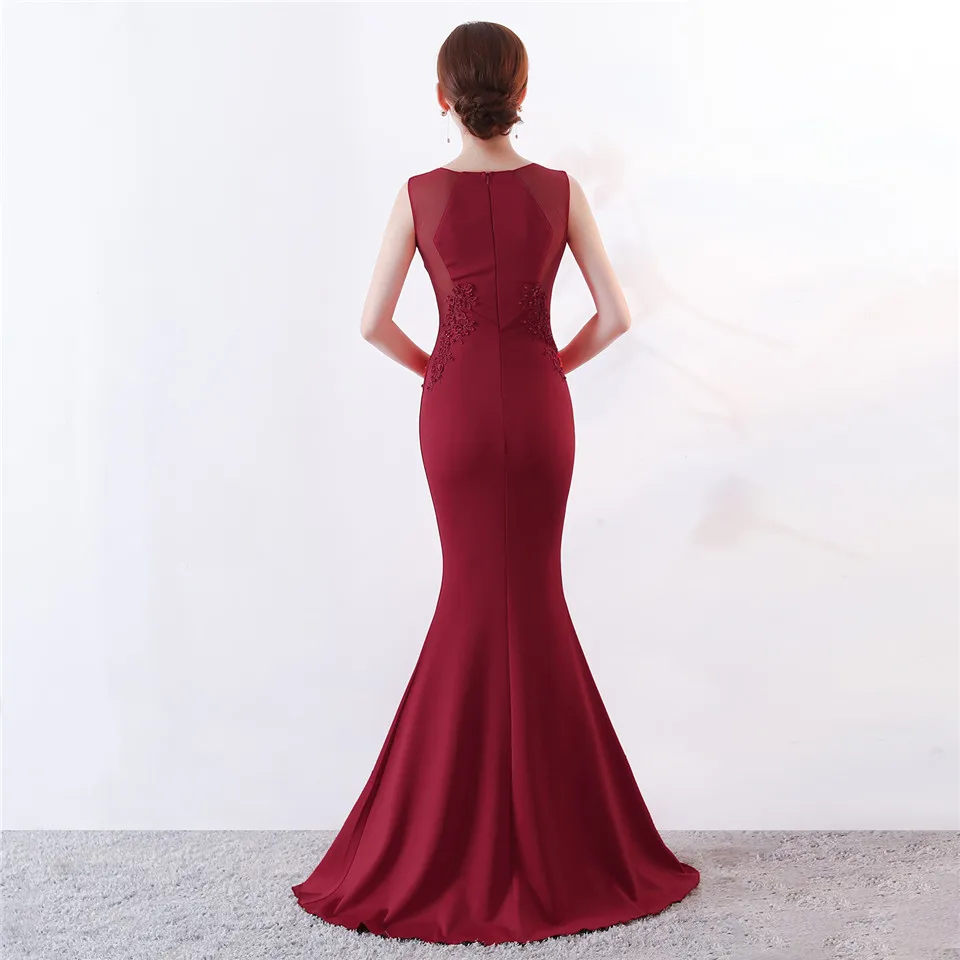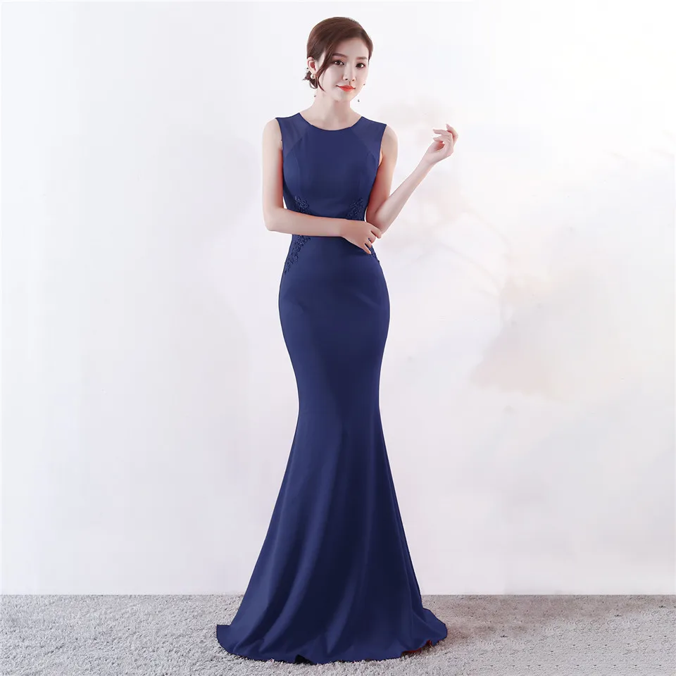 Fleepmart Evening Dresses Royal O-neck Sleeveless Pearls Party gown Elegant Embroidery zipper back long Trumpet Prom dress