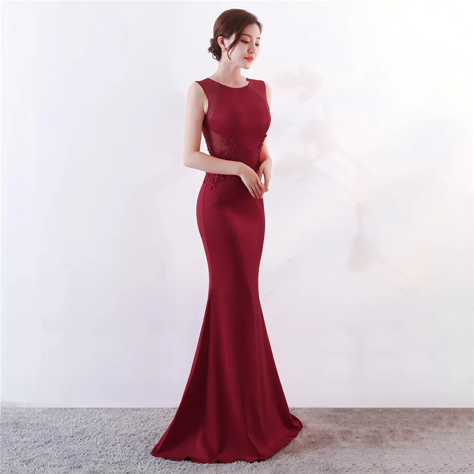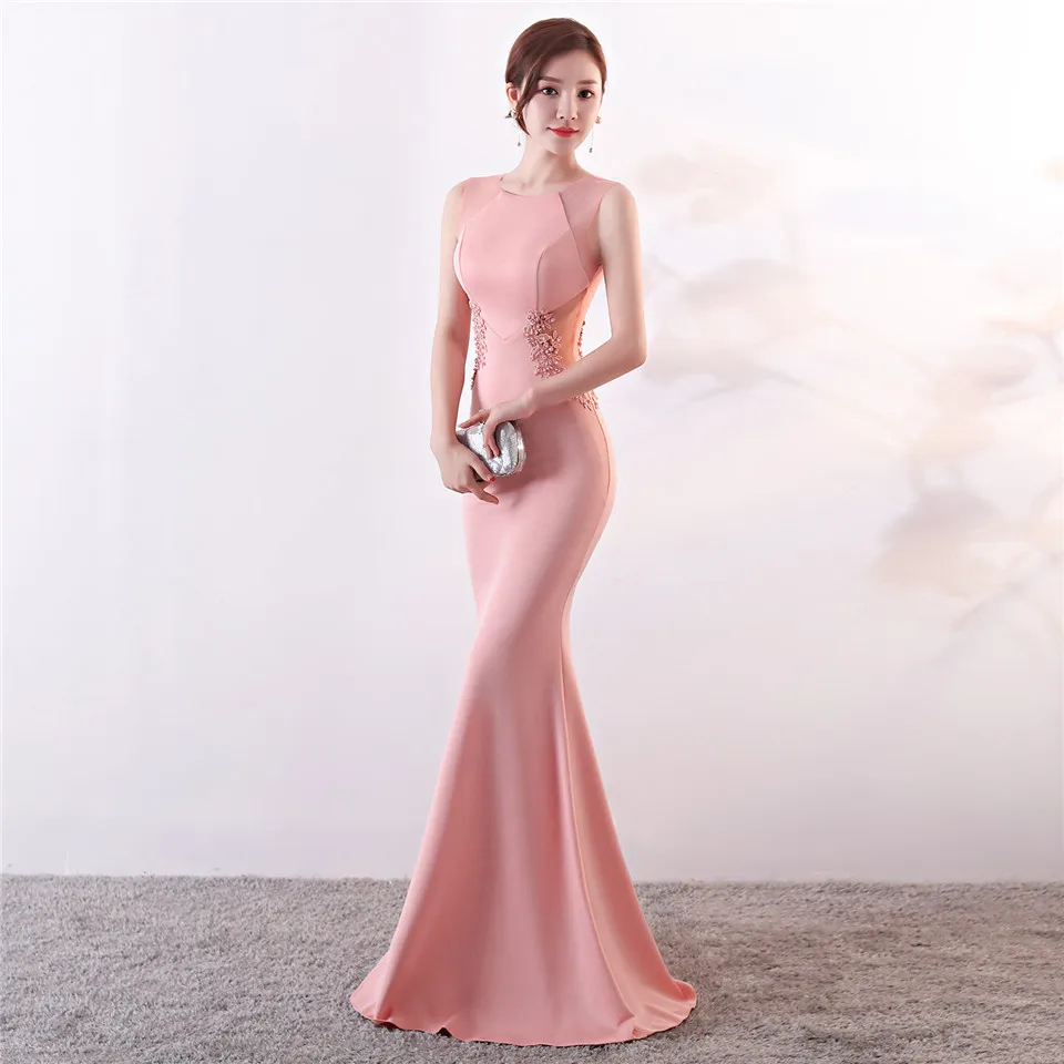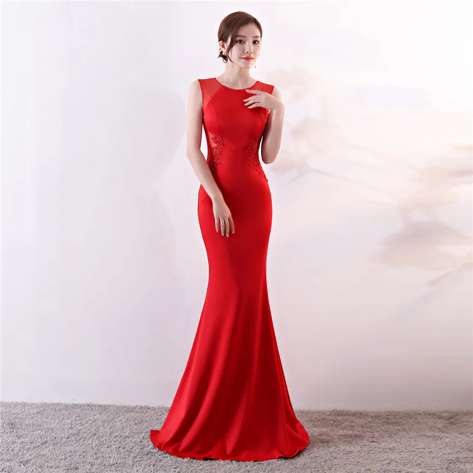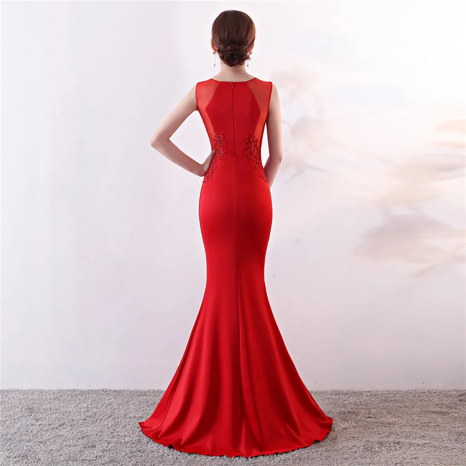 Fleepmart Evening Dresses Royal O-neck Sleeveless Pearls Party gown Elegant Embroidery zipper back long Trumpet Prom dress