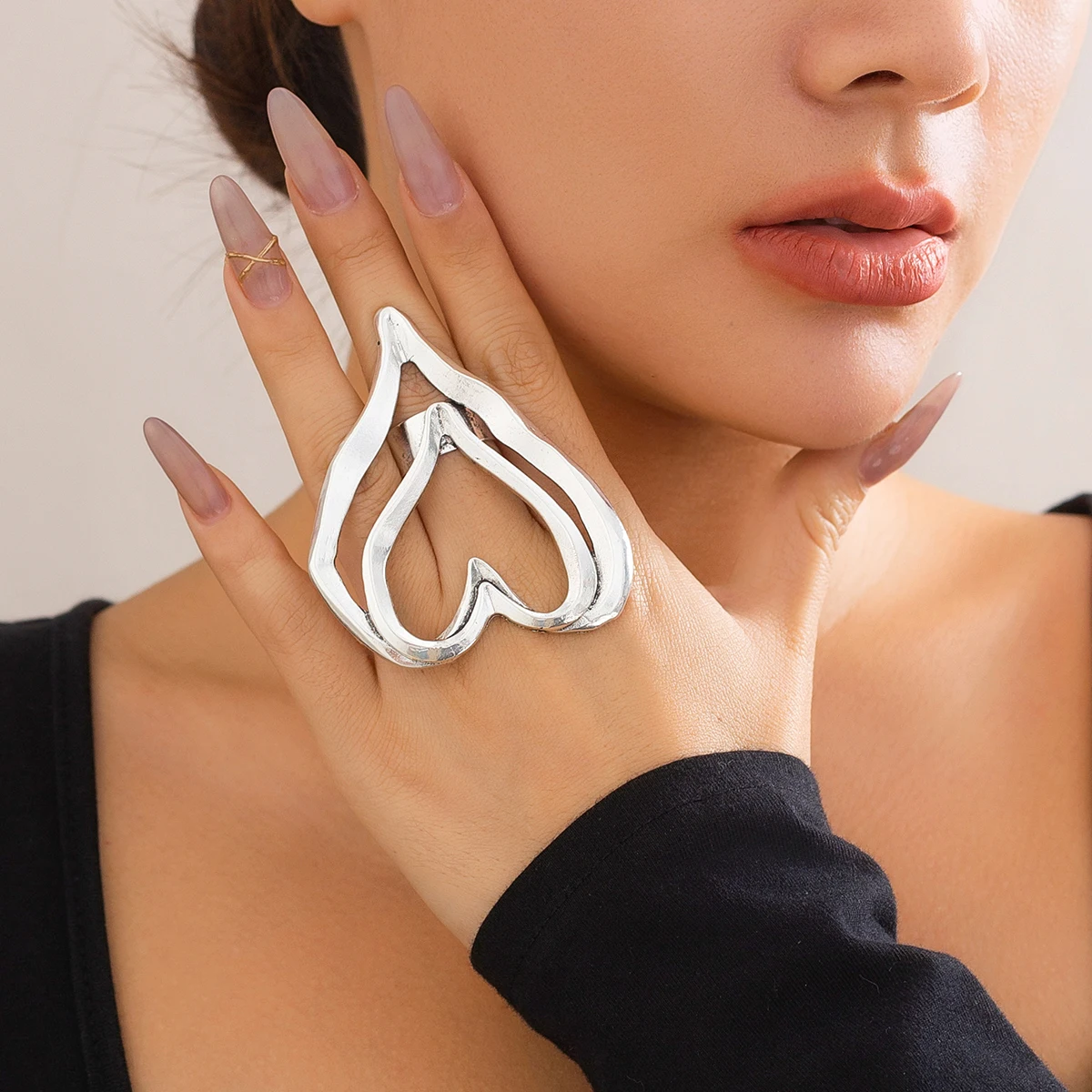 Fleepmart Exaggerated Geometric Metal Big Heart Ring Women’s Fashion Opening Adjustable Wide Ring Gothic Aesthetic Jewelry Gift