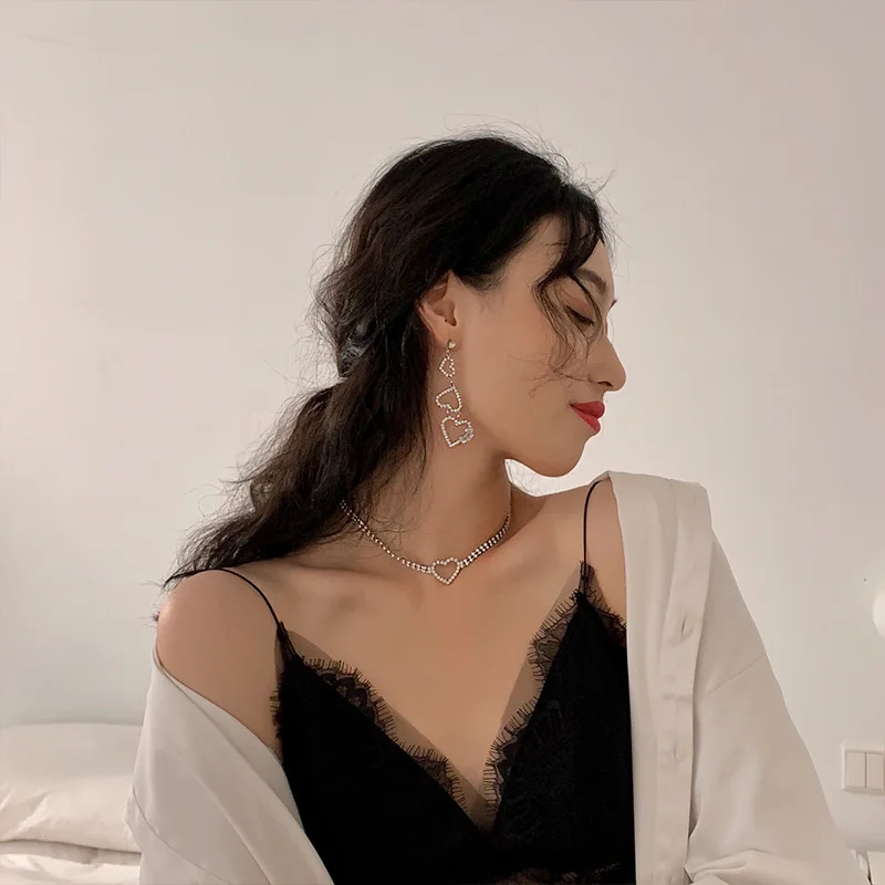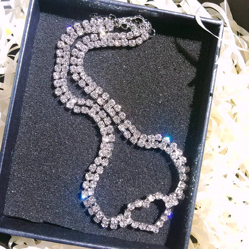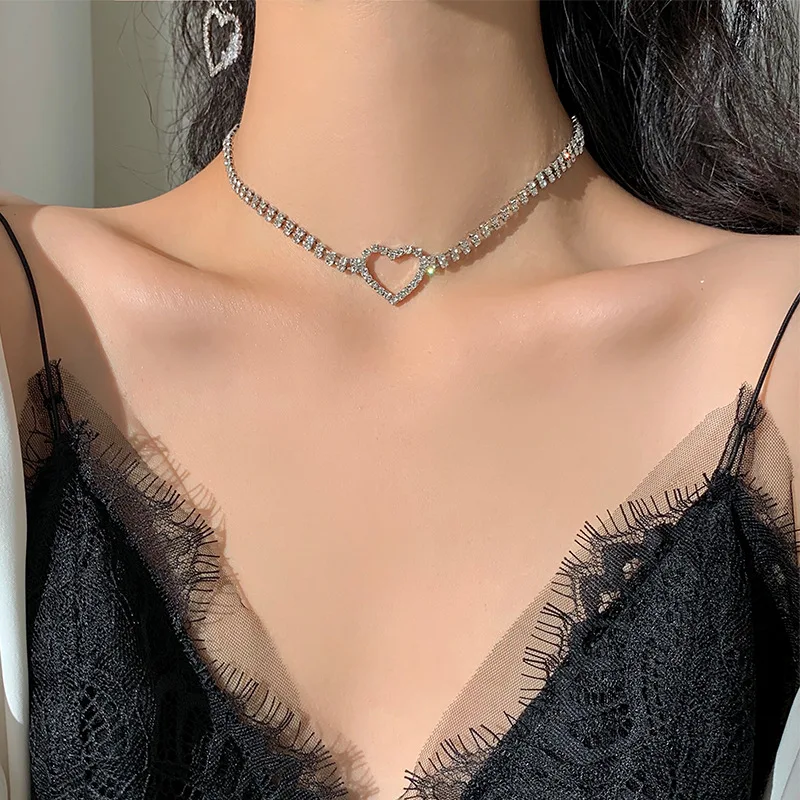Fleepmart Fashion Bling Crystal Heart Choker Necklace for Women Girl Silver Color Simple Short Chain Necklace Party Wedding Jewelry