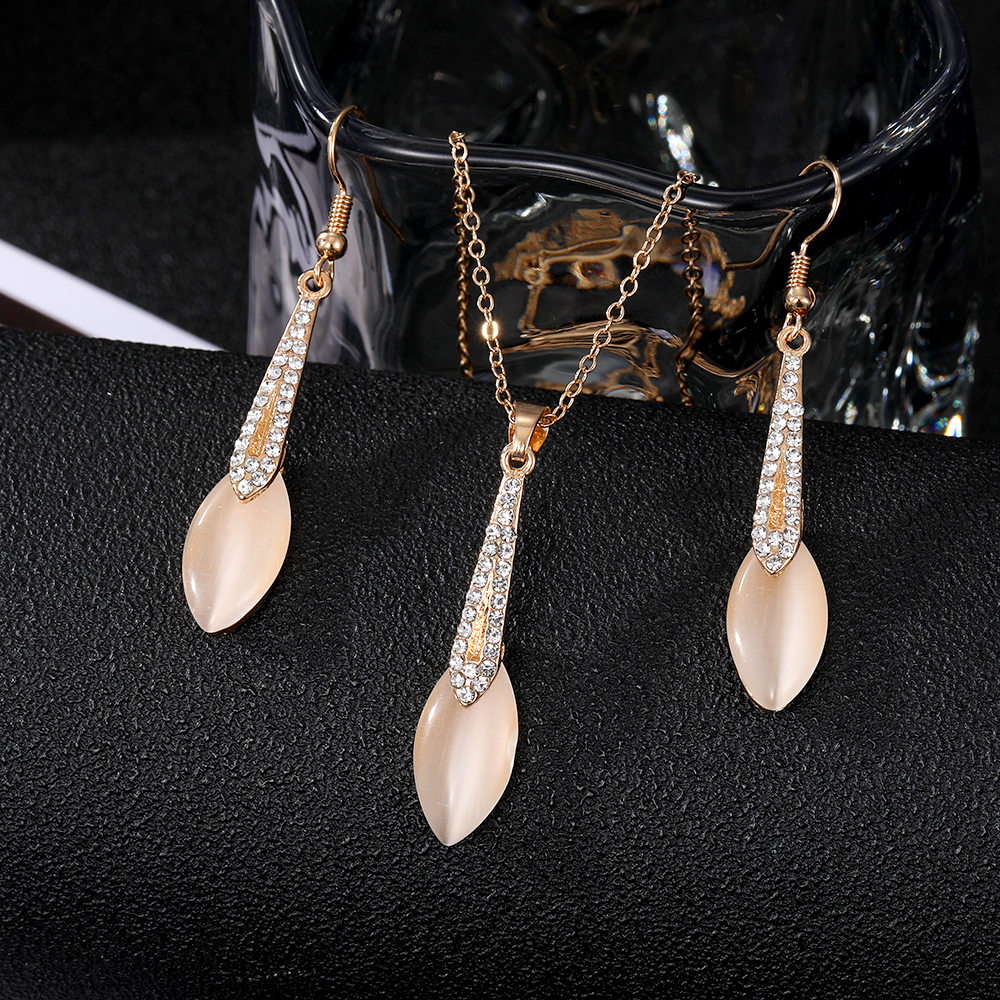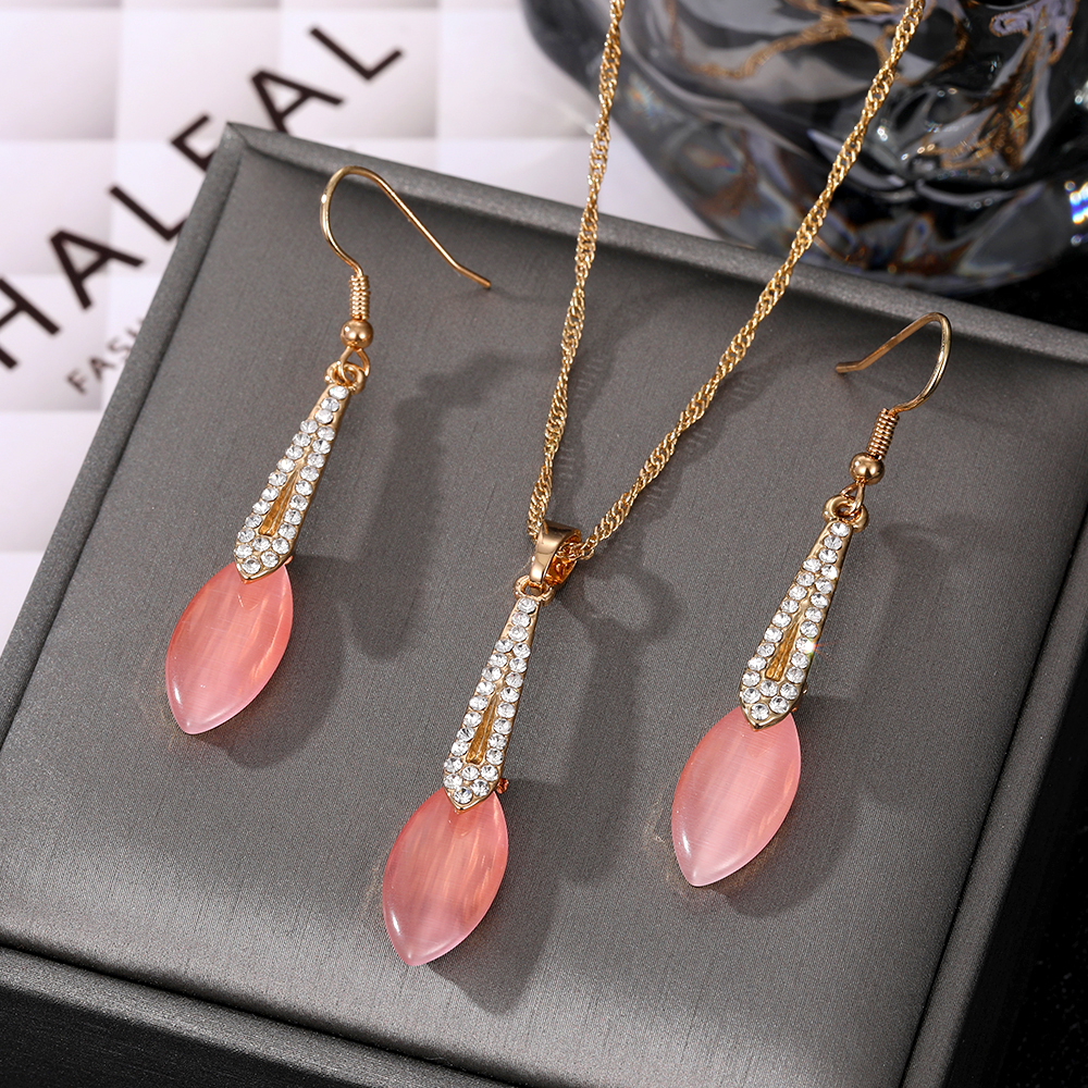 Fleepmart Fashion Chain Pendant Necklace Earrings Jewelry Set for Women Pink Synthetic Cut Stone Crystal Retro Jewellery Wedding