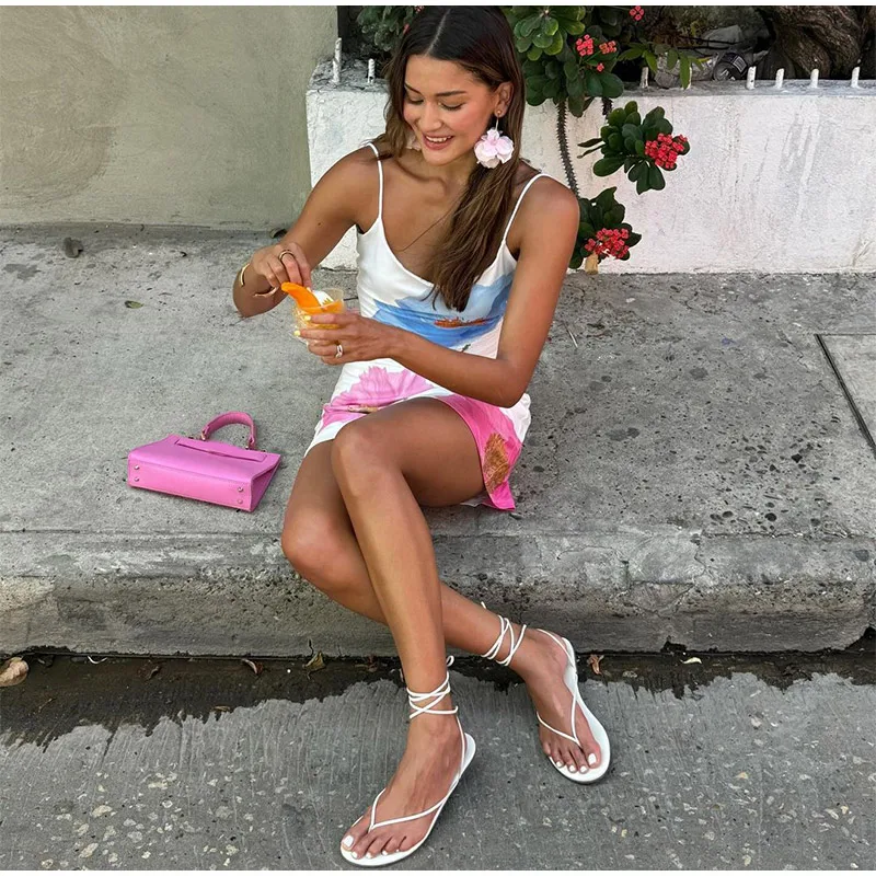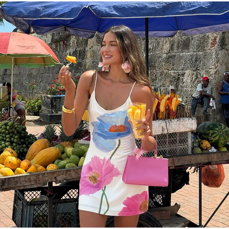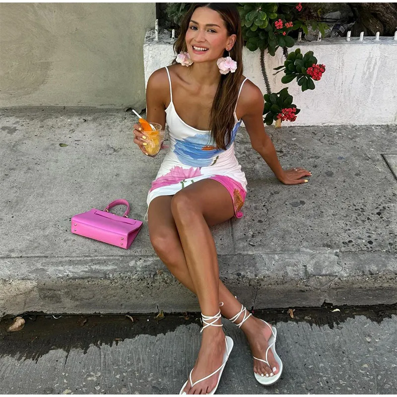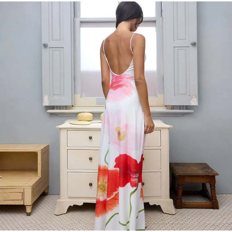 Fleepmart Fashion Flower Printed Women Sling Dress Elegant U-neck Backless Bodycon Dresses Summer Lady Chic Beach Vacation Robes 2024