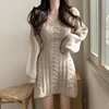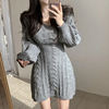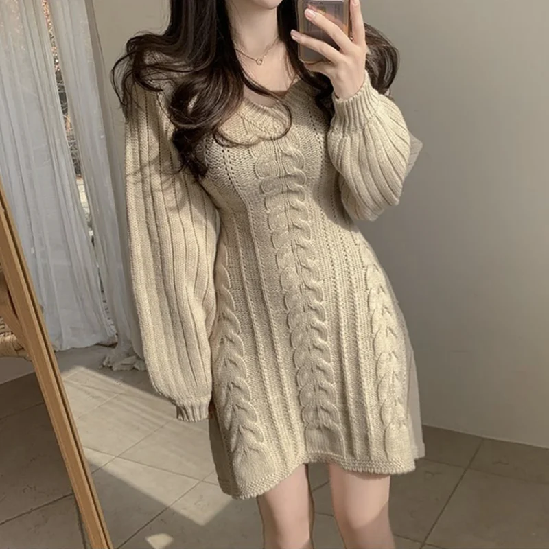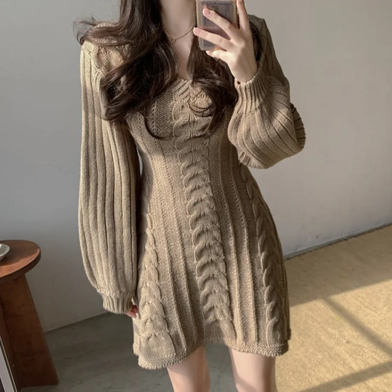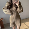 Fleepmart Fashion Long Sleeved Knitted Sweater Dress Korean Style Autumn V-neck Slim Fit Lace-up Elegant Solid Color Office Lady Dresses
