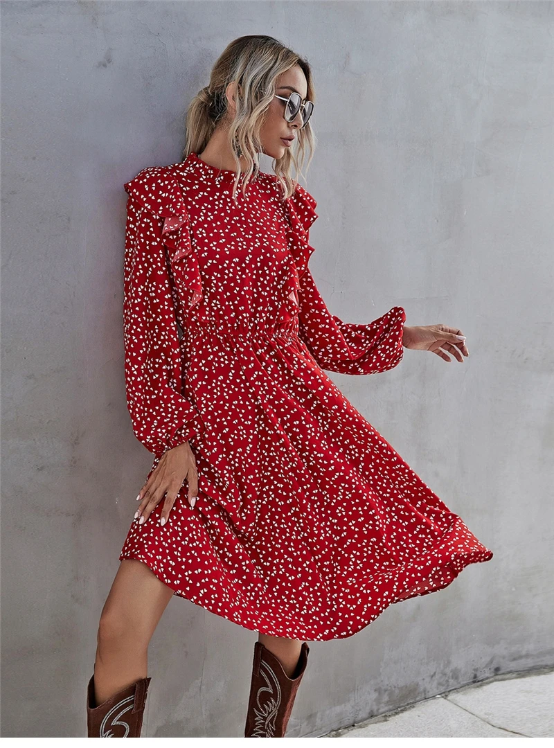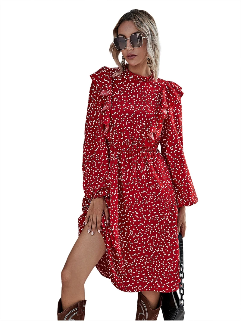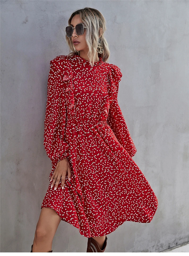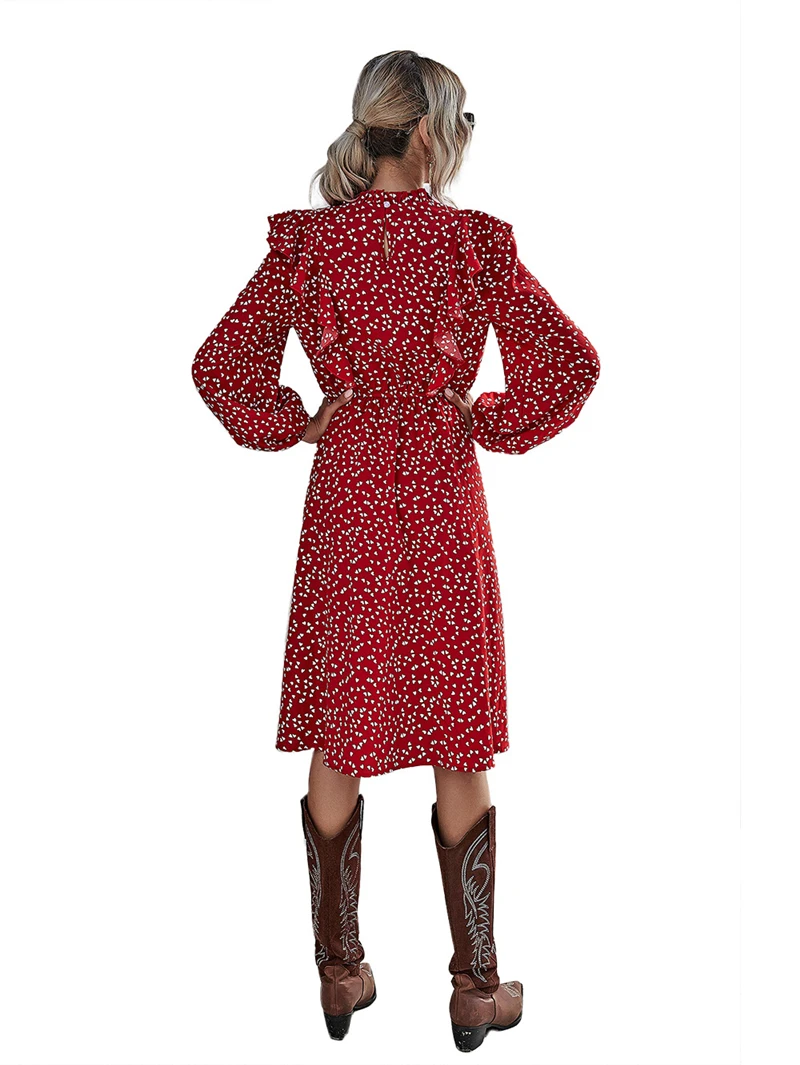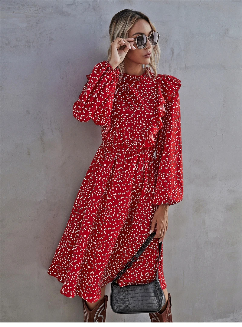Fleepmart Fashion New Ruffles Heart Dot Print Dress Women Elegant Full Sleeve High Waist Ladies 2022 Spring Autumn Long Dress Red