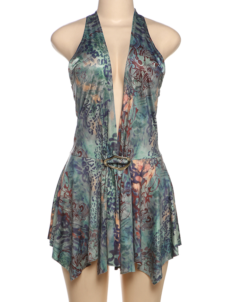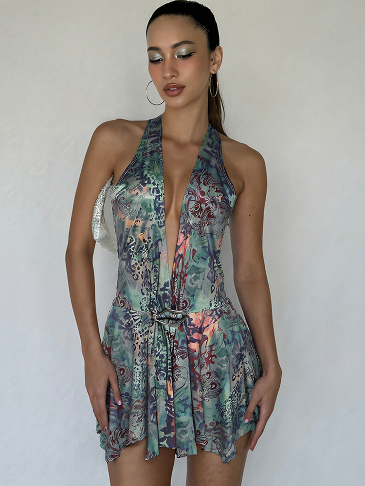 Fleepmart Fashion Print Mini Dress Women Halter Deep V-Neck Sexy Backless Ruched Ruffles Hem Trend Beach Party Vacation Outfits
