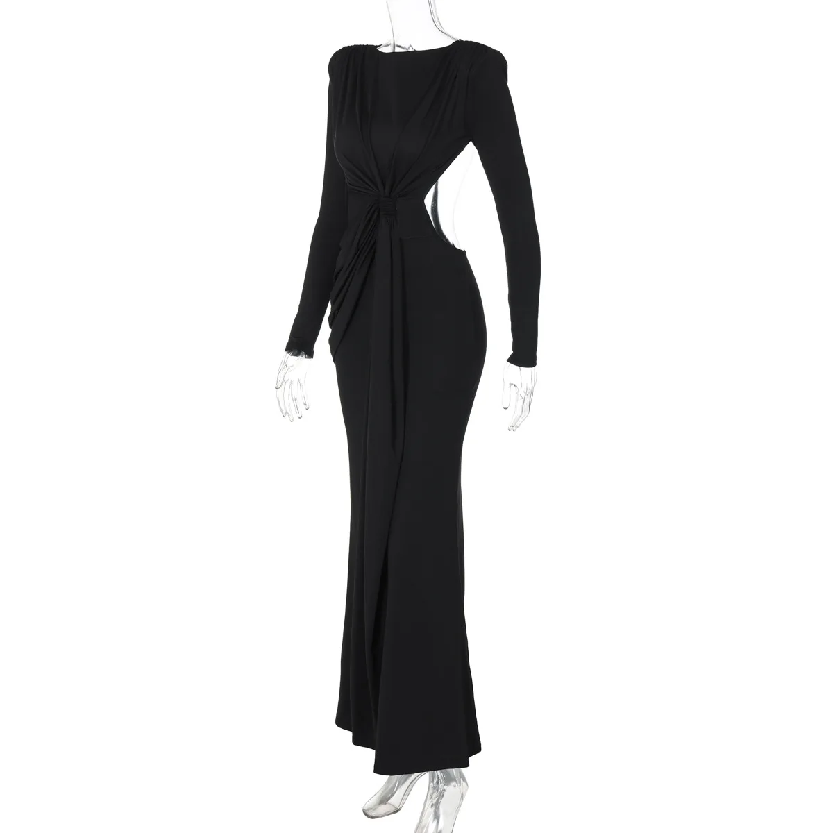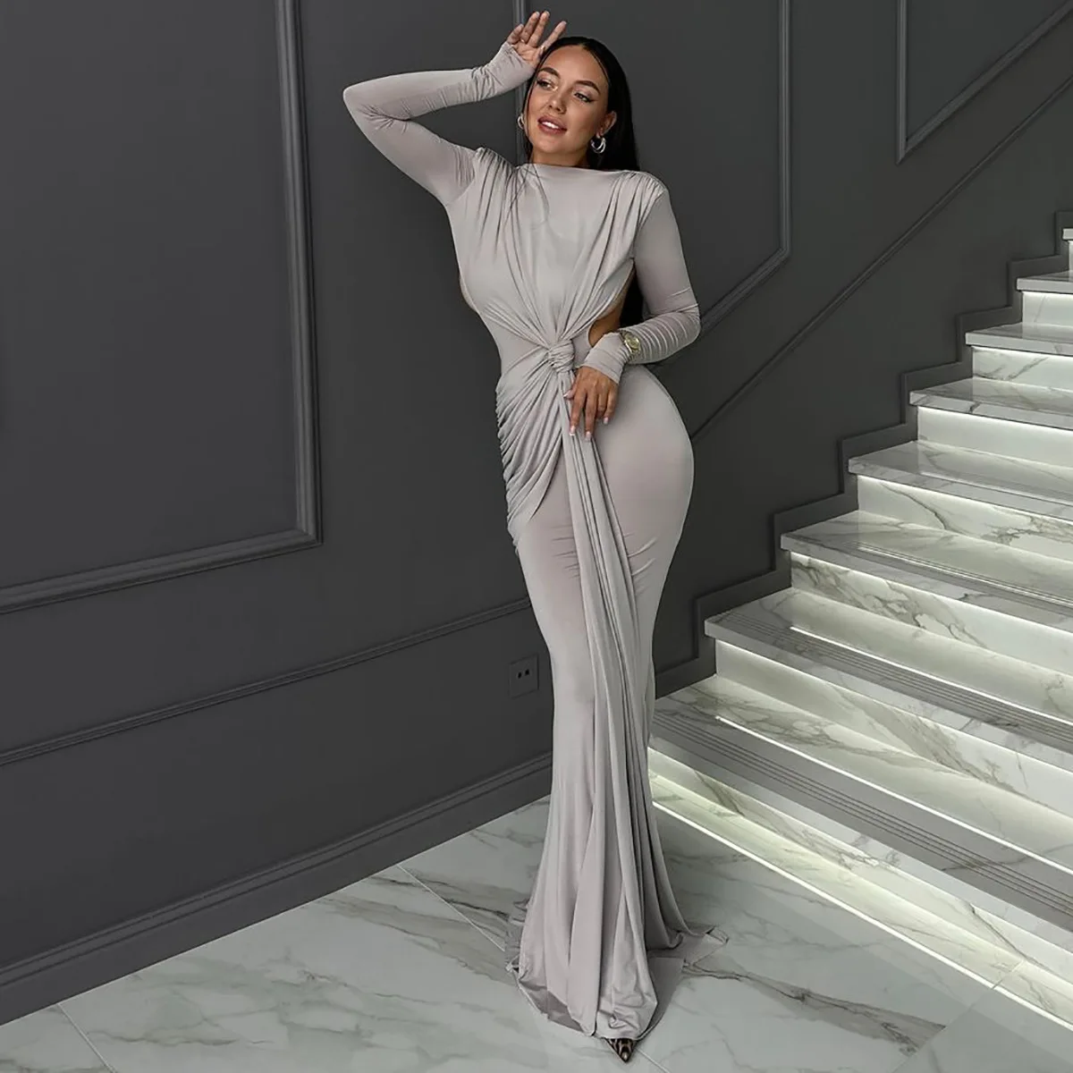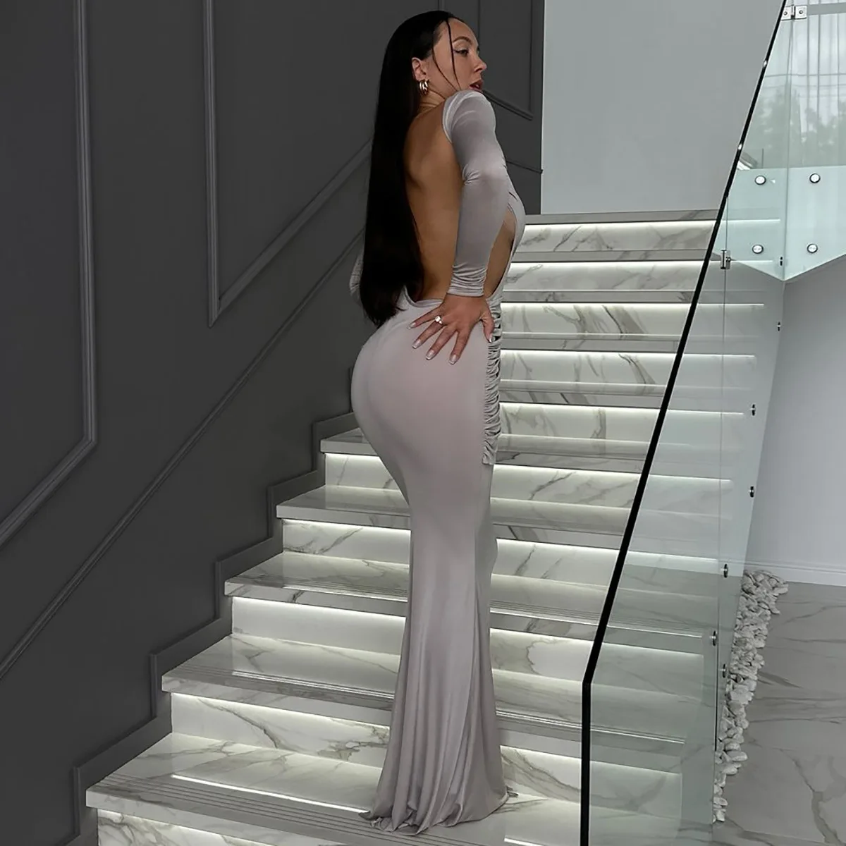 Fleepmart Fashion Ruched Cut Out Sexy Backless Maxi Gown Club Fall Long Sleeve Draped Dress Bodycon Clothes