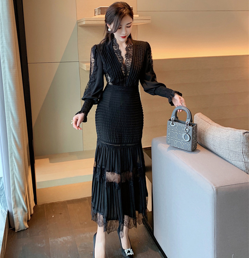fleepmart Fashion Runway Women Pleated Party Dress Spring Sexy V Neck Lantern Sleeve Chiffon Patchwork Lace Bodycon Slim Long Dress