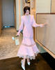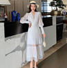 fleepmart Fashion Runway Women Pleated Party Dress Spring Sexy V Neck Lantern Sleeve Chiffon Patchwork Lace Bodycon Slim Long Dress