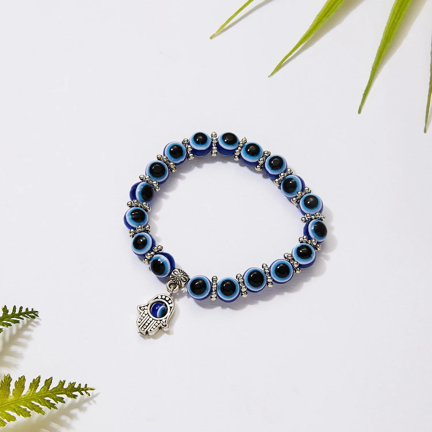 Fleepmart Fashion Silver Color Blue Evil Eye Hamsa Hand Fatima Palm Bracelets for Women Bead charm bracelet Ethnic style
