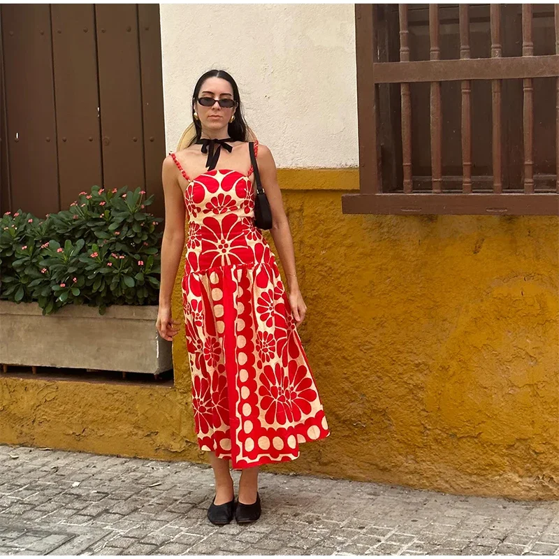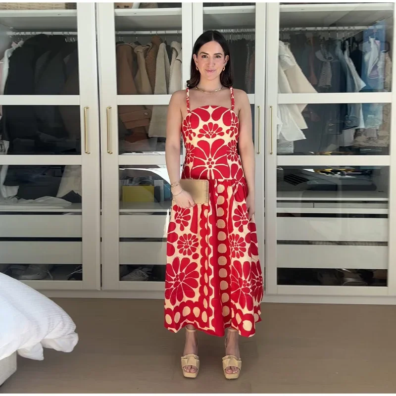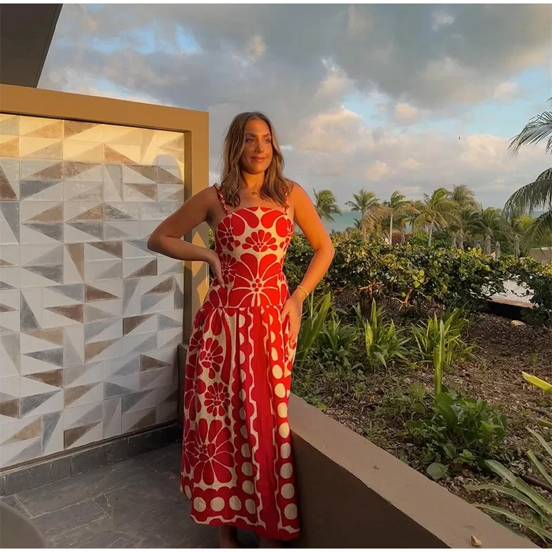 Fleepmart Fashion Vintage Print Slim Long Dress Women Elegant Sleeveless Backless A-line Dresses 2024 Chic Lady Vacation Bohemia Vestidos