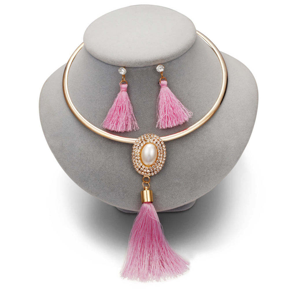 Fleepmart Fashion Women Tassel Jewelry Boho Pearl Chocker Necklace Crystal Drop Earrings Wedding Jewelry Set Tassel Necklace Earrings