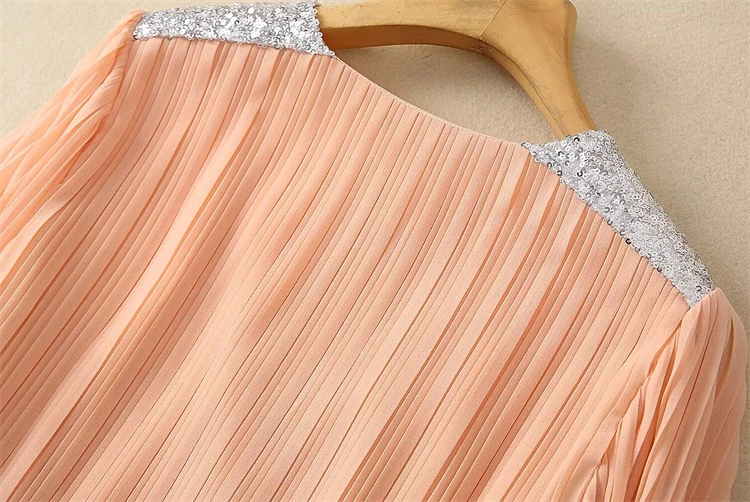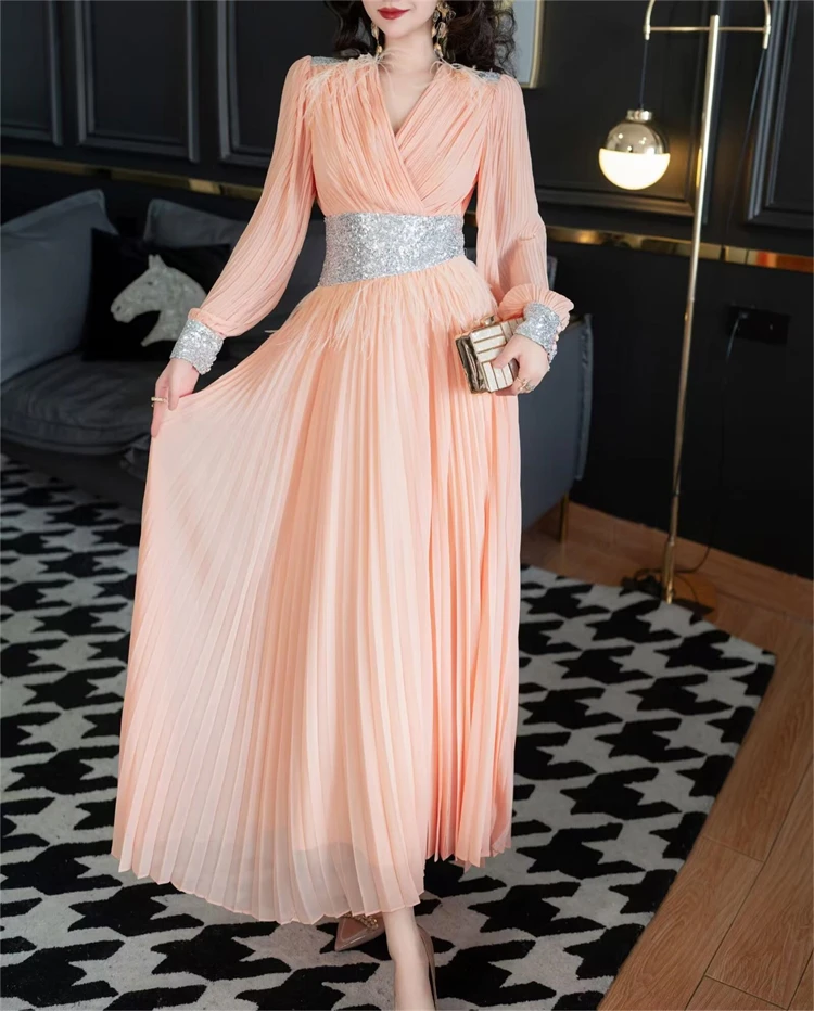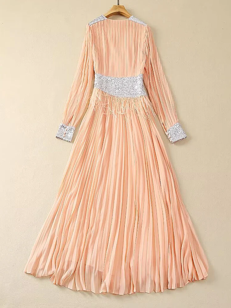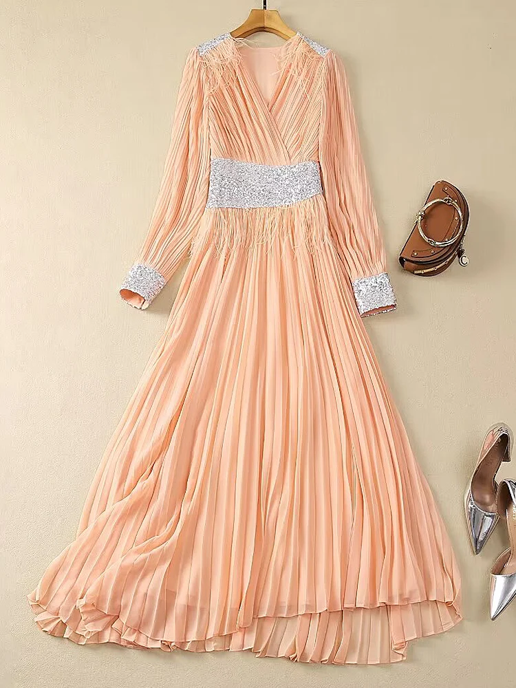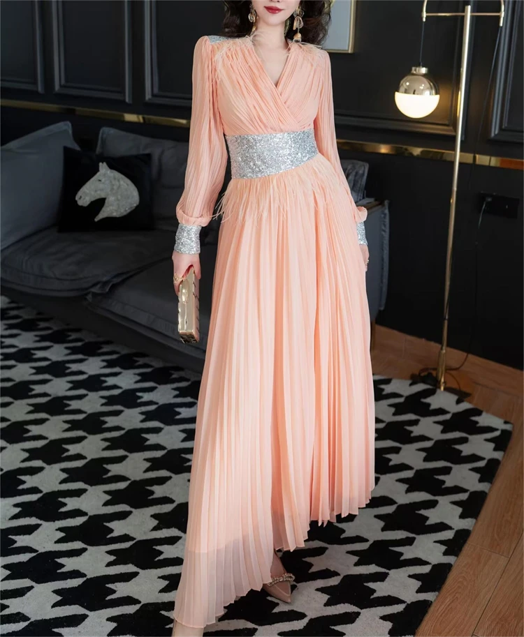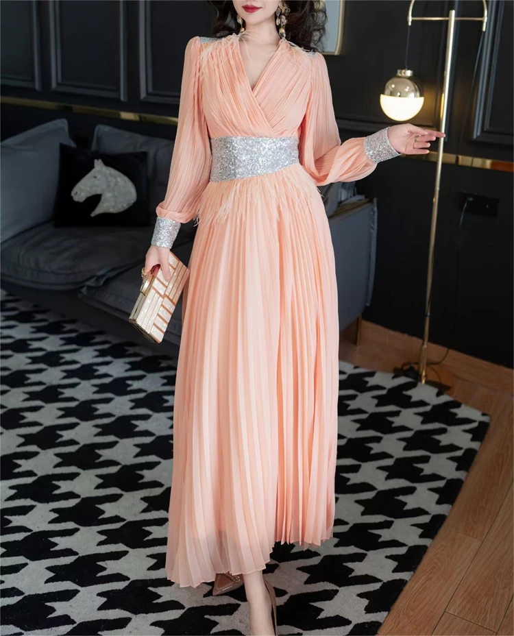Fleepmart Female Spring High Quality Fashion Party Chiffon Feather Pleated Sexy Sweet Sequin Gorgeous Pretty Long Sleeve Dresses For WomenFleepmart Female Spring High Quality Fashion Party Chiffon Feather Pleated Sexy Sweet Sequin Gorgeous Pretty Long Sleeve Dresses For Women