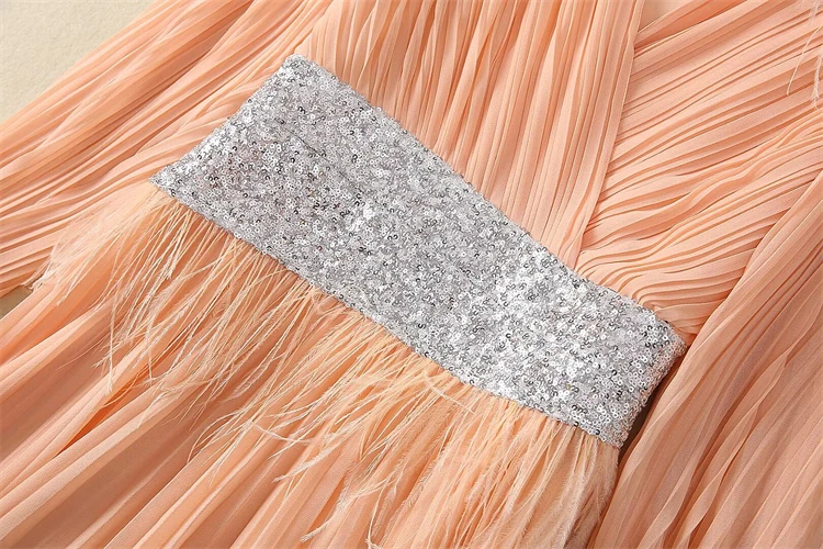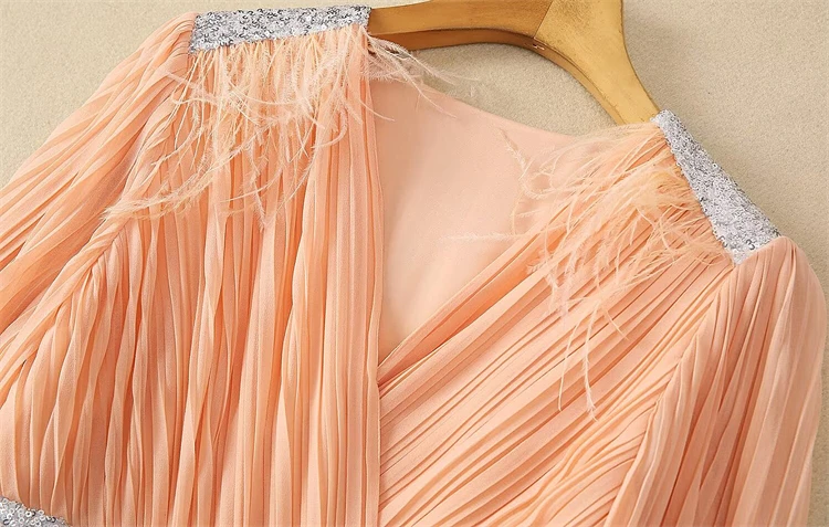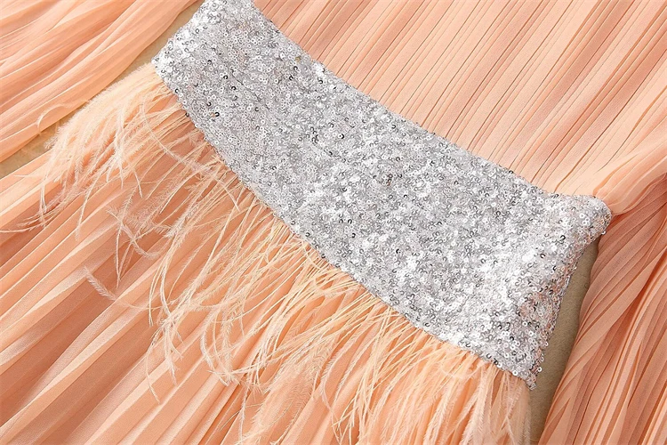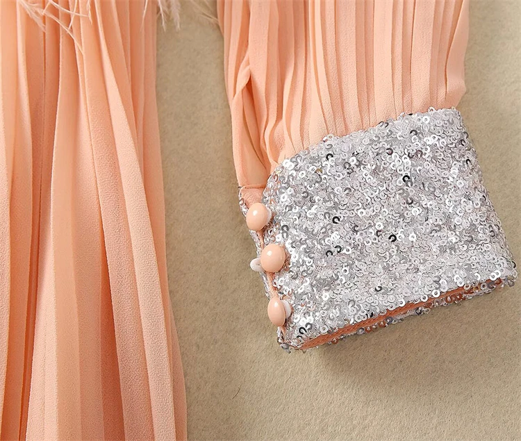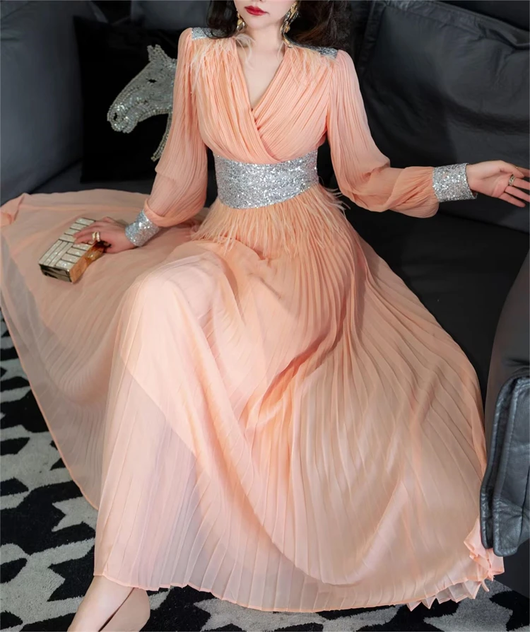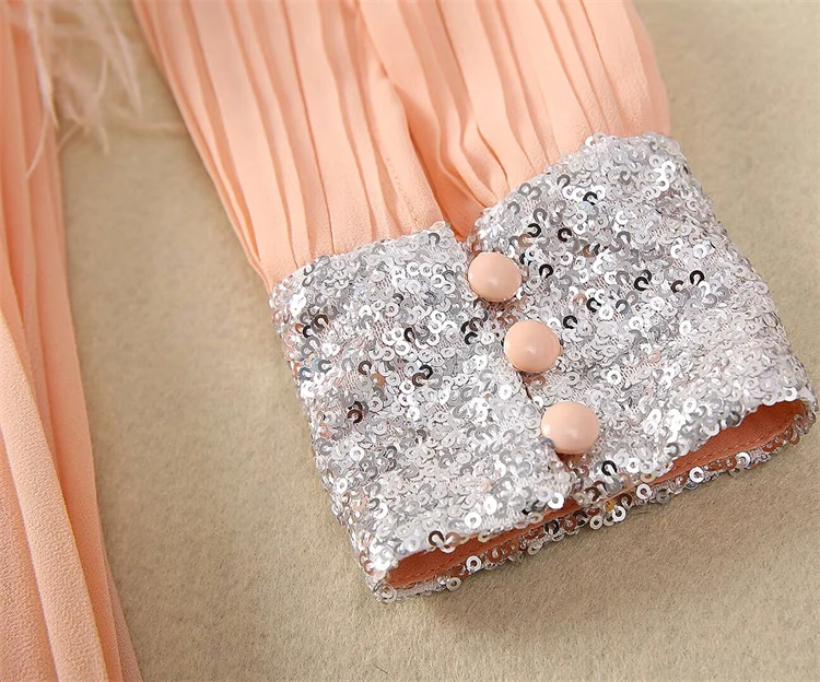 Fleepmart Female Spring High Quality Fashion Party Chiffon Feather Pleated Sexy Sweet Sequin Gorgeous Pretty Long Sleeve Dresses For Women
