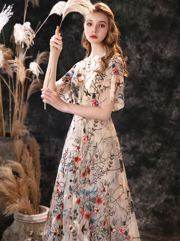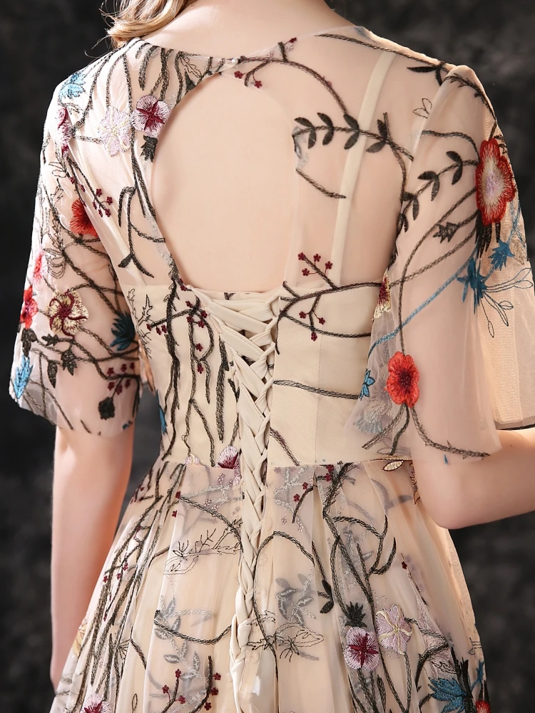 Floral Embroidery Evening Dresses 2021 Long Dress Colorful Tulle Short Sleeve Court Train Romantic Prom Gown Party Women Wear