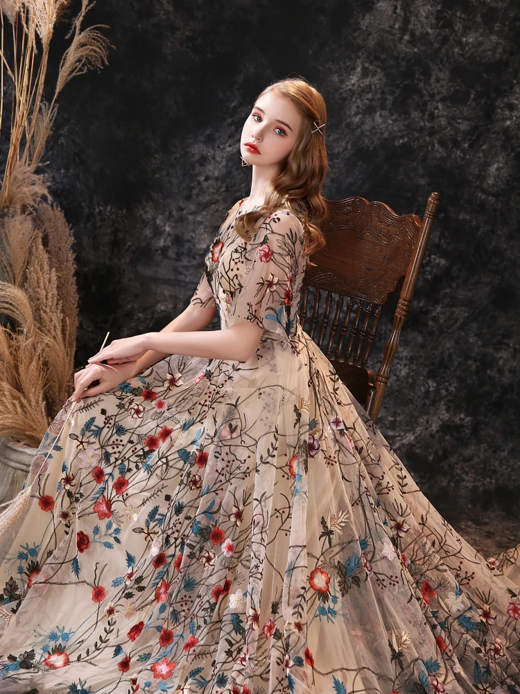 Fleepmart Floral Embroidery Evening Dresses 2022 Long Dress Colorful Tulle Short Sleeve Court Train Romantic Prom Gown Party Women Wear