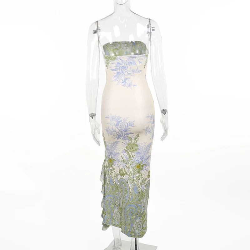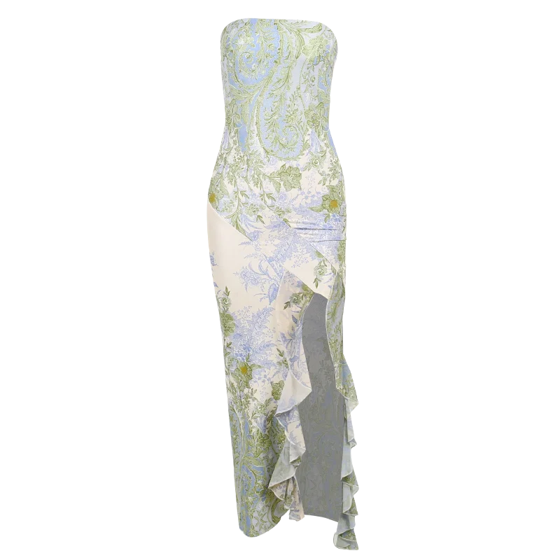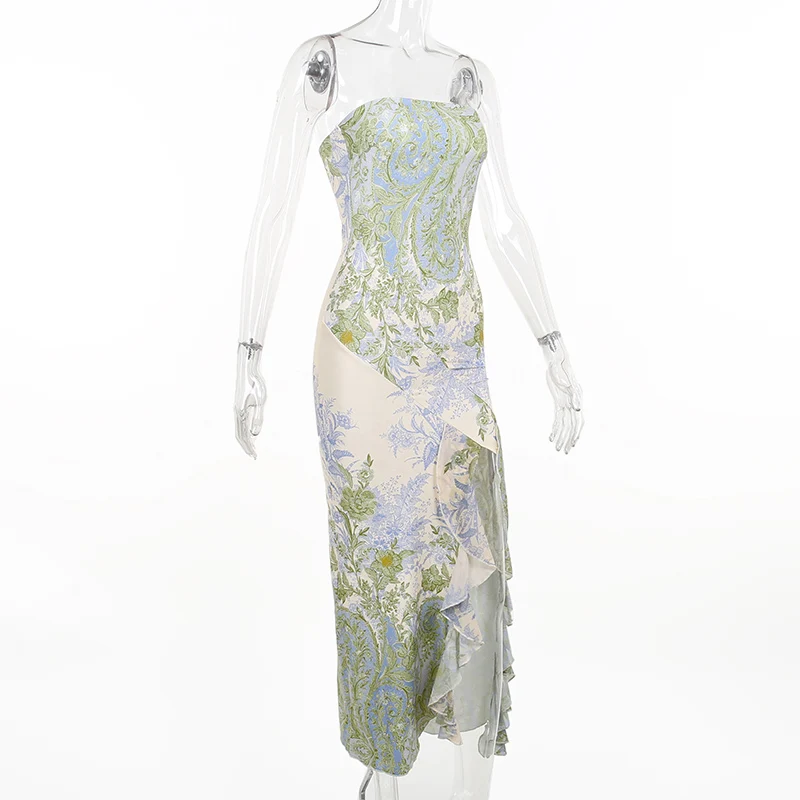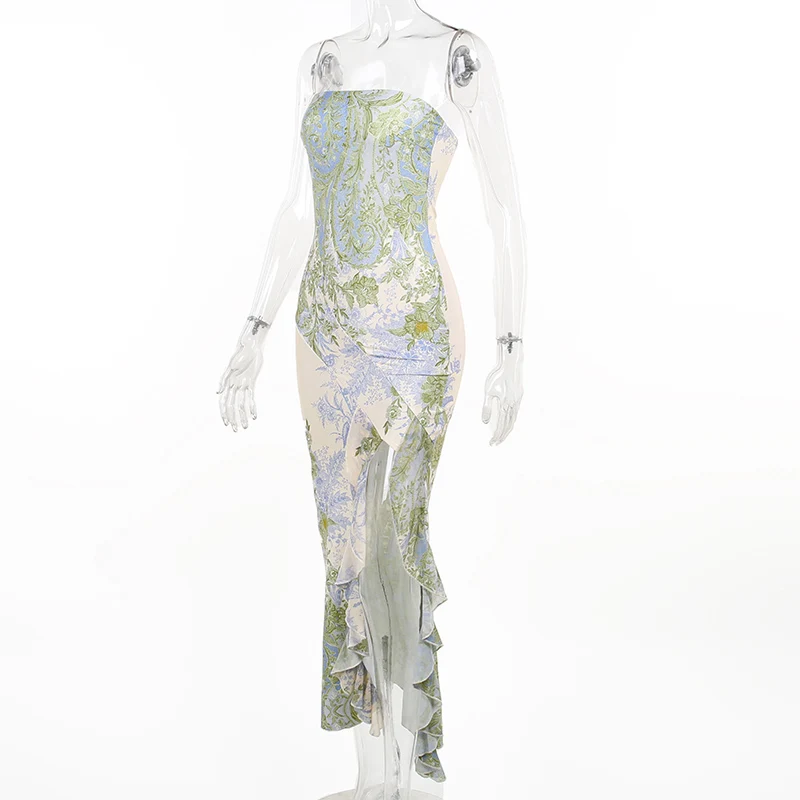Fleepmart Floral Luxury Y2K Tube Long Dress High Slit Ruffle Women Chic Vintage Sexy Summer 2023 New Formal Clubwear Party Robe