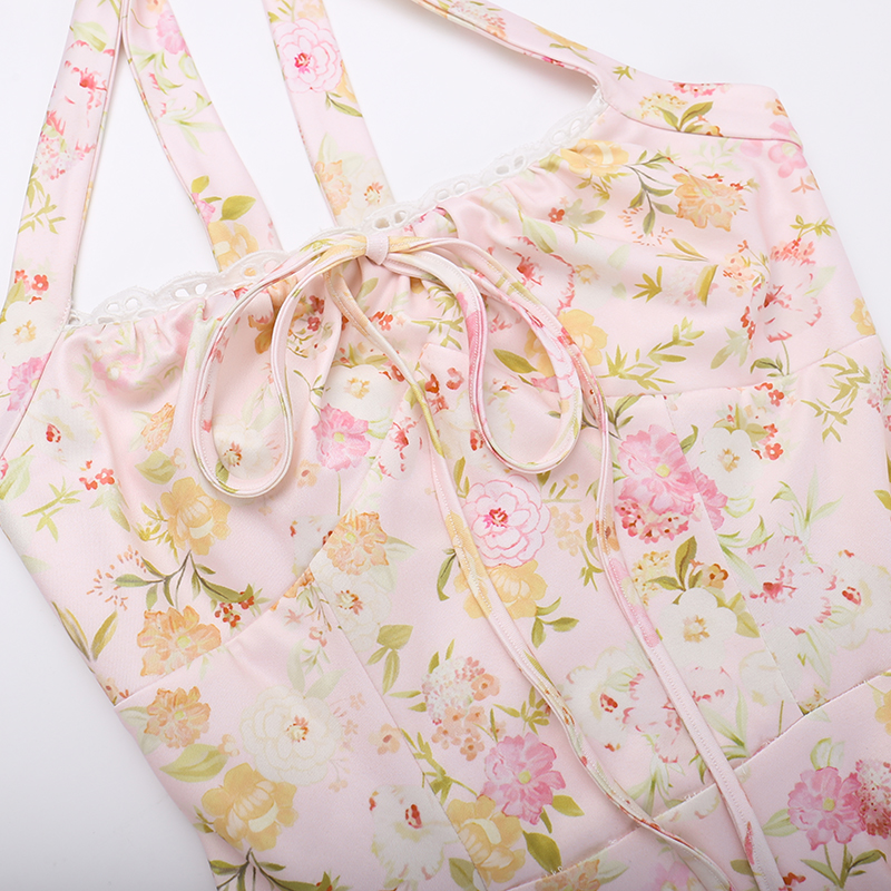Fleepmart Floral Print Backless Halter Dress Woman Elegant Casual Square Collar Sleeveless Beachwear Sexy Summer Clothing Dress