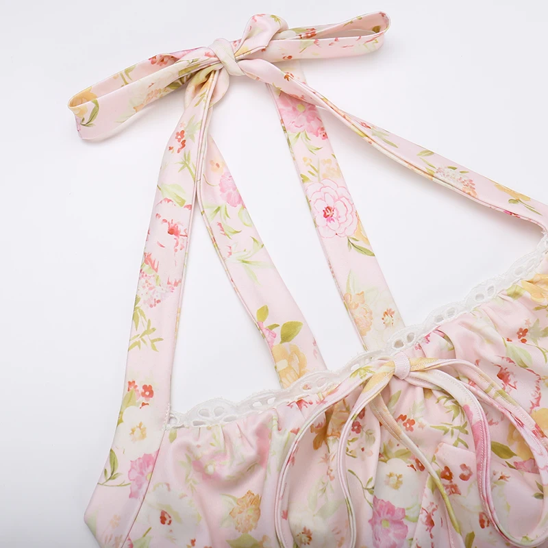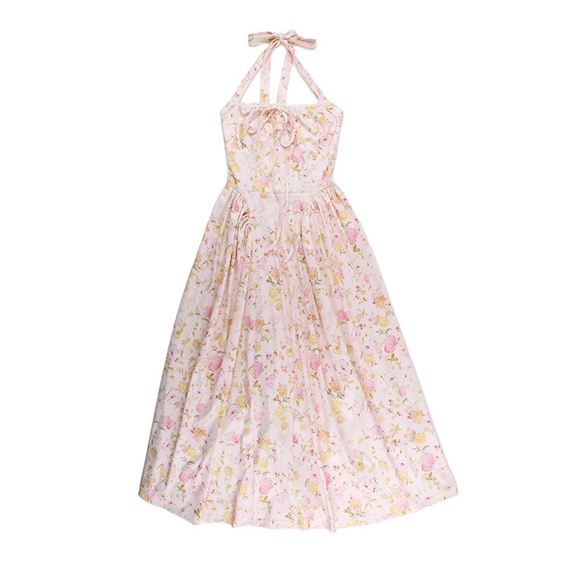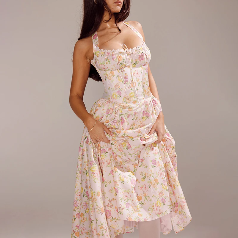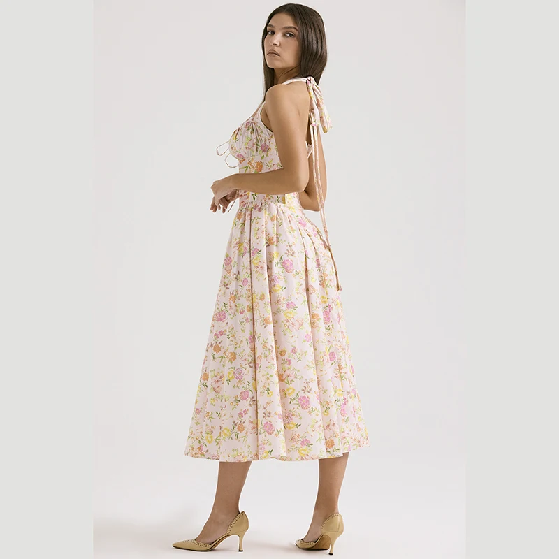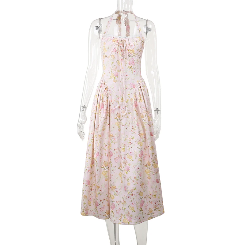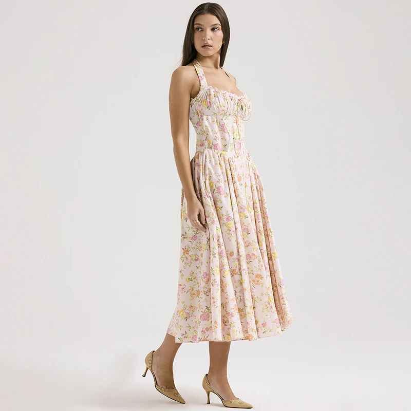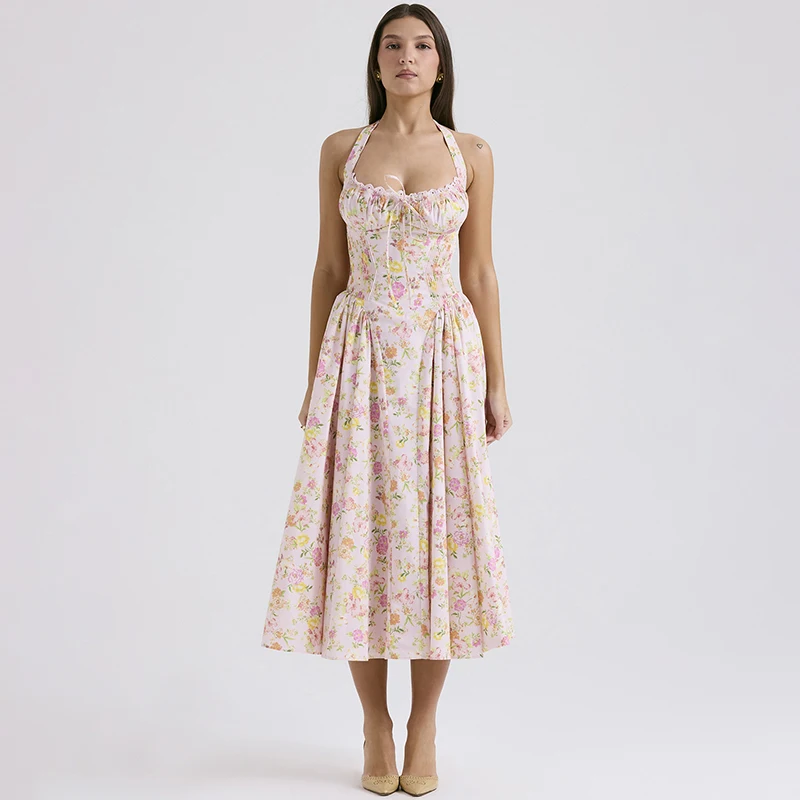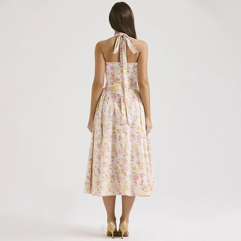 Fleepmart Floral Print Backless Halter Dress Woman Elegant Casual Square Collar Sleeveless Beachwear Sexy Summer Clothing Dress
