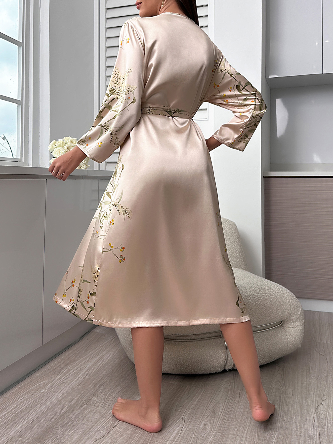 fleepmart Floral Print Night Robe Elegant Long Sleeve V Neck Robe With Belt Women’s Sleepwear