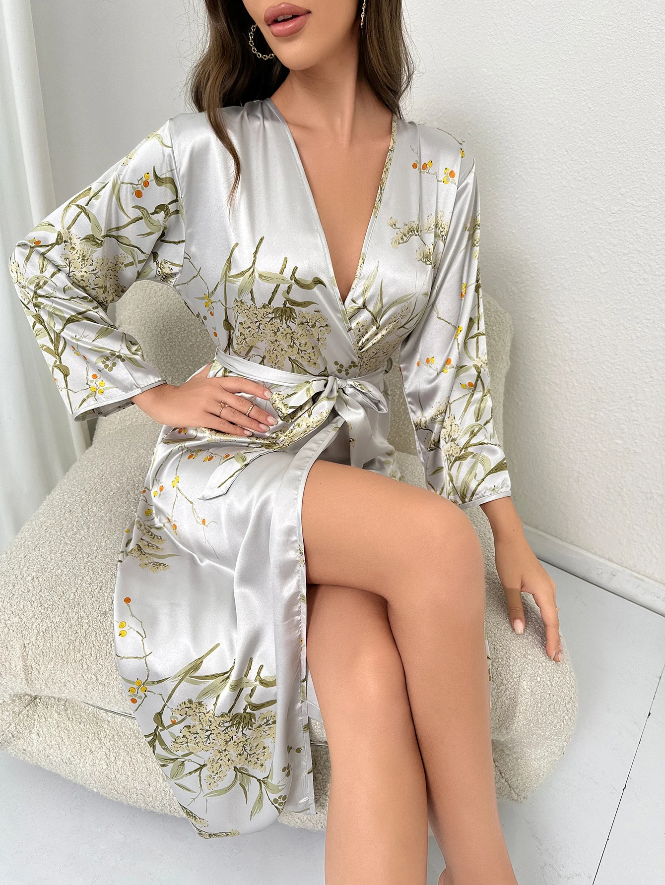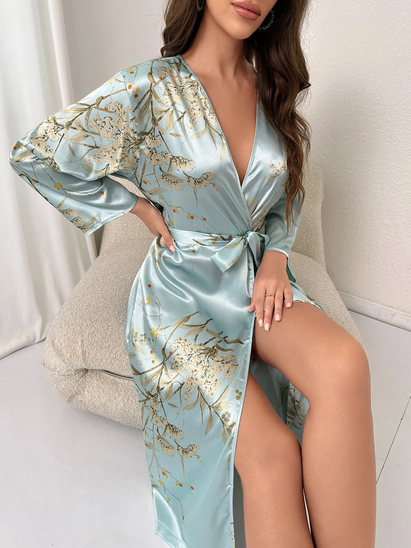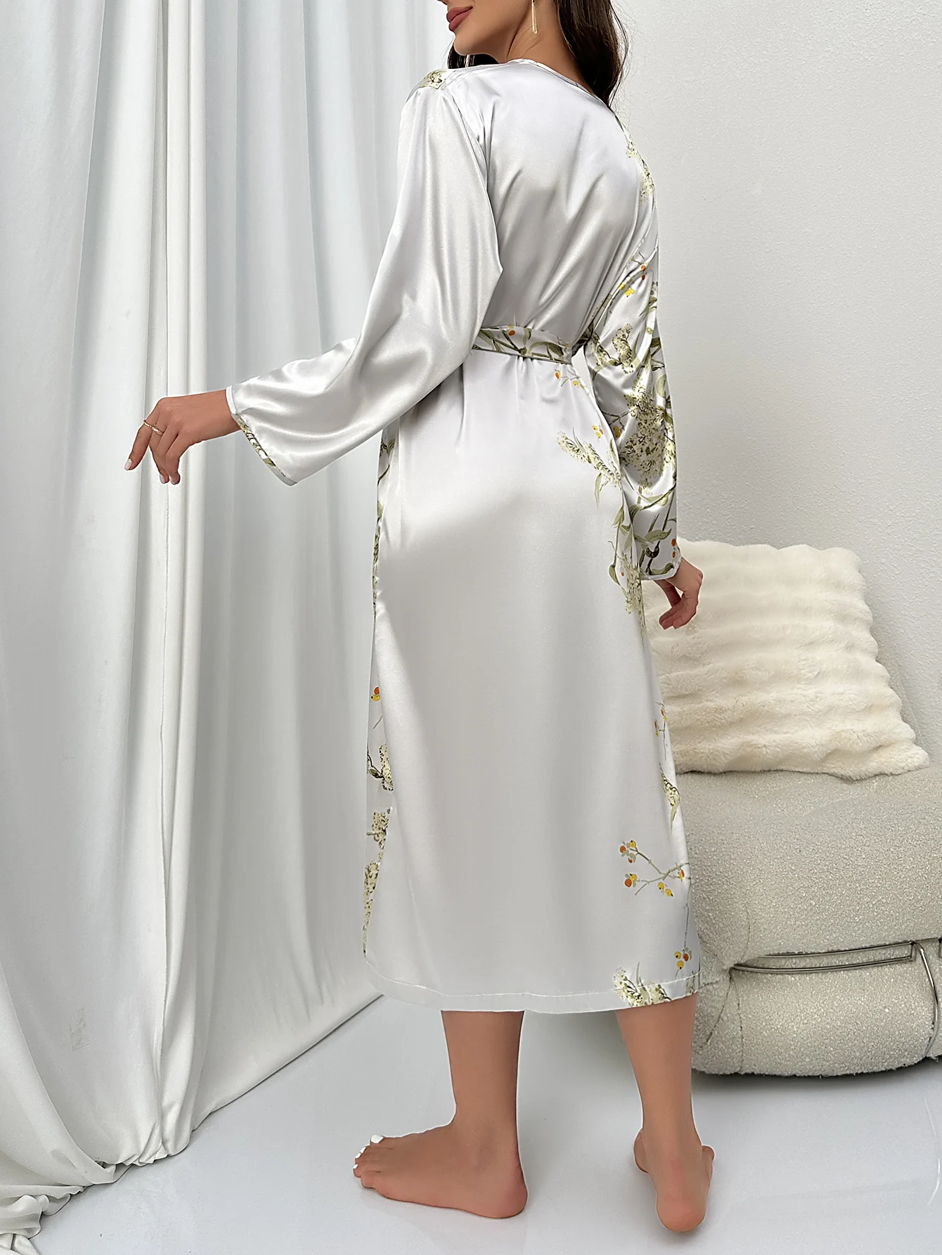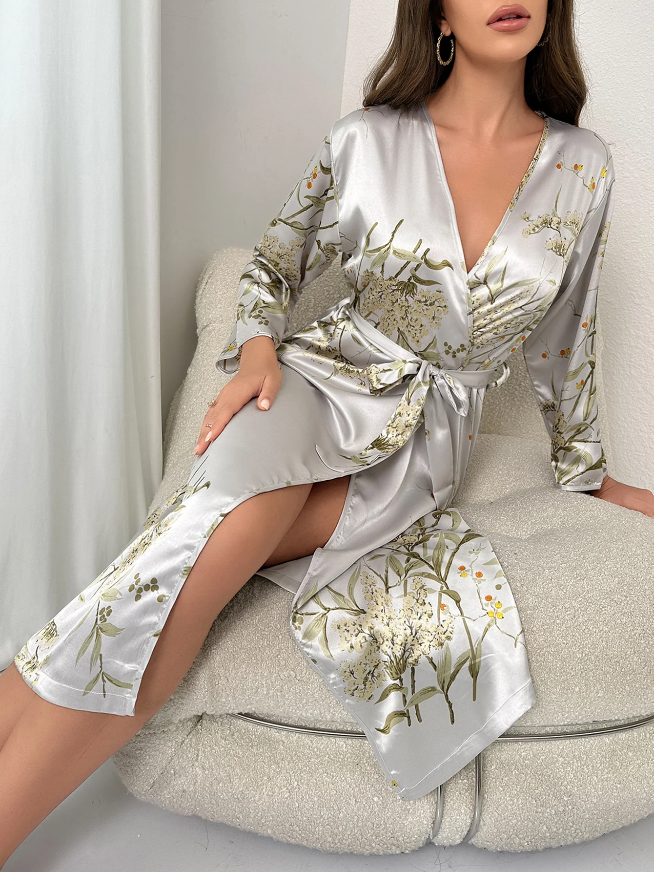 fleepmart Floral Print Night Robe Elegant Long Sleeve V Neck Robe With Belt Women’s Sleepwear