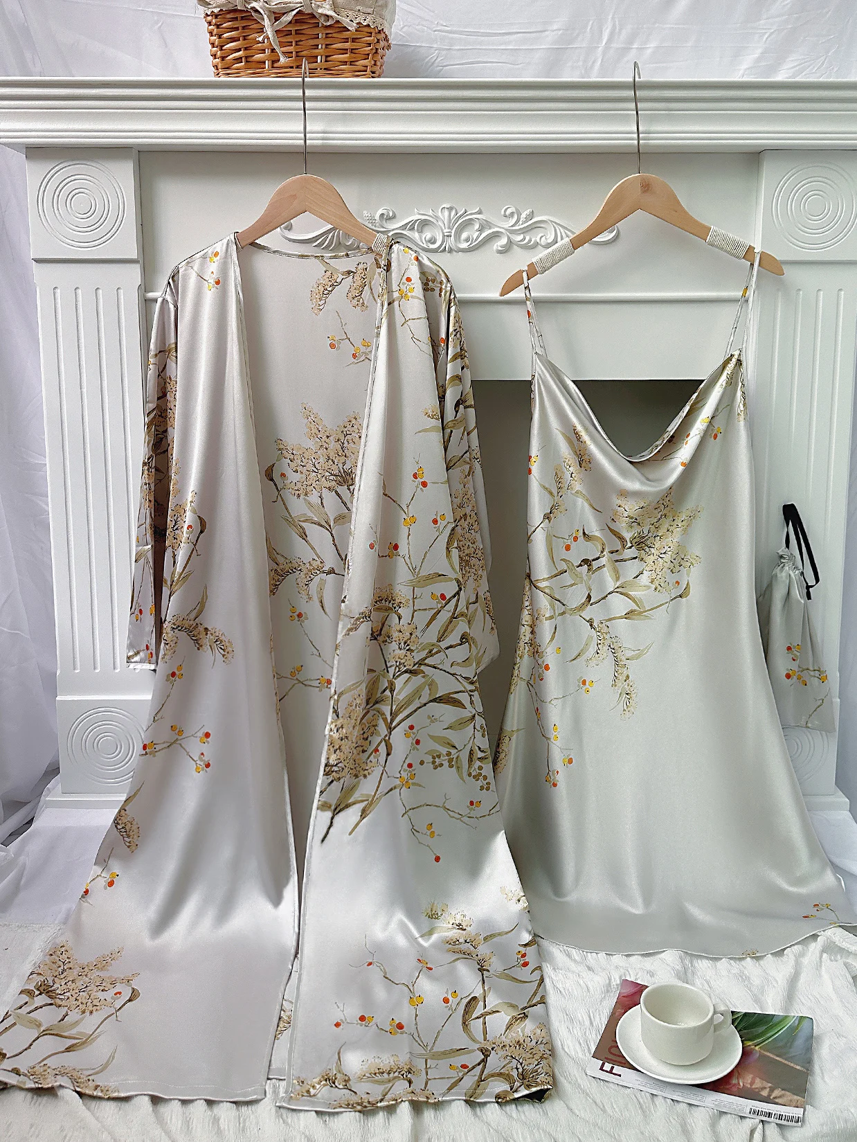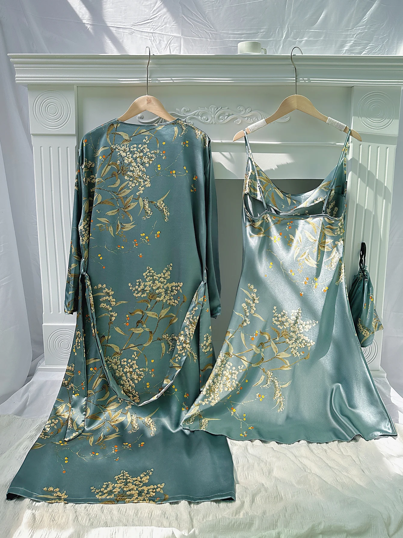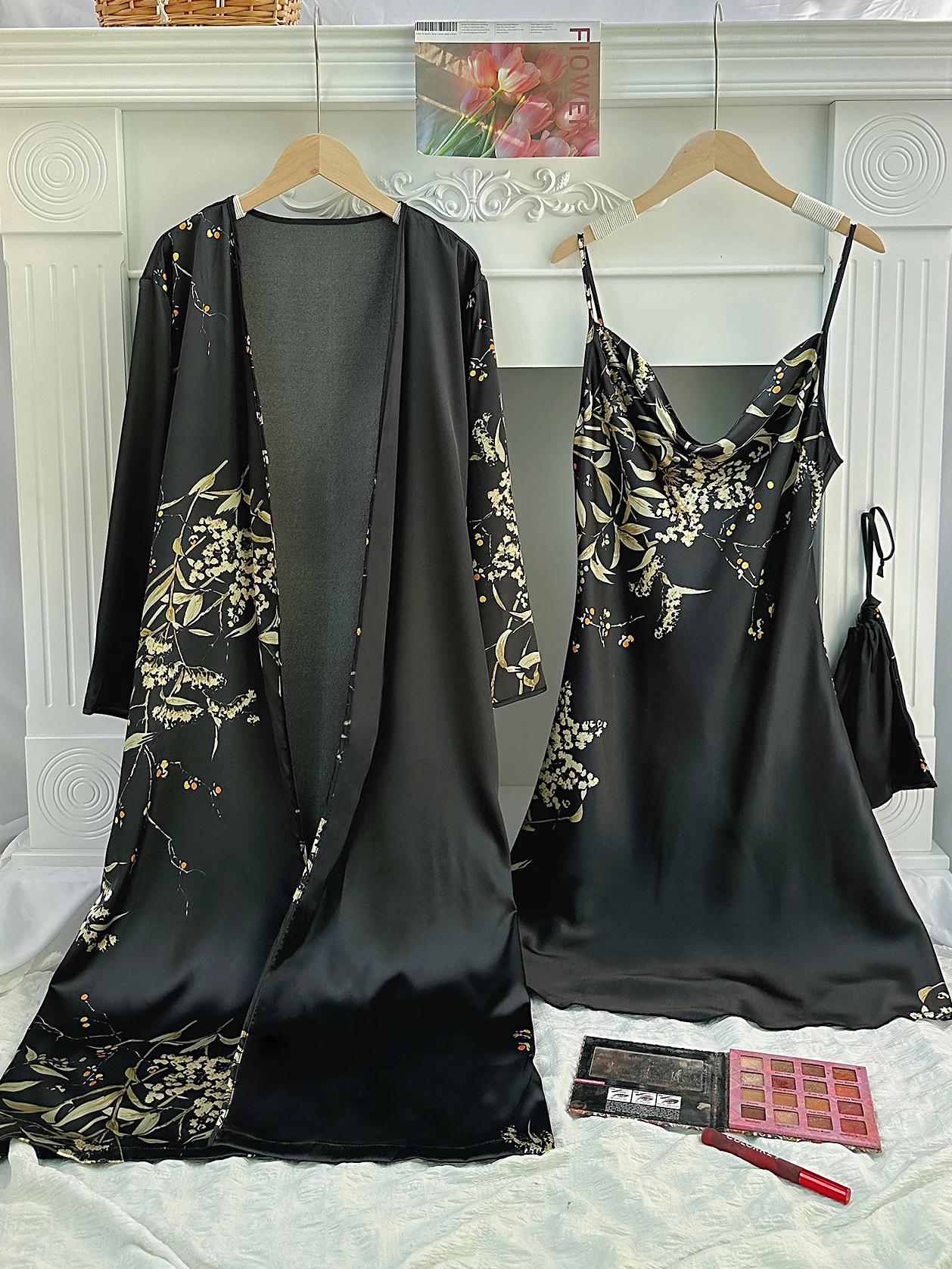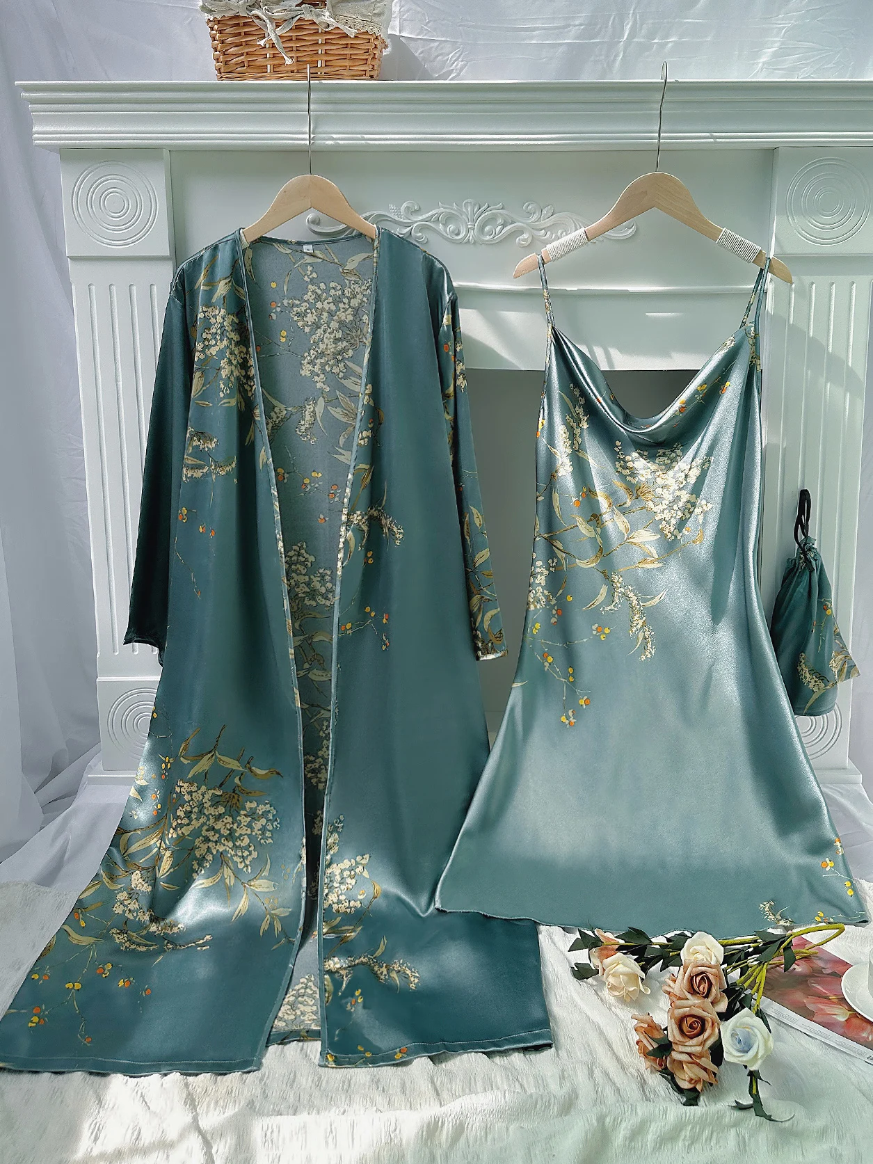 fleepmart Floral Print Pajama Set Long Sleeve Robe With Belt V Neck Slip Dress Women’s Sleepwear Loungewear
