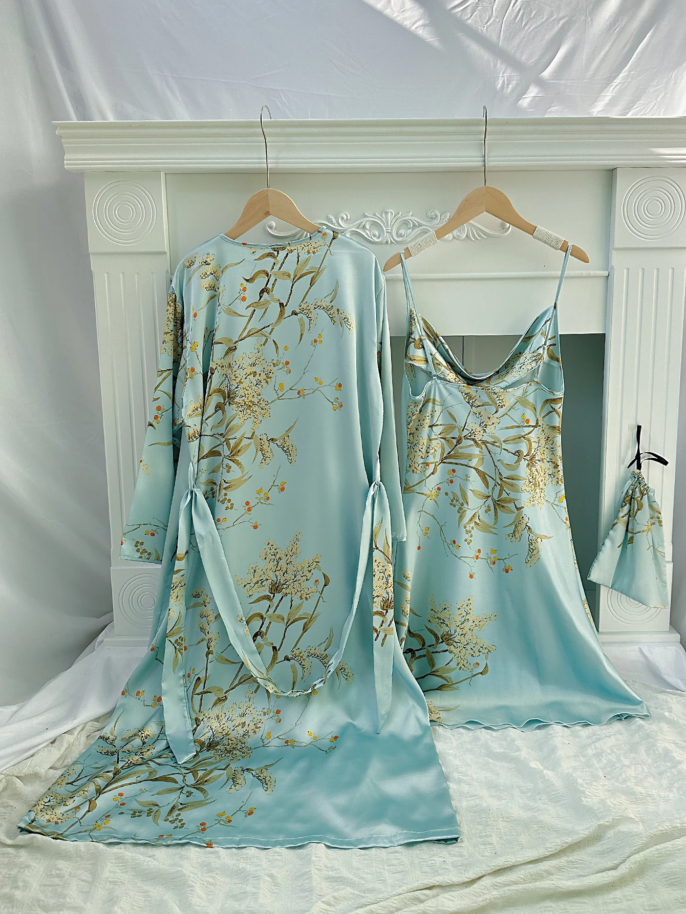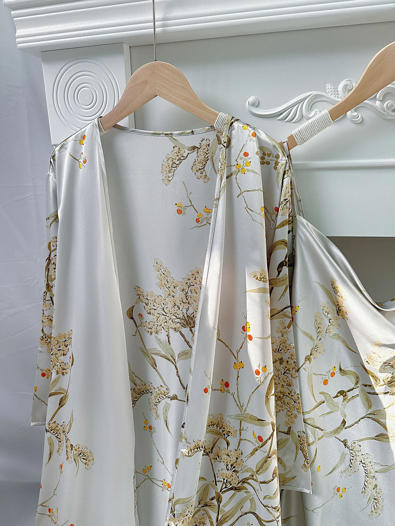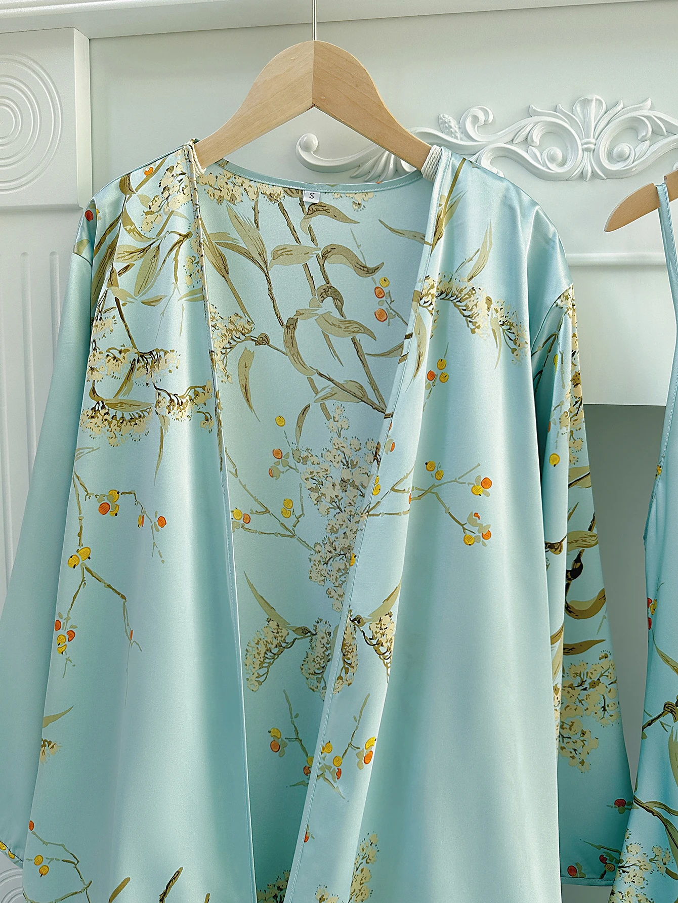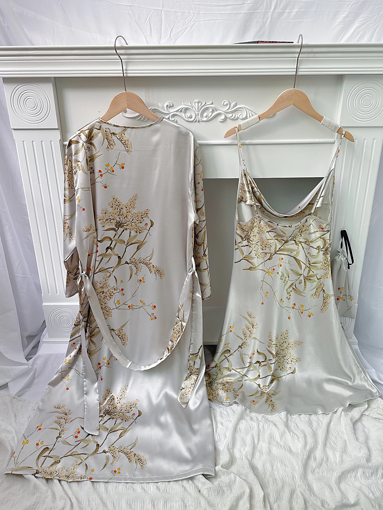 fleepmart Floral Print Pajama Set Long Sleeve Robe With Belt V Neck Slip Dress Women’s Sleepwear Loungewear