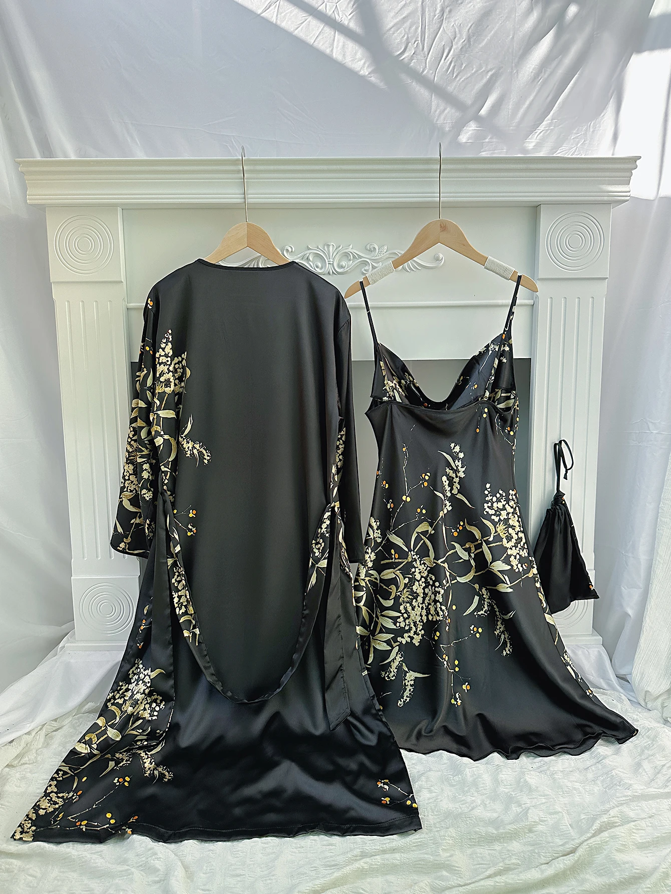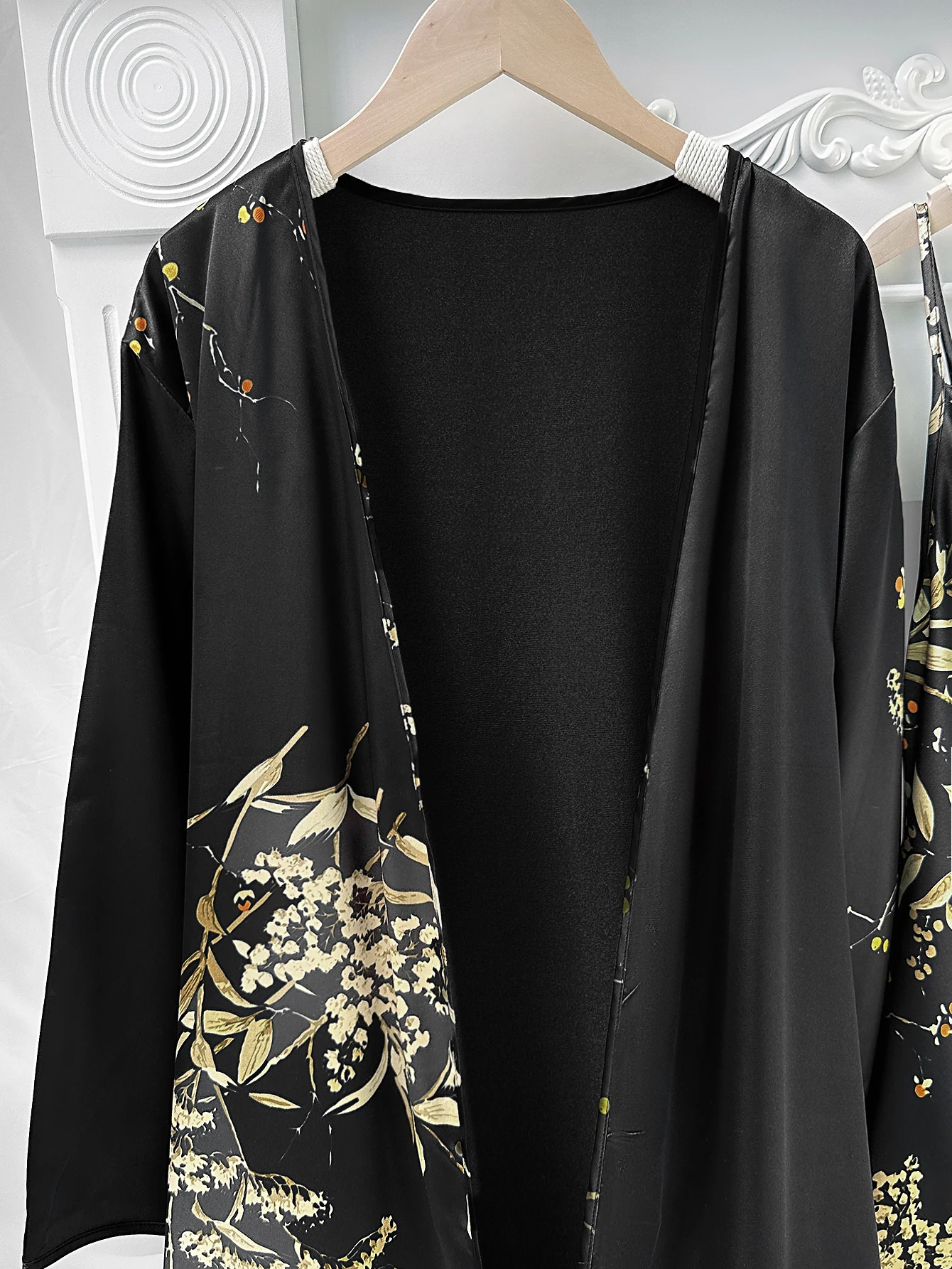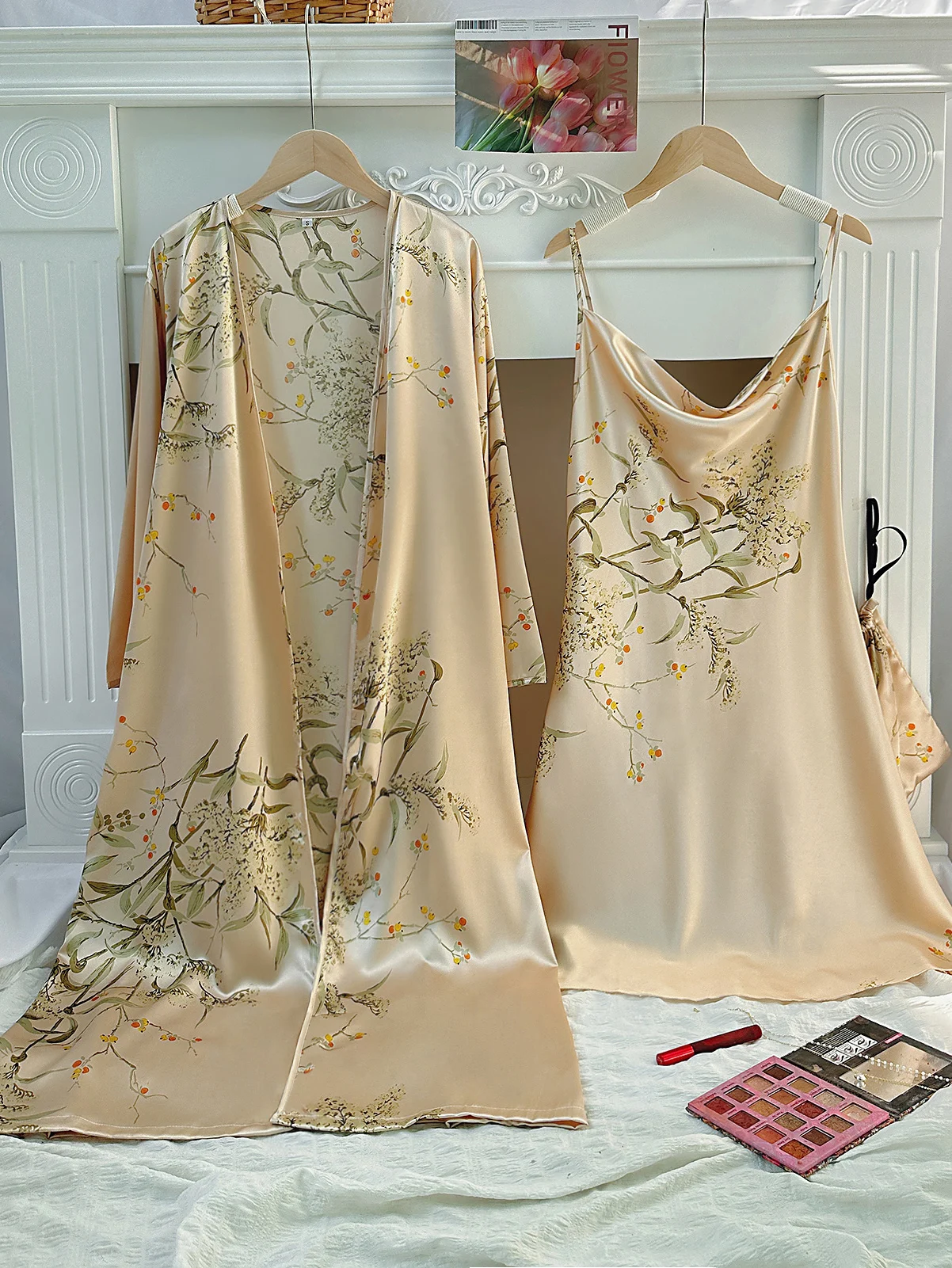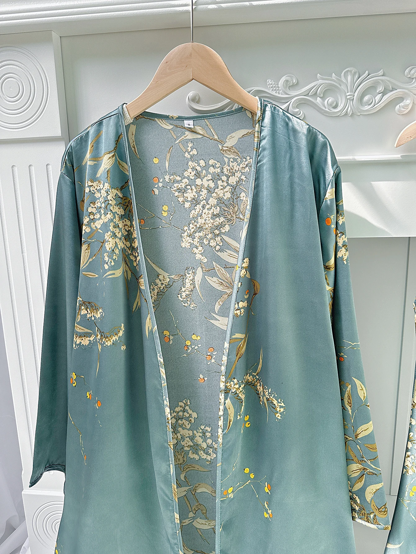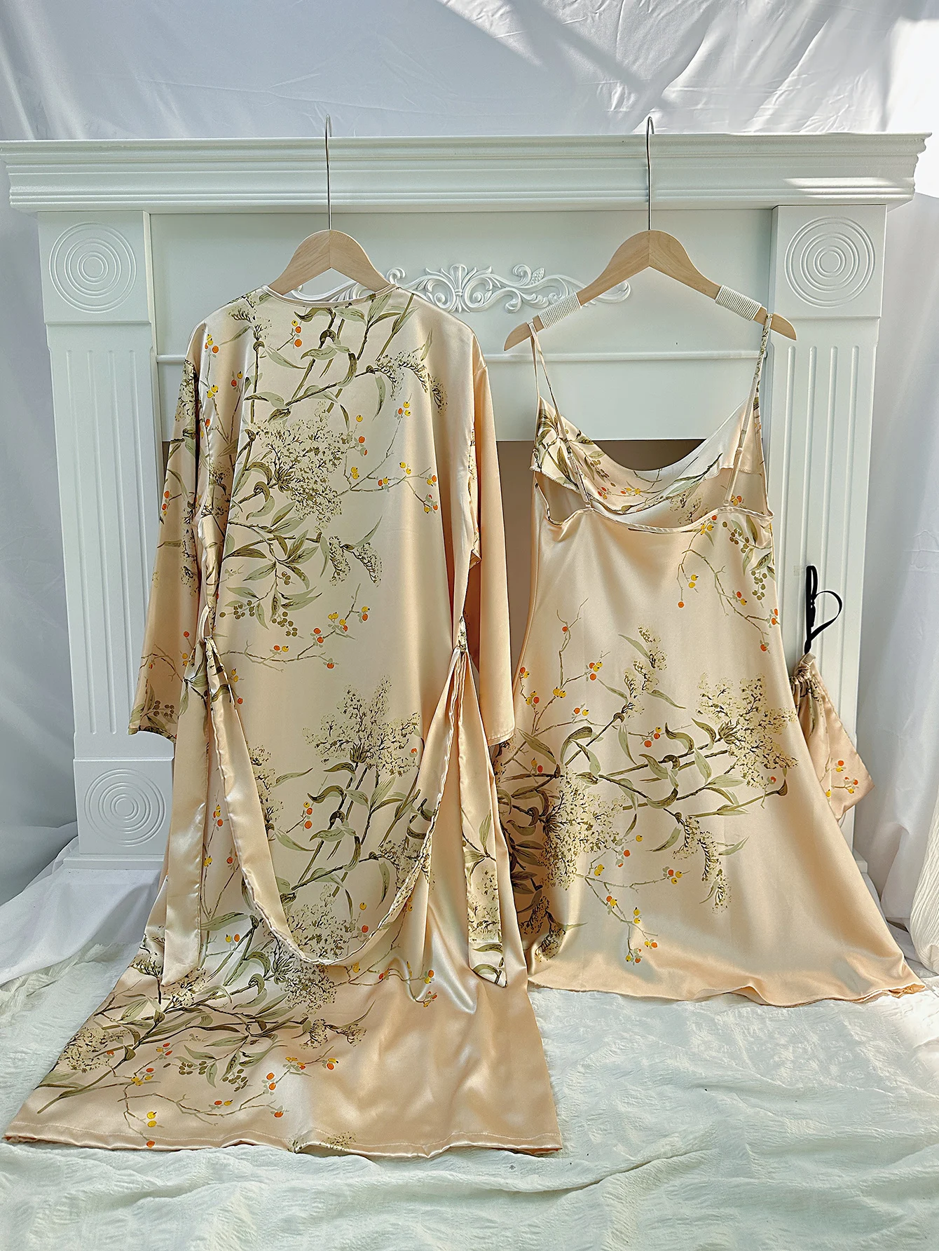 fleepmart Floral Print Pajama Set Long Sleeve Robe With Belt V Neck Slip Dress Women’s Sleepwear Loungewear