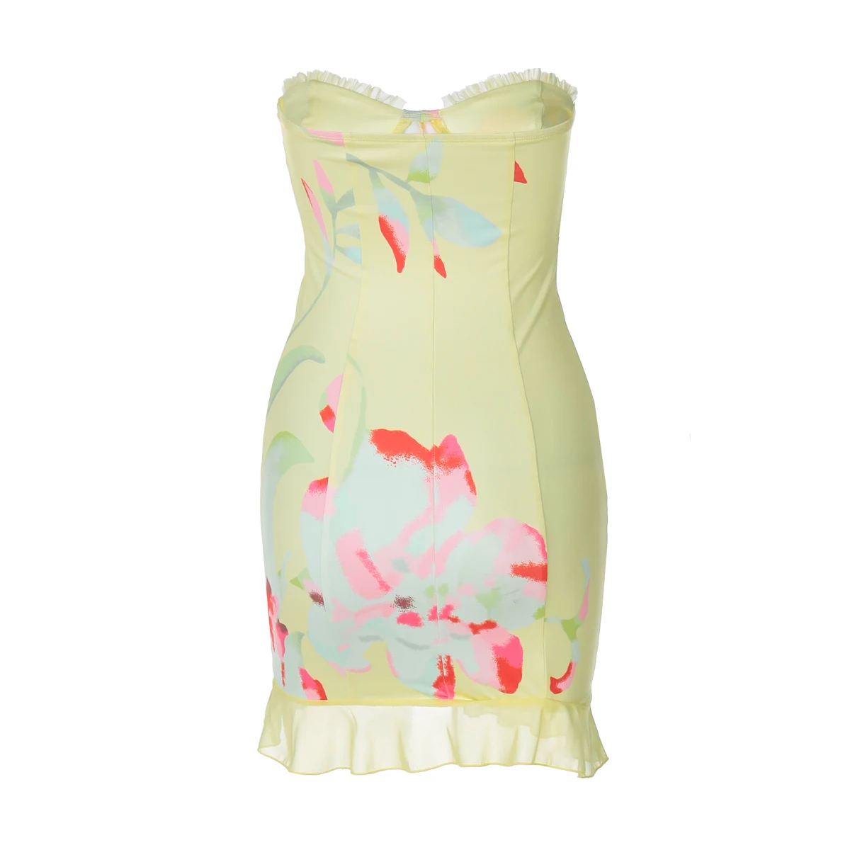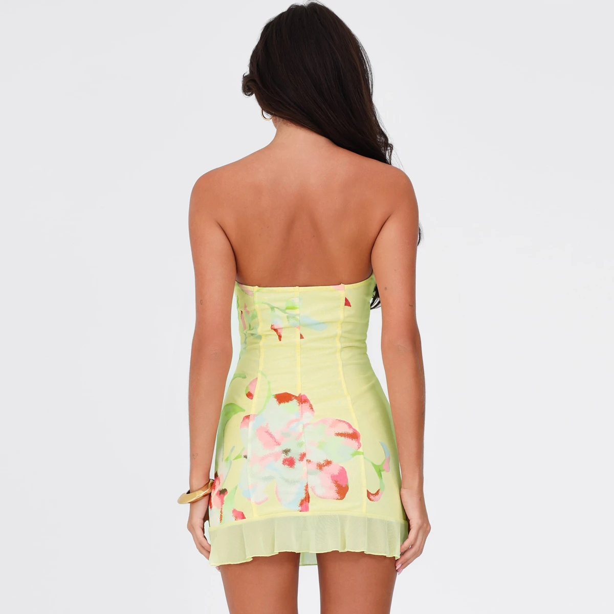 Fleepmart Floral Print Ruffles Strapless Elegant Sexy Slim Cute Mini Dress Summer Women Fashion Outfits Beach Festival Birthday