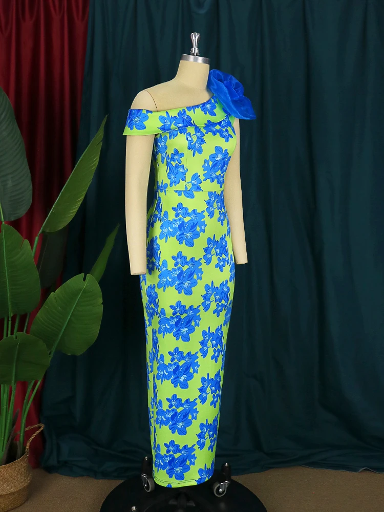 Fleepmart Floral Printed Long Dresses One Shoulder Blue Elegant Prom Dress Gowns Cocktail Evening Party Outfits with Flower 2022