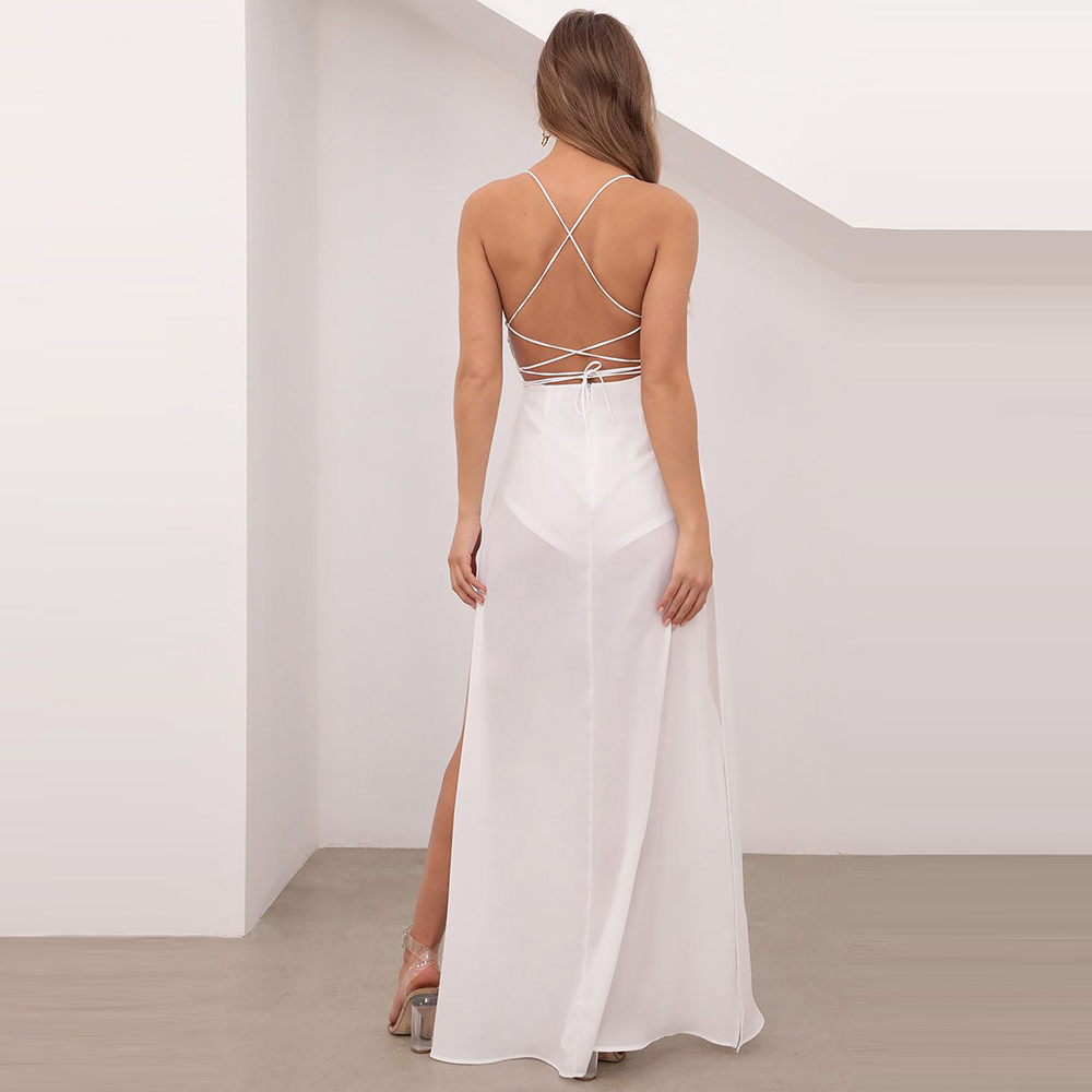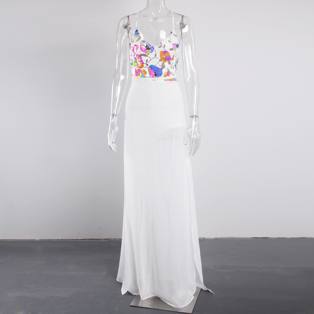 Fleepmart Floral Sequin White Chiffon Maxi Dress 2 Split Tie Straps Lace Up Backless Floor Length Summer Party Holiday Beachwear 2021 NEW