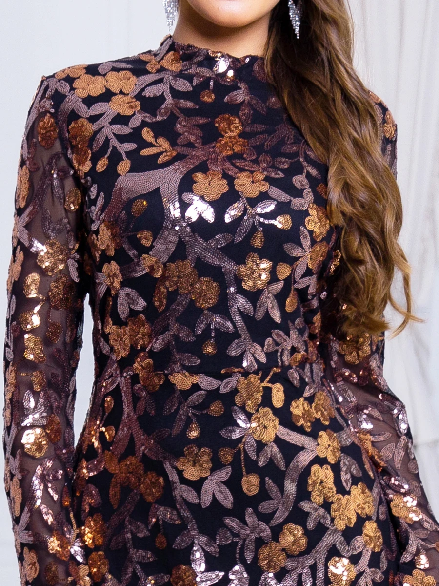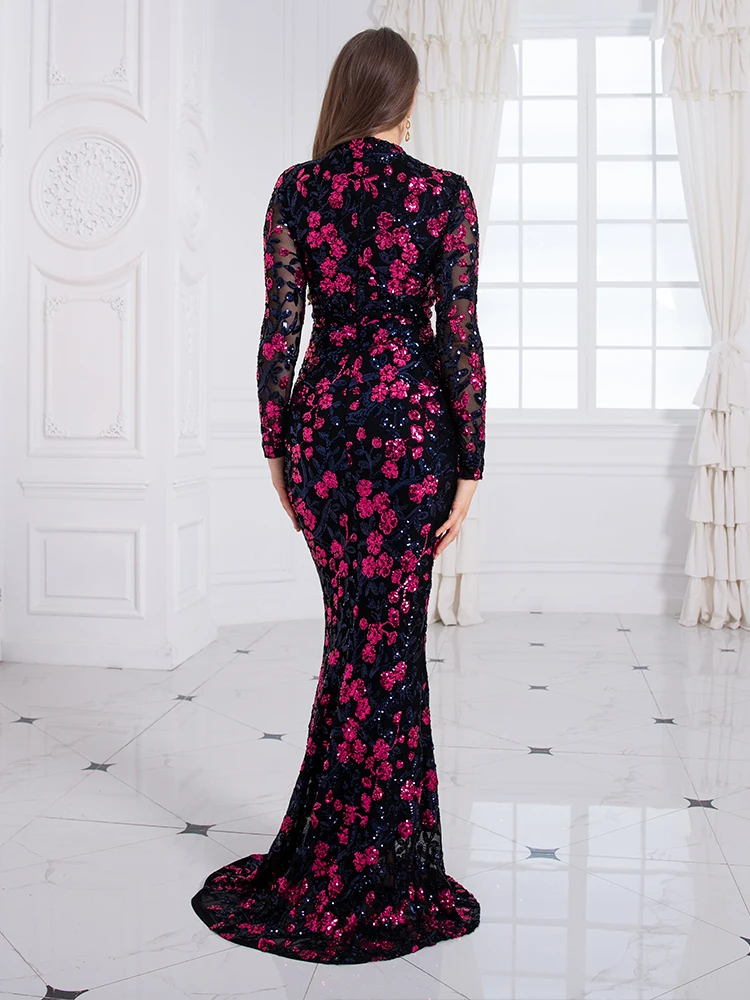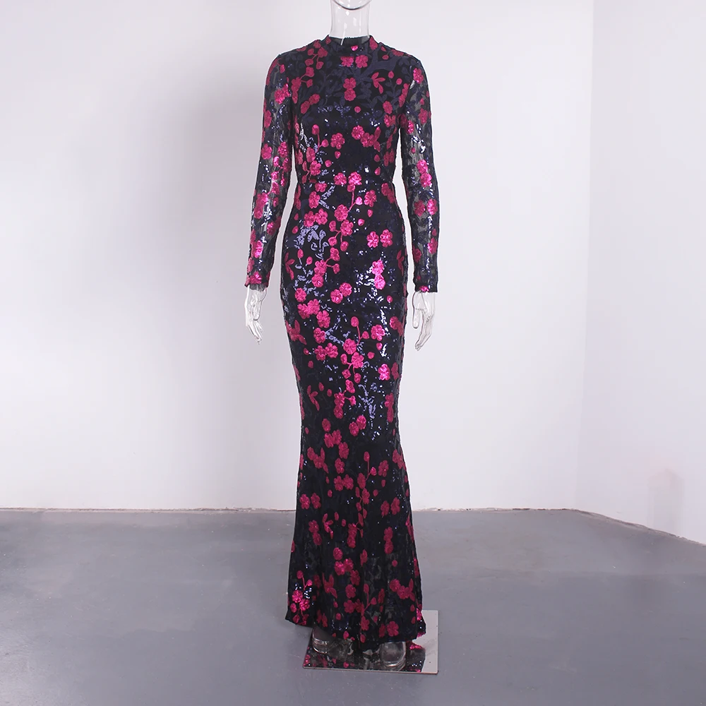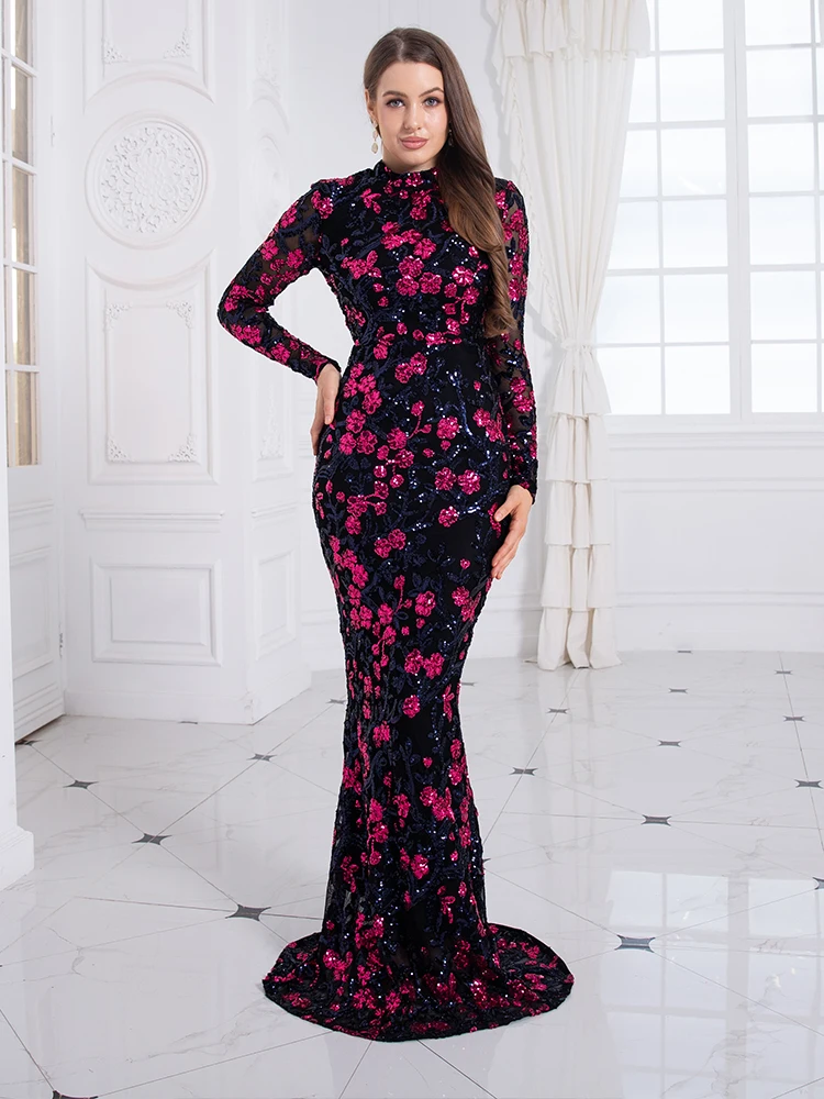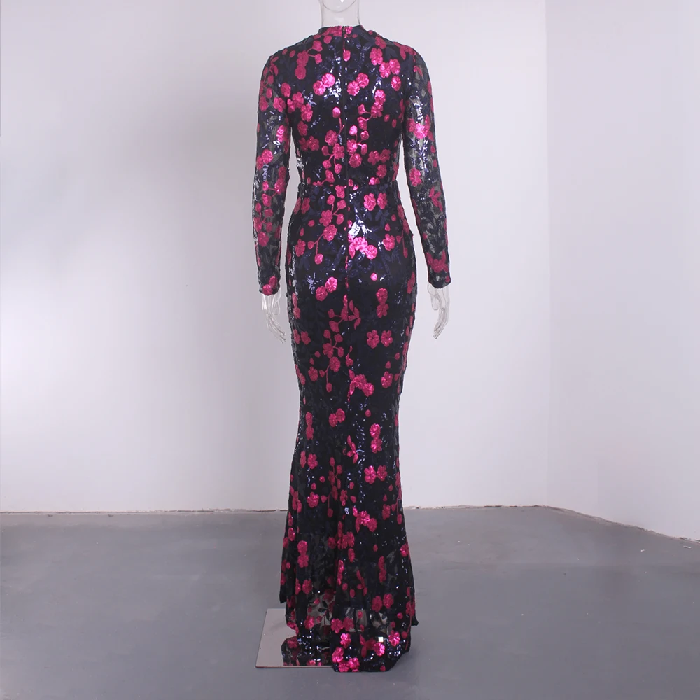 fleepmart Floral Stretch Sequined Long Sleeve Evening Night Party Dress Floor Length O Neck Elegant Prom DressThere are no reviews yet
