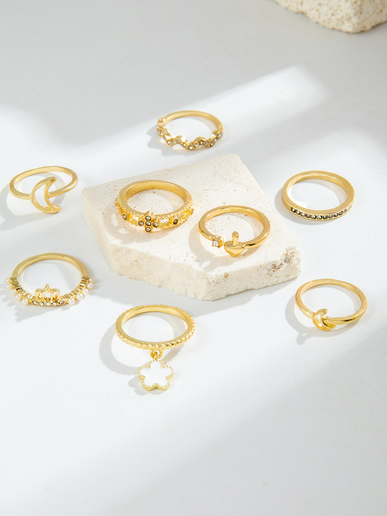 Fleepmart Flower Finger Ring Sets for Women Simple Crescent Moon Metal HollowPoint Drill Jewelry Party Anillos 8Pcs/Set